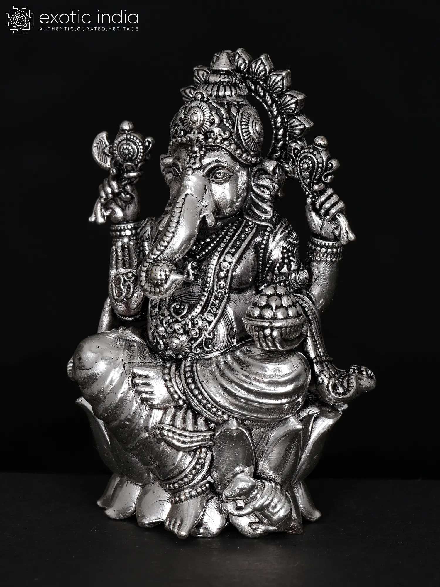 A beautifully delineated lotus is the throne of Ganesha, who is adorned with an exquisite crown, the mark of Trishula (a symbol of Shiva and Parvati, his divine parents), intricate ornaments, and dhoti.