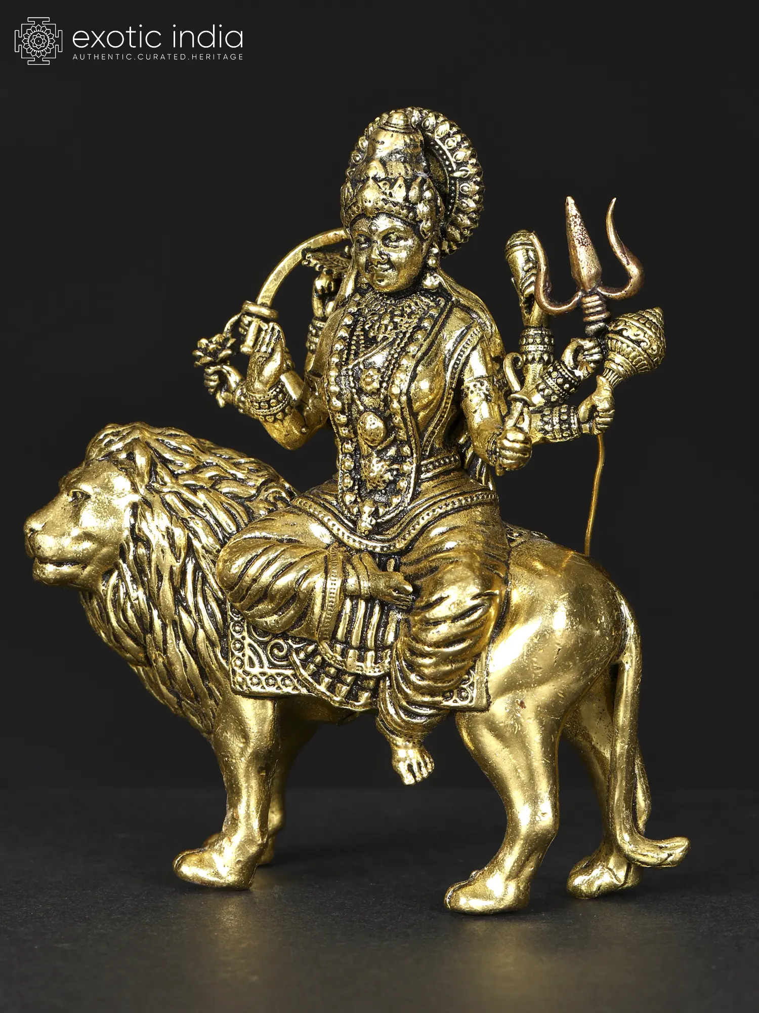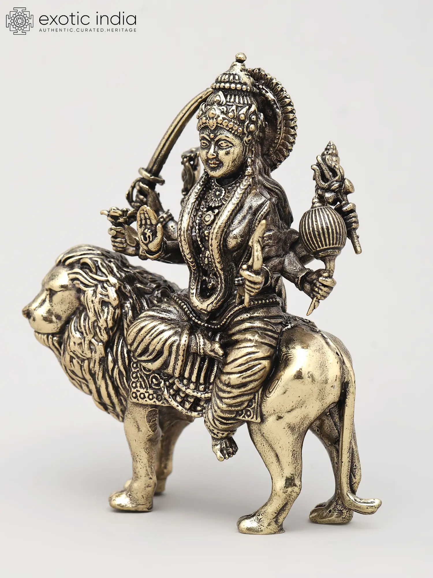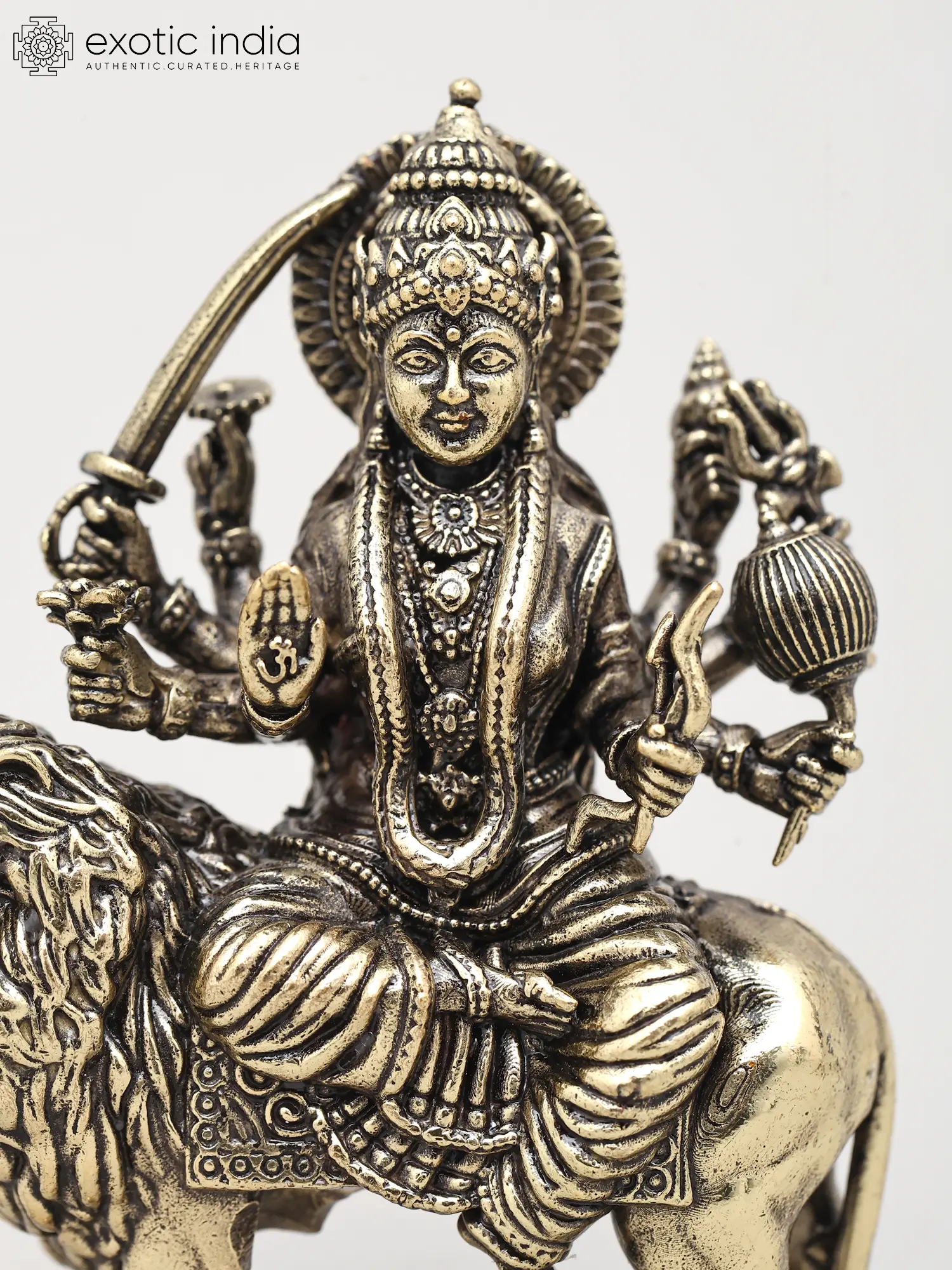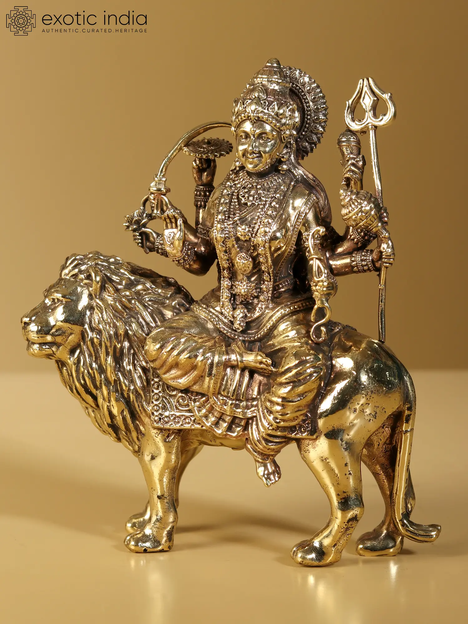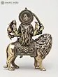 This ornate brass Durga statue, depicts Devi in her warrior’s form, in her Ashtabhuja or eight-armed roopa. She is adorned by a lovely saree and exquisite ornaments which are delineated with a mesmerizing detail. Sitting on the back of a Solomon and tranquil lion, Devi Durga smiles blissfully, filling the aura with her celestial presence.