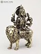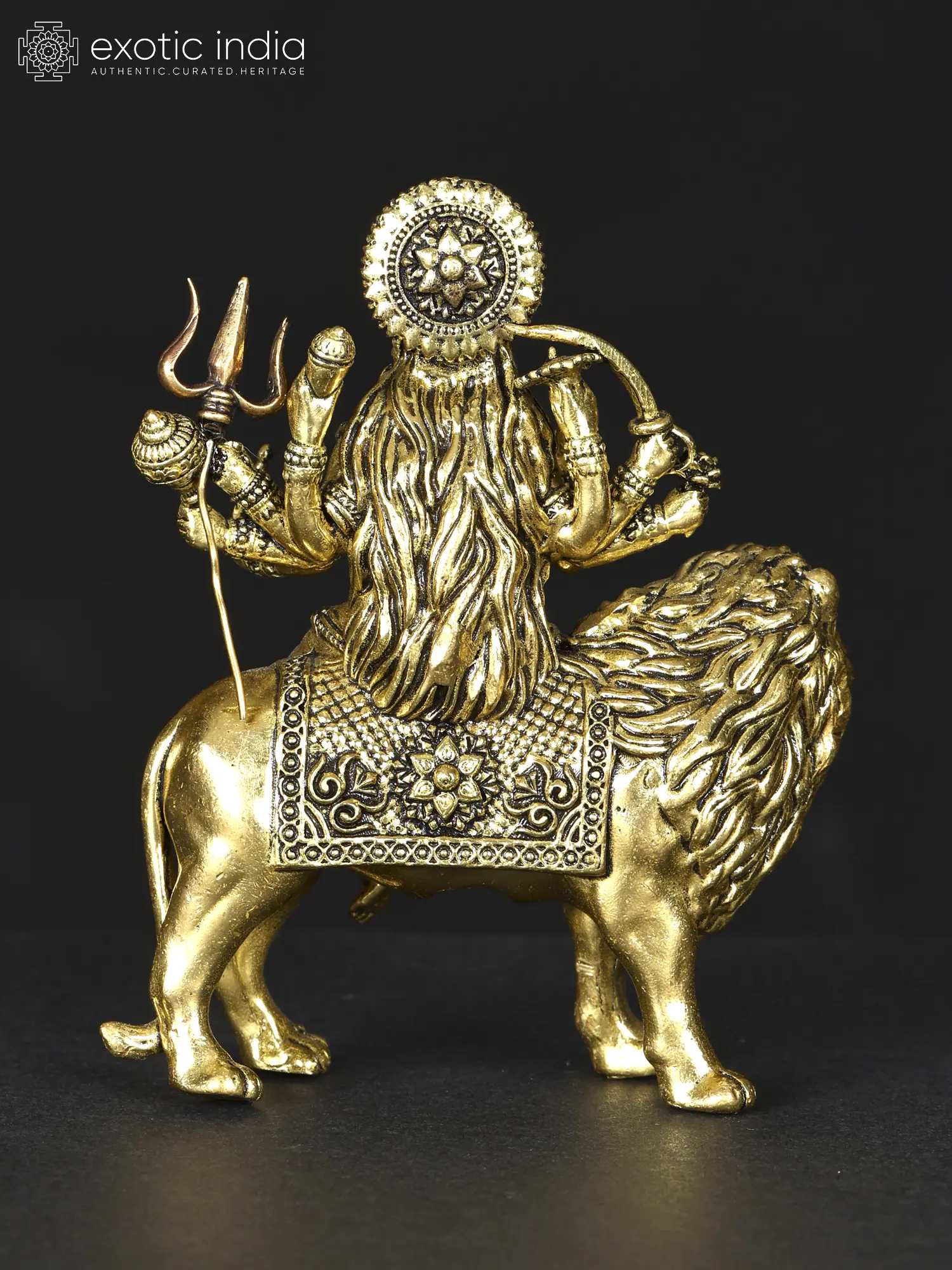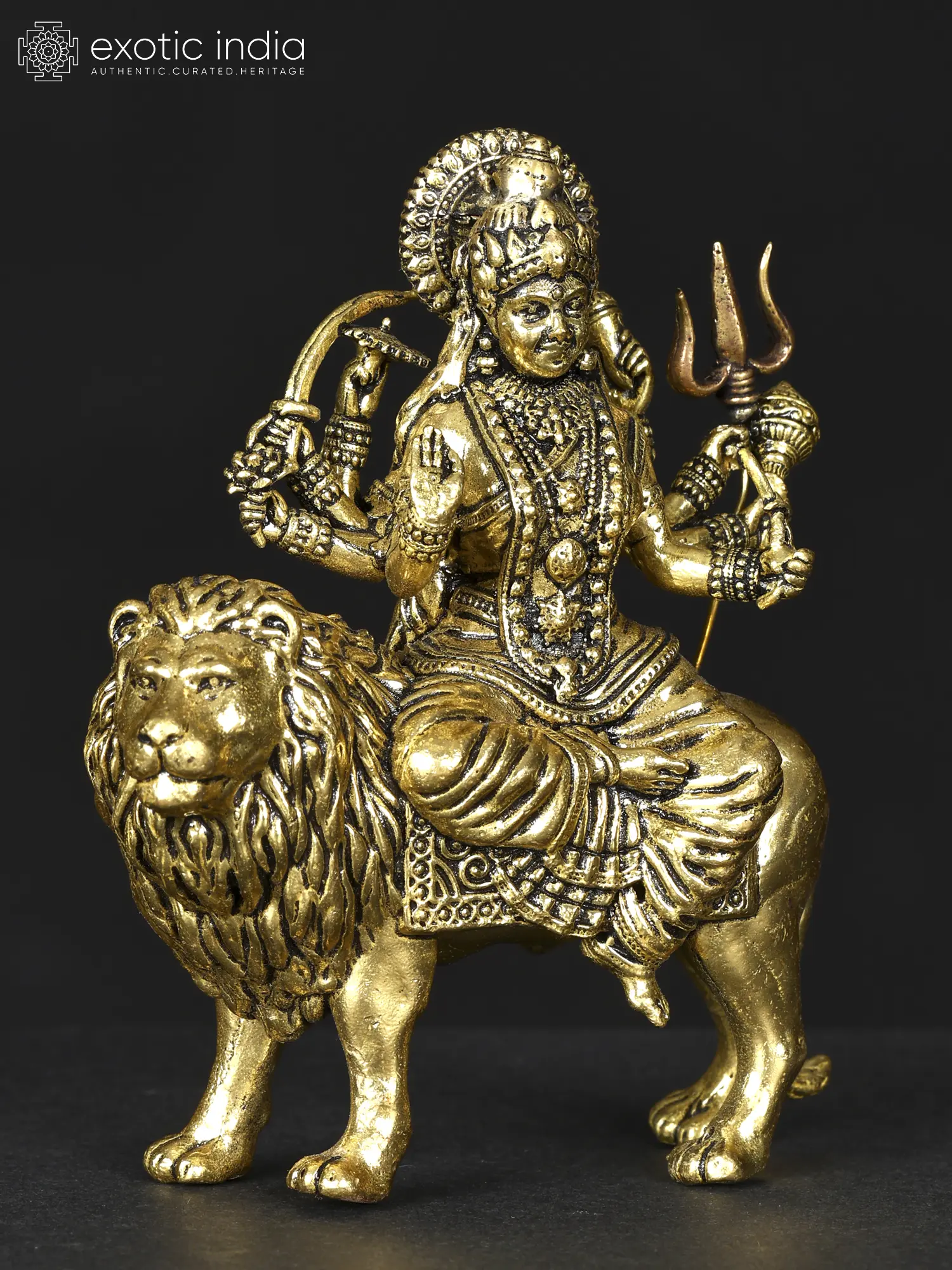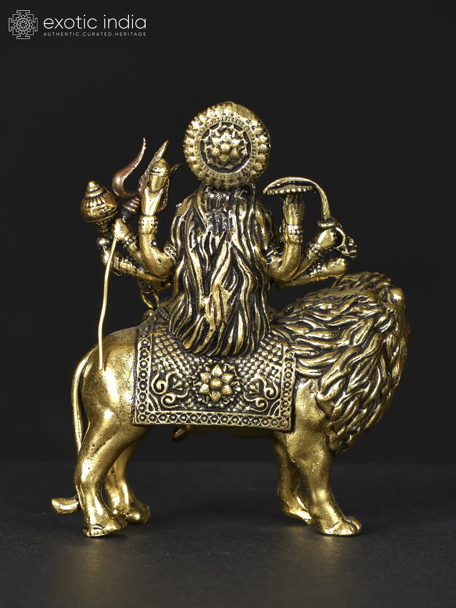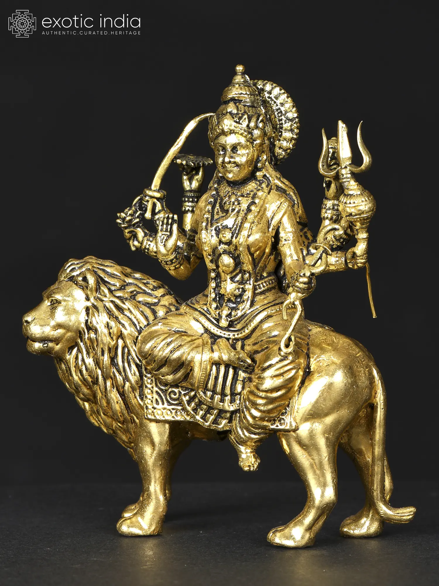 This ornate brass Durga statue, depicts Devi in her warrior’s form, in her Ashtabhuja or eight-armed roopa. She is adorned by a lovely saree and exquisite ornaments which are delineated with a mesmerizing detail. Sitting on the back of a Solomon and tranquil lion, Devi Durga smiles blissfully, filling the aura with her celestial presence.