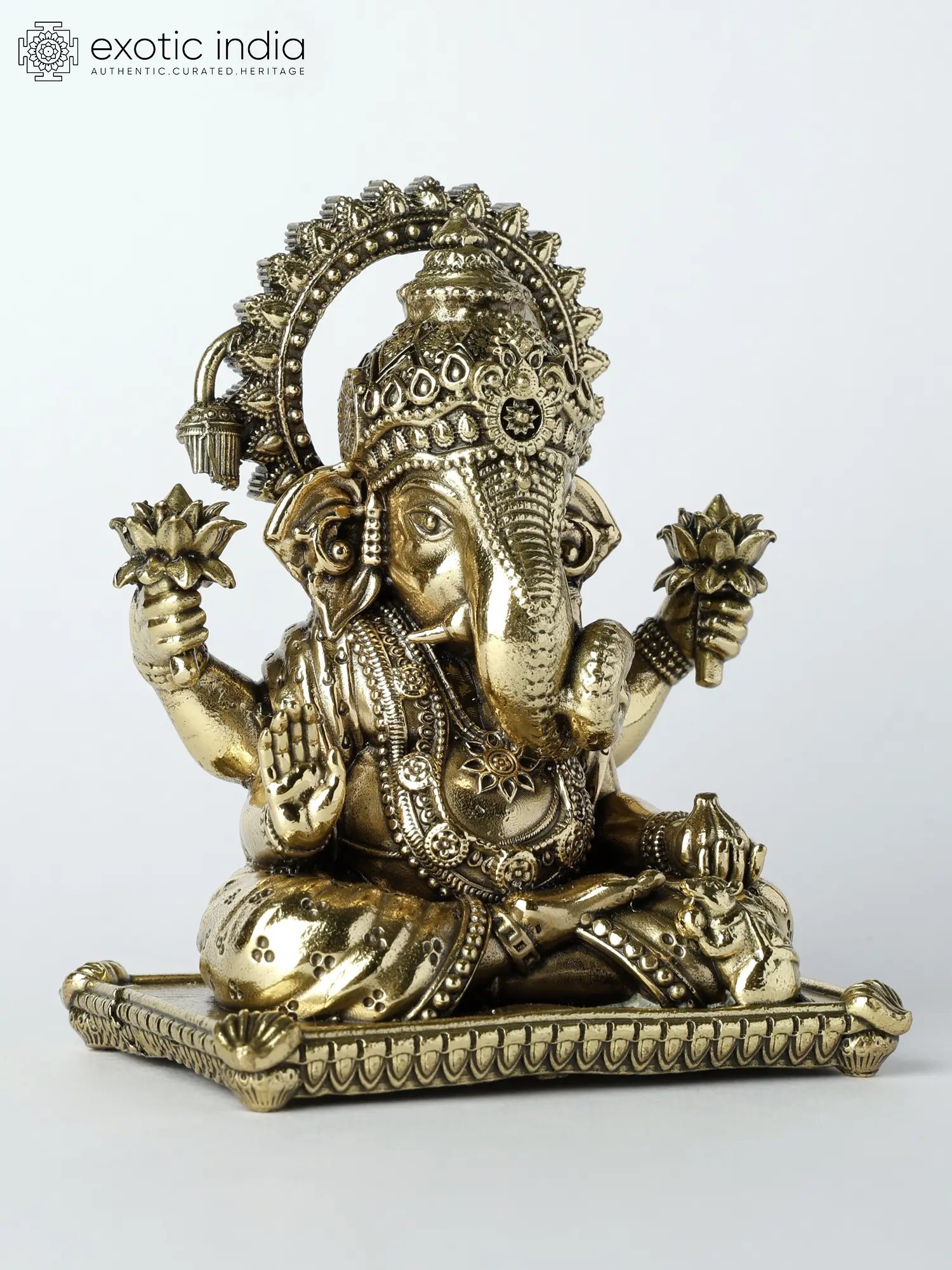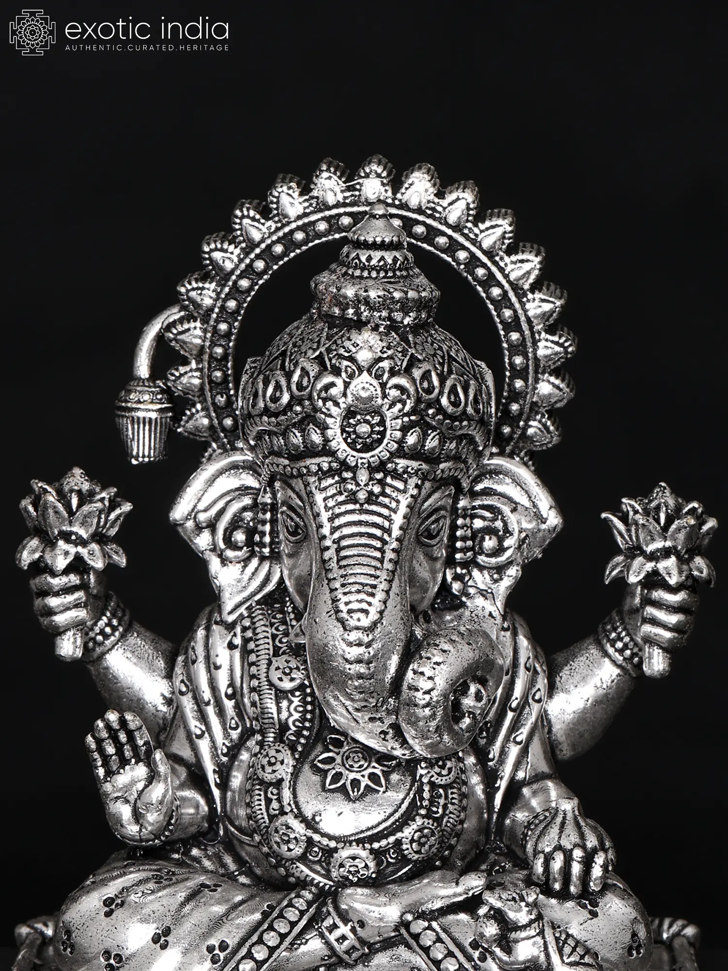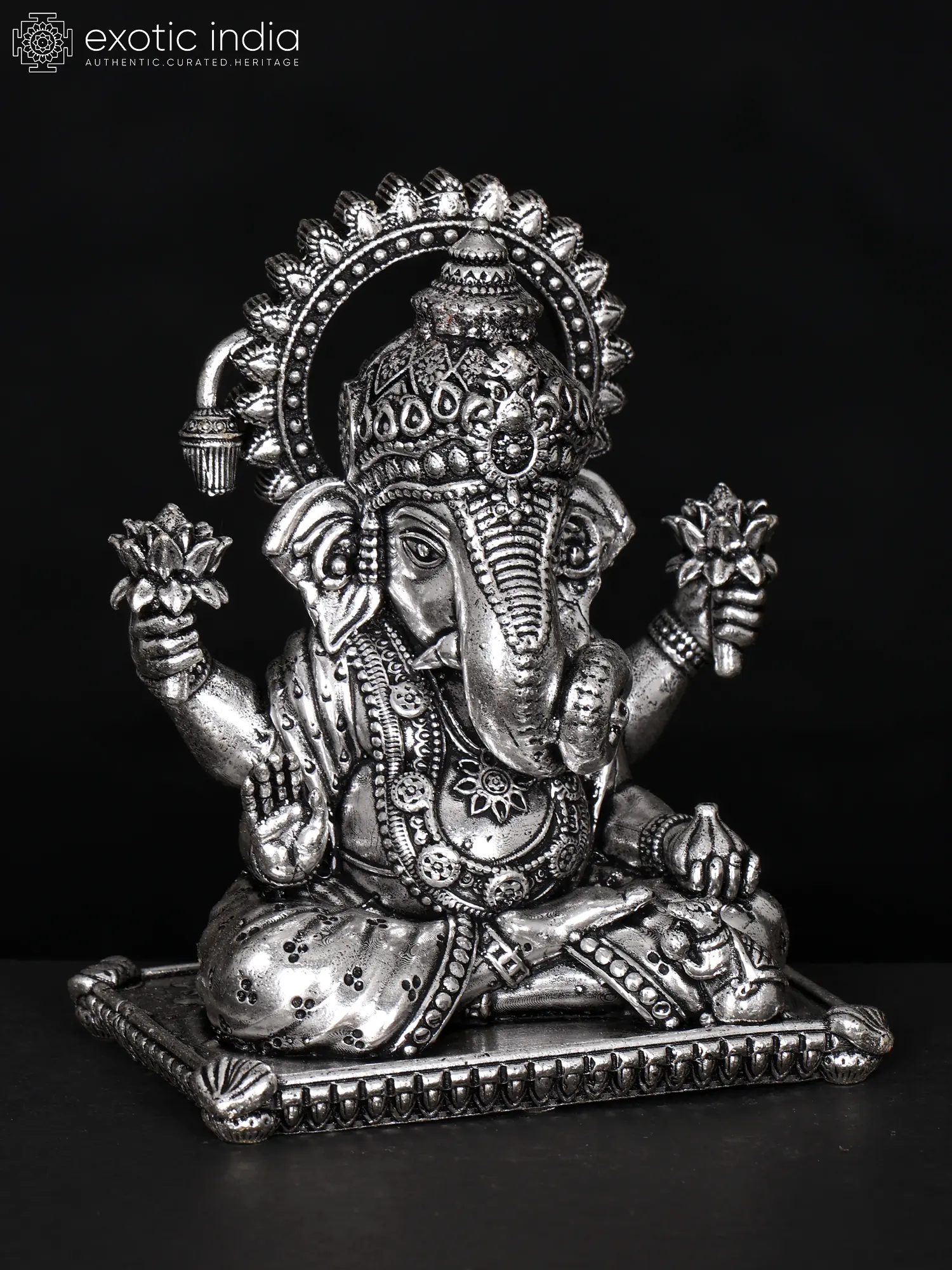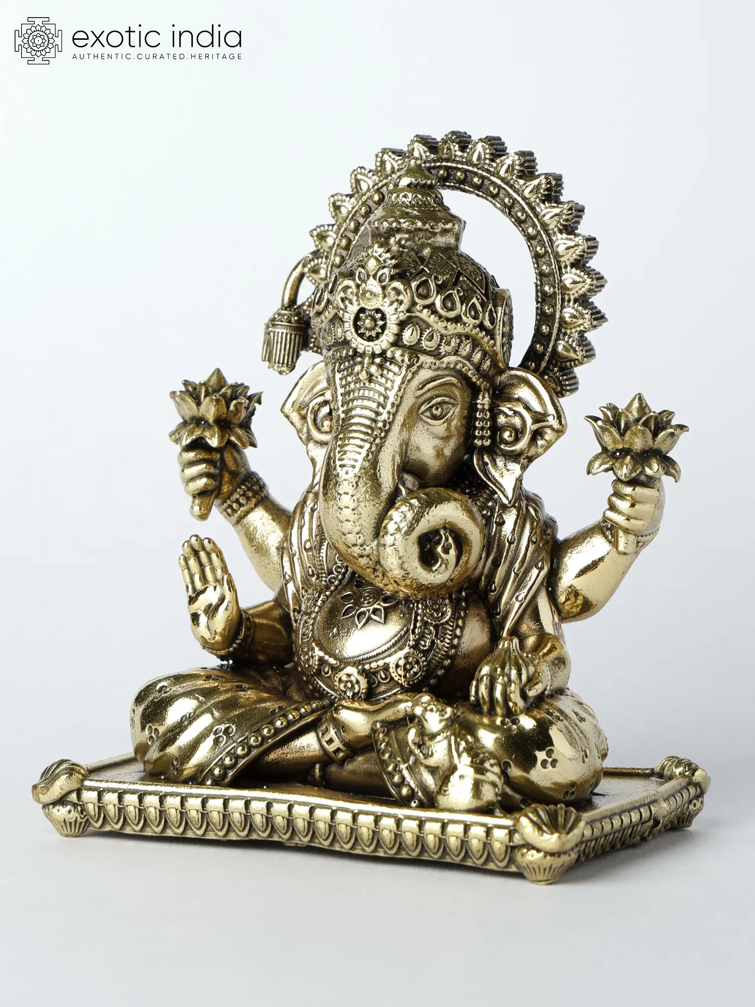 Ganesha sits in Padmasana on a seat, adorned with a unique crown with a tassel and floral aureole.
