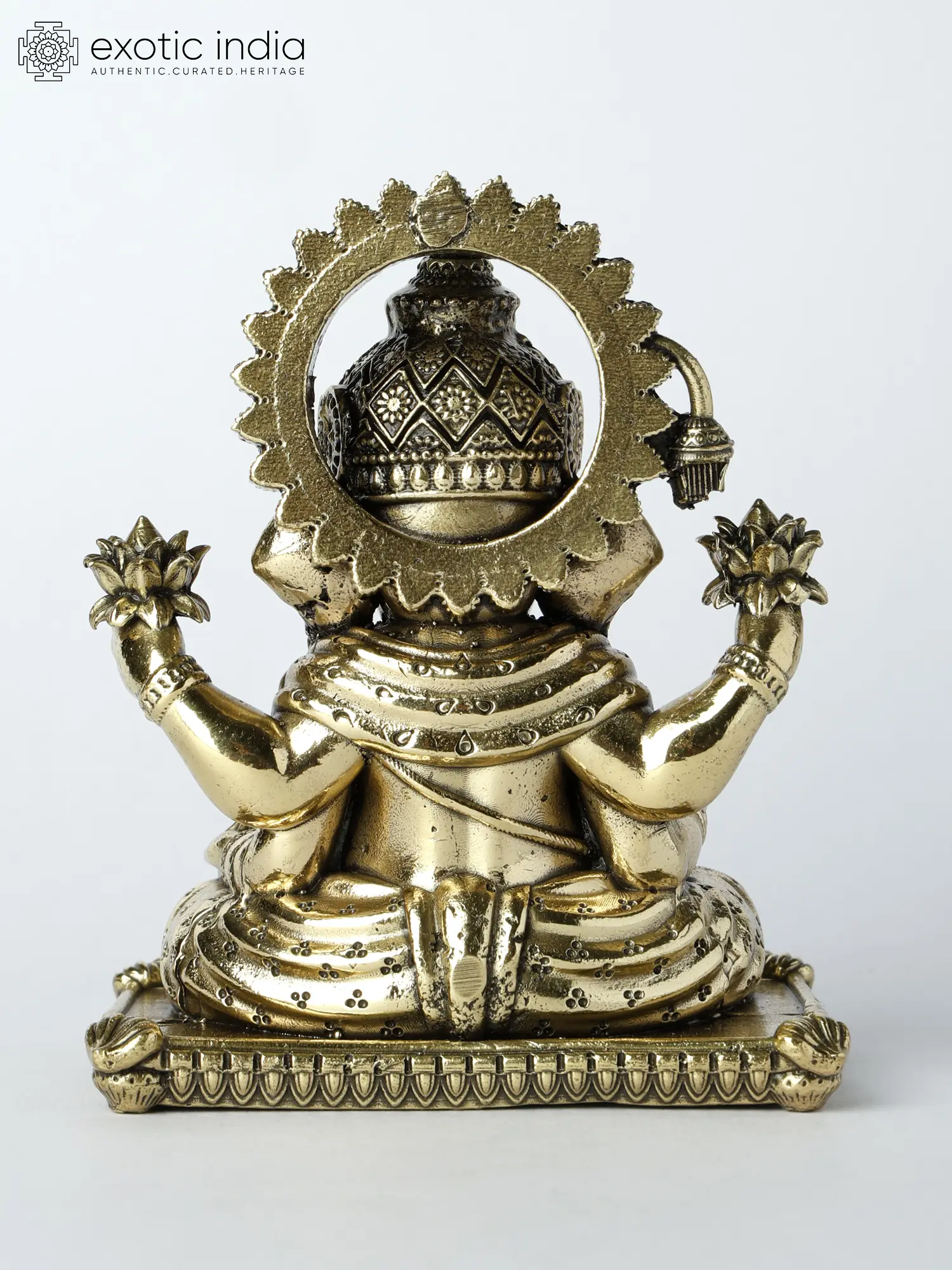 Lotuses in his secondary hands and Modak and the gesture of Abhaya are all depicted with finesse, making this powerful image of Ganesha also an artistically rich image, exemplifying the skills of the brass artists.