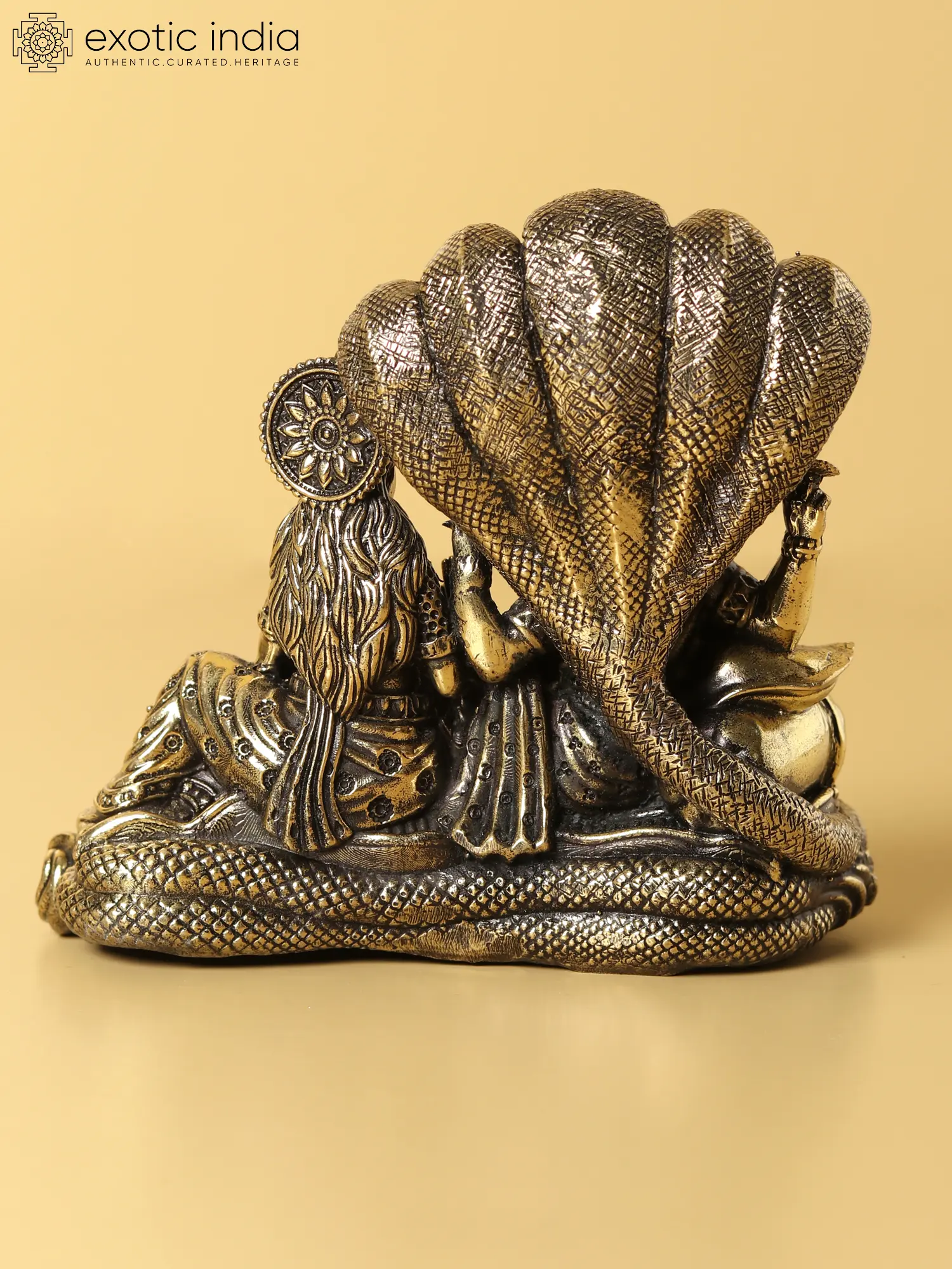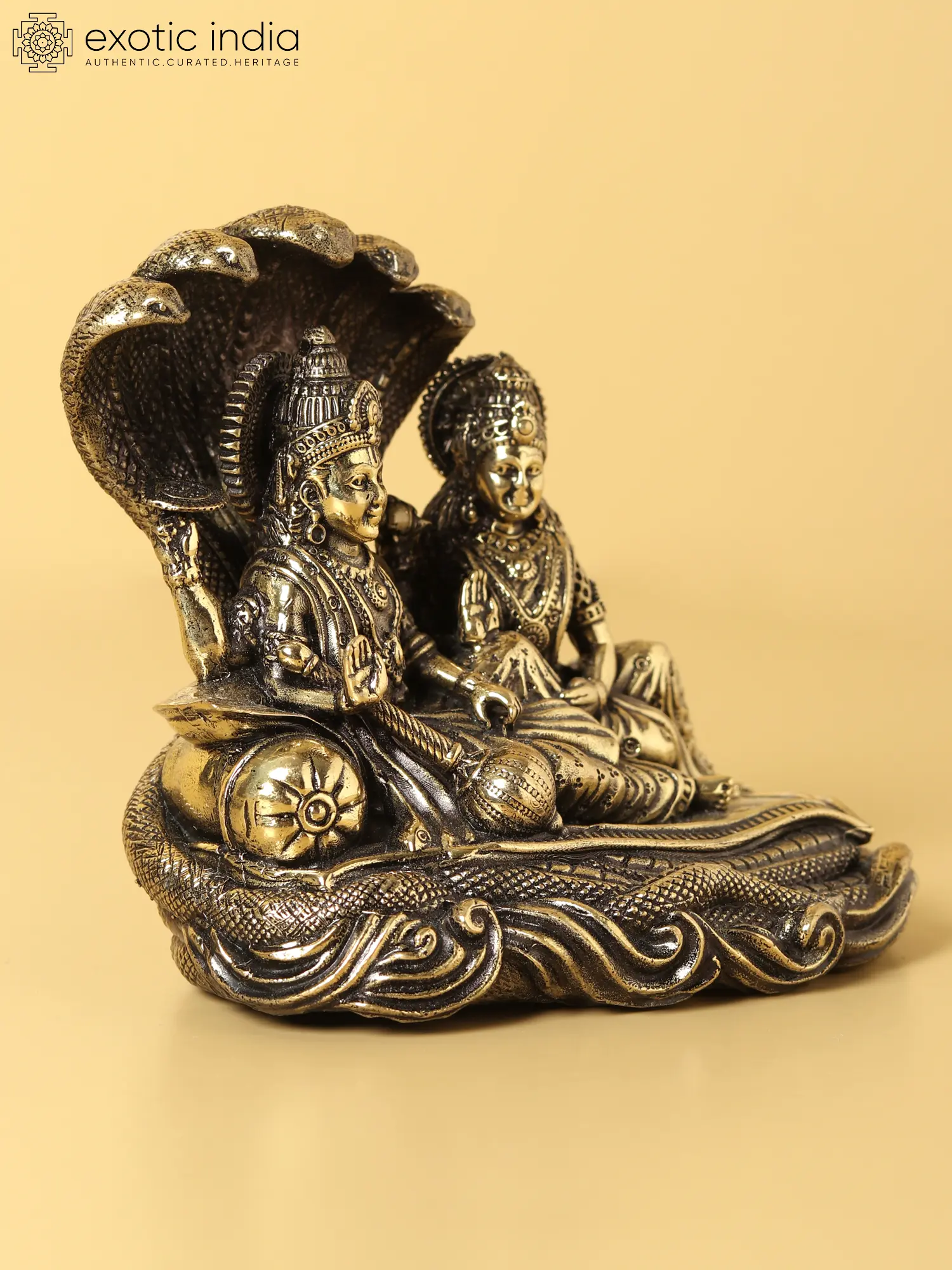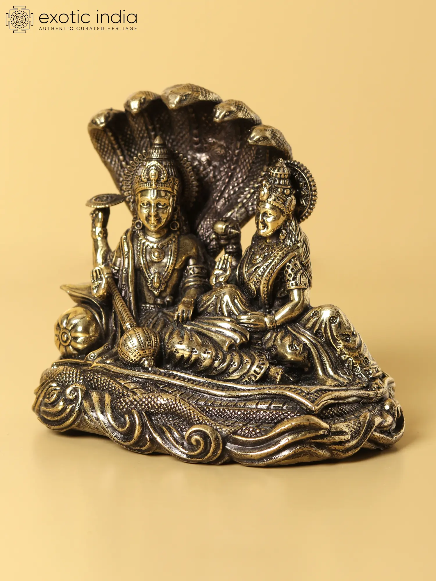 In this superfine brass statue, Vishnu and Lakshmi on the coils of Adishesha are depicted with an aesthetic richness that marvels the eyes and heart. Shaded by the coils of Shesha, Sri Vishnu majestically sits, relaxing against a bolster and extending his lotus feet towards Sri Lakshmi. With finesse, the waves of Ksheersagar and the coils of Shesha are beautifully delineated. Sculpted in a rounded manner, this statue captures the beauty of Vishnu’s abode divinely.