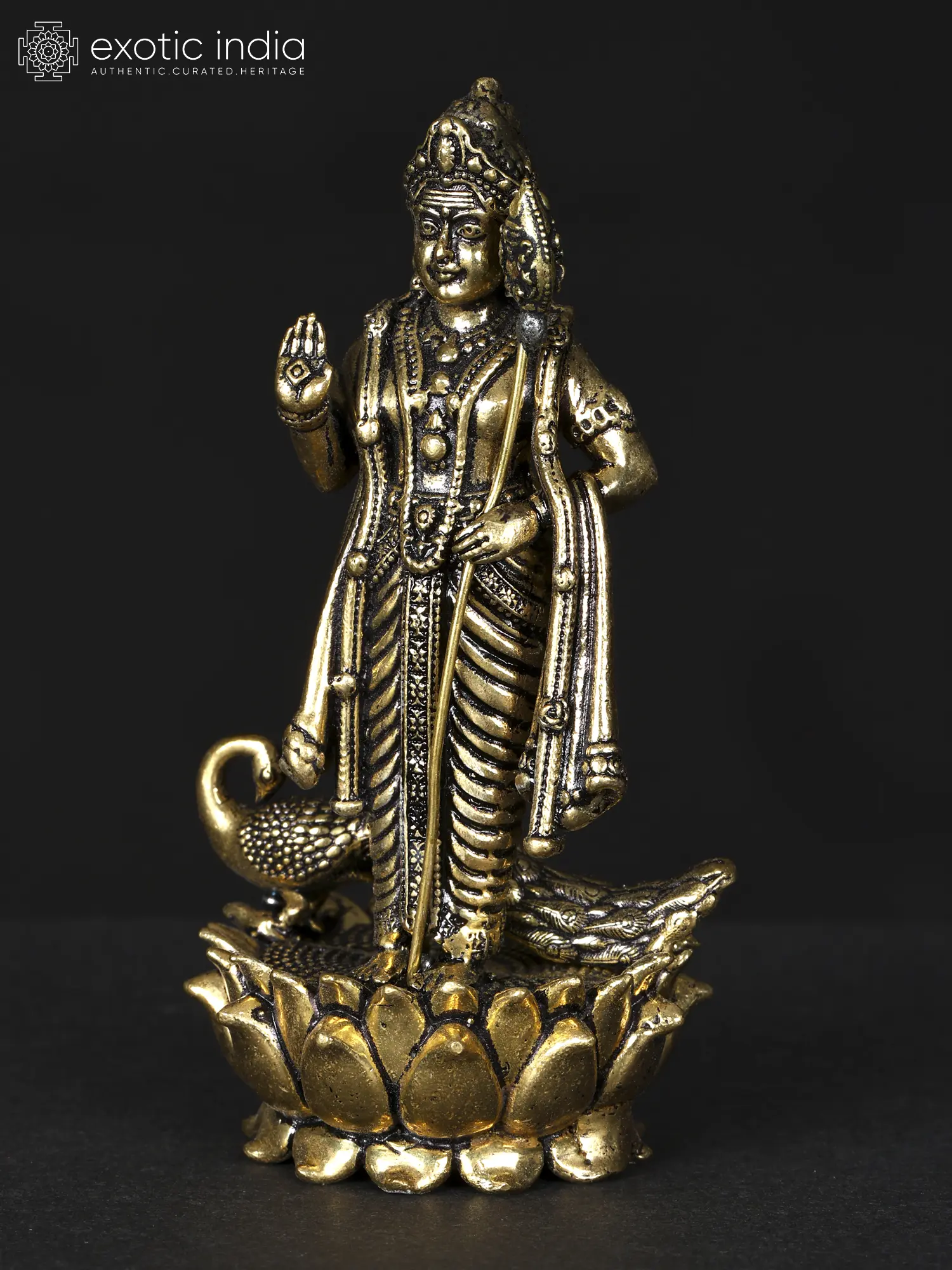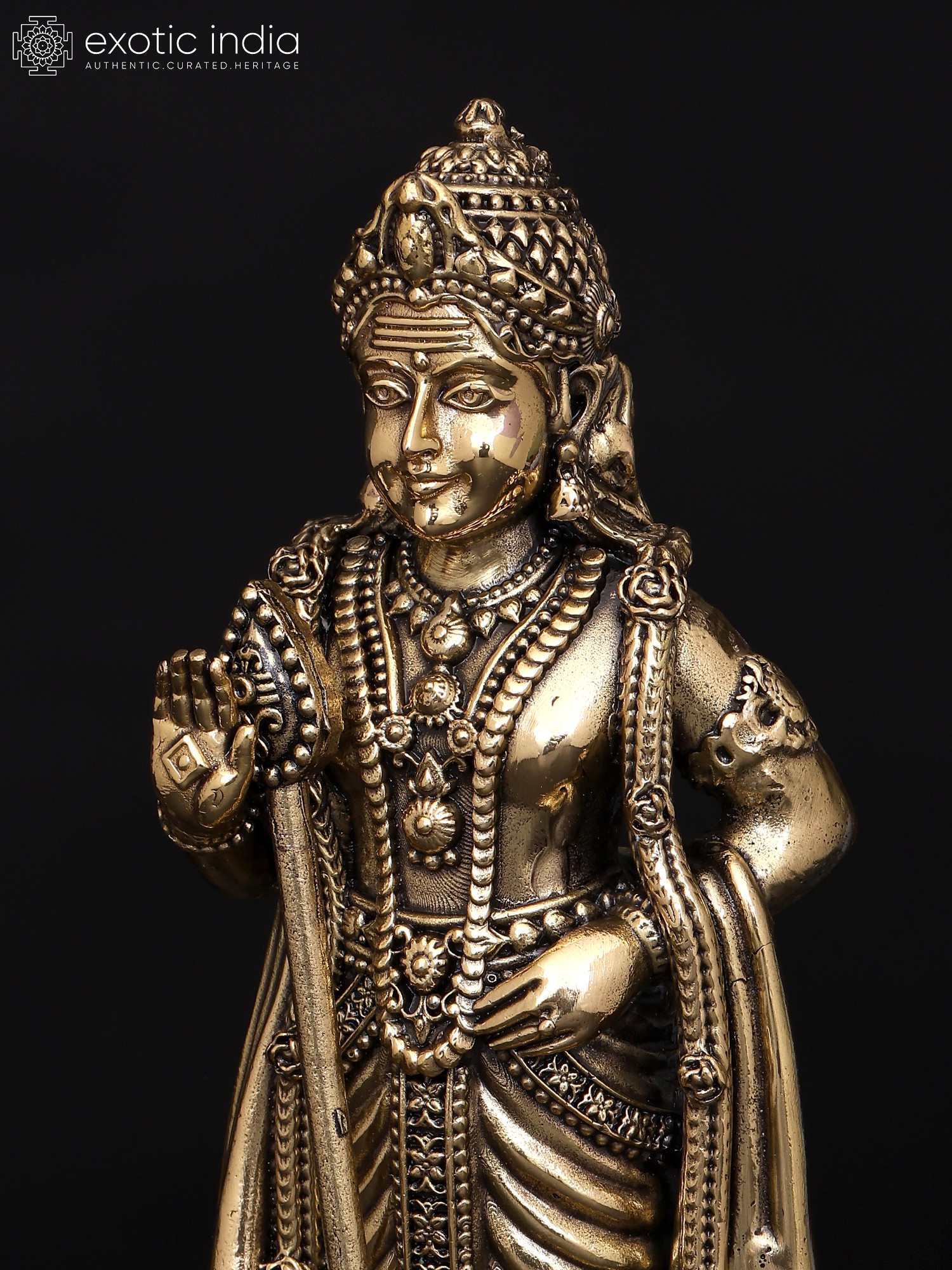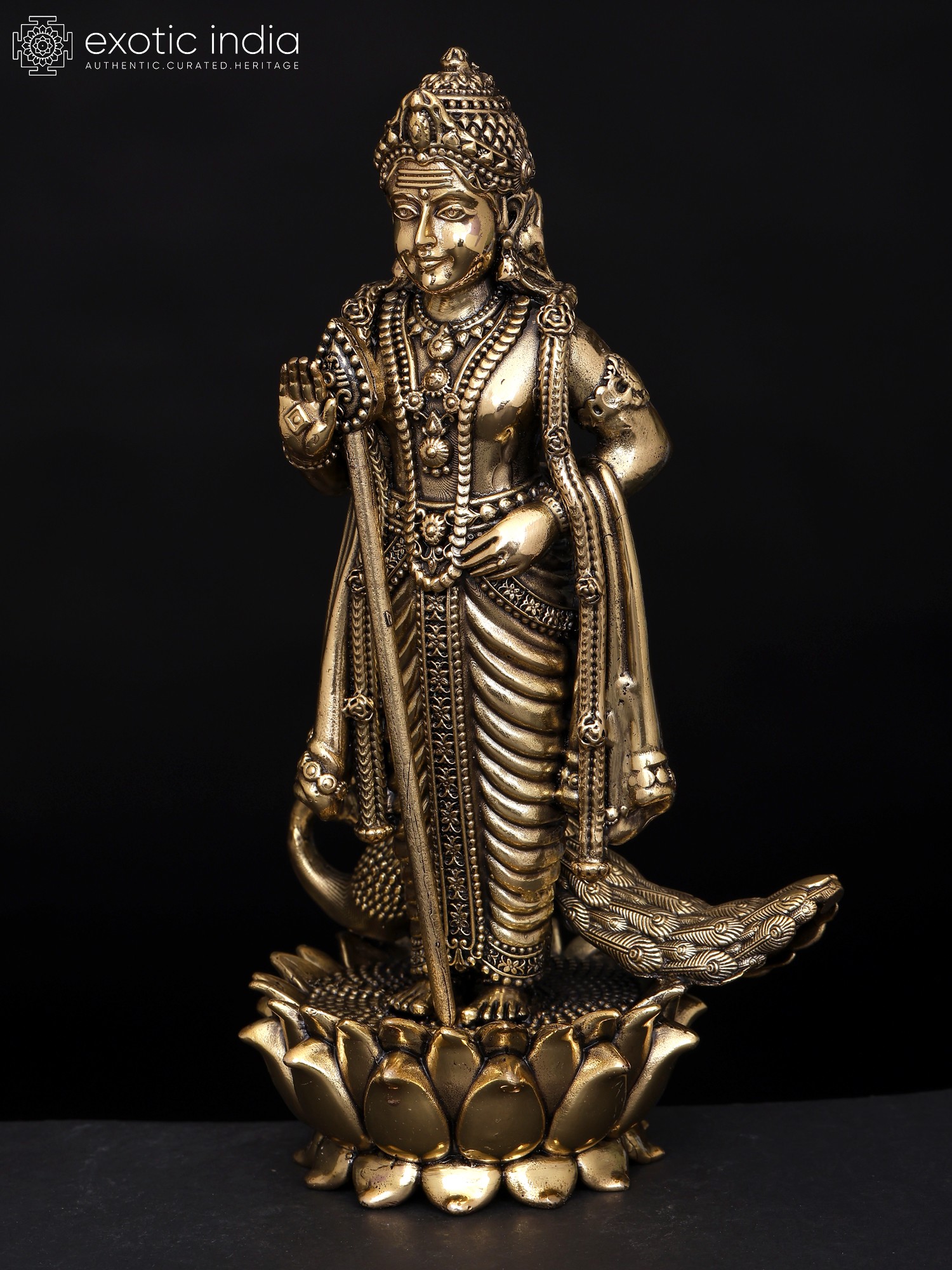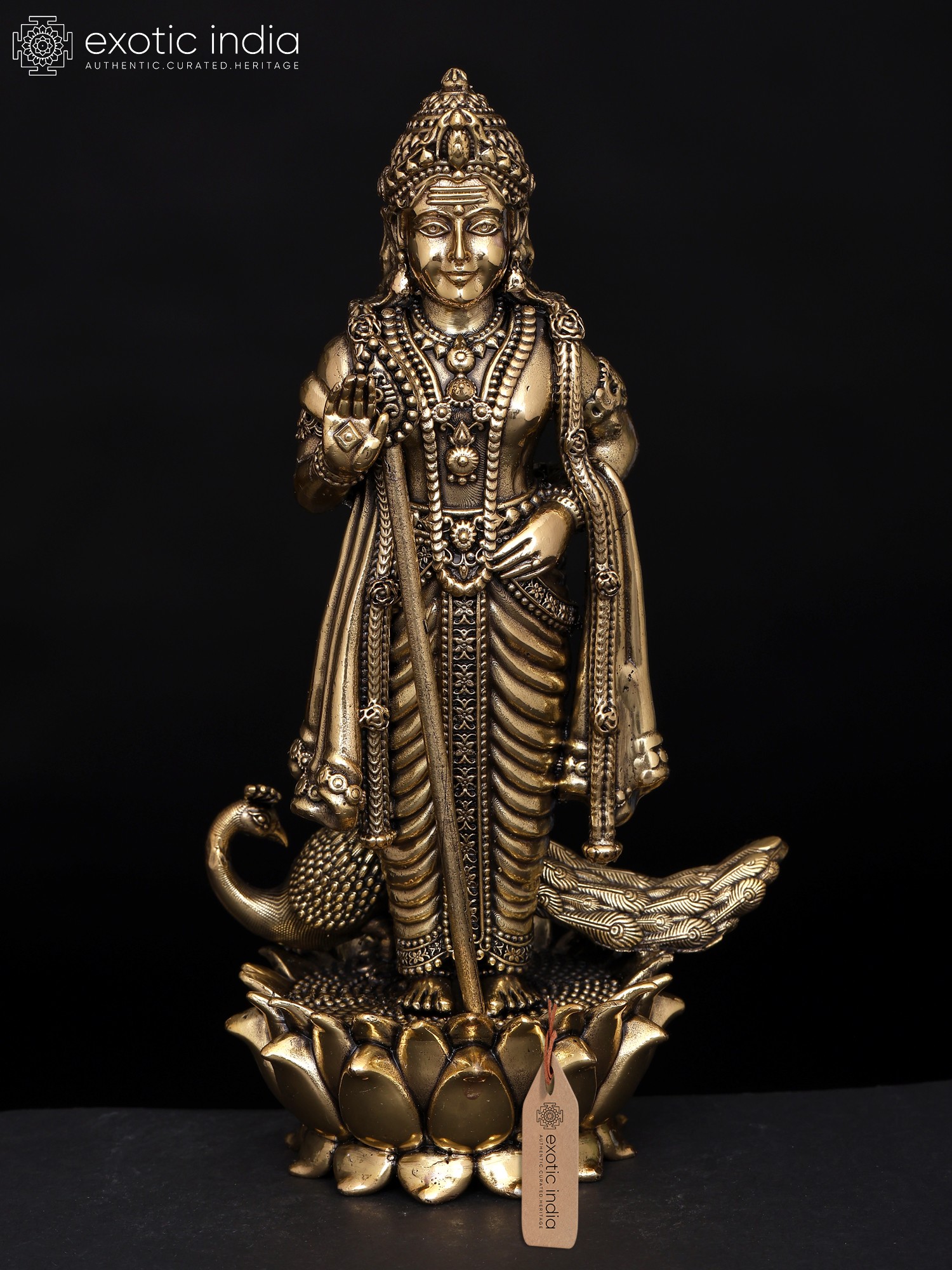 Karttikeya stands on a lovely fully bloomed lotus, that symbolizes the perfect bloom of knowledge in him. A crown sits on his symmetrical tresses (visible on the reverse), Tripunda adorns his forehead, ornaments embellish his form, and silken garments delineated with delicateness in metal convey the regalia of the Lord.