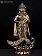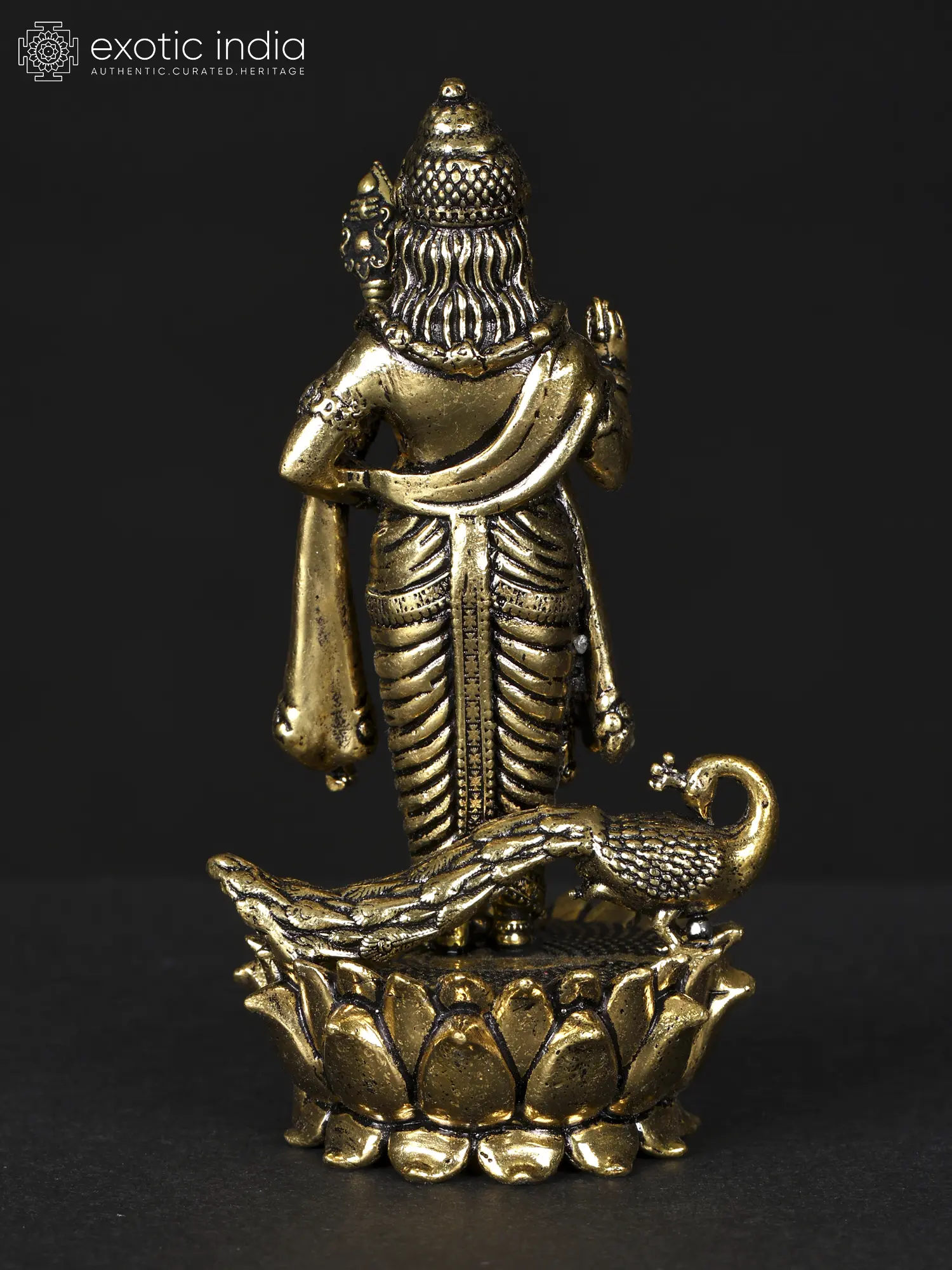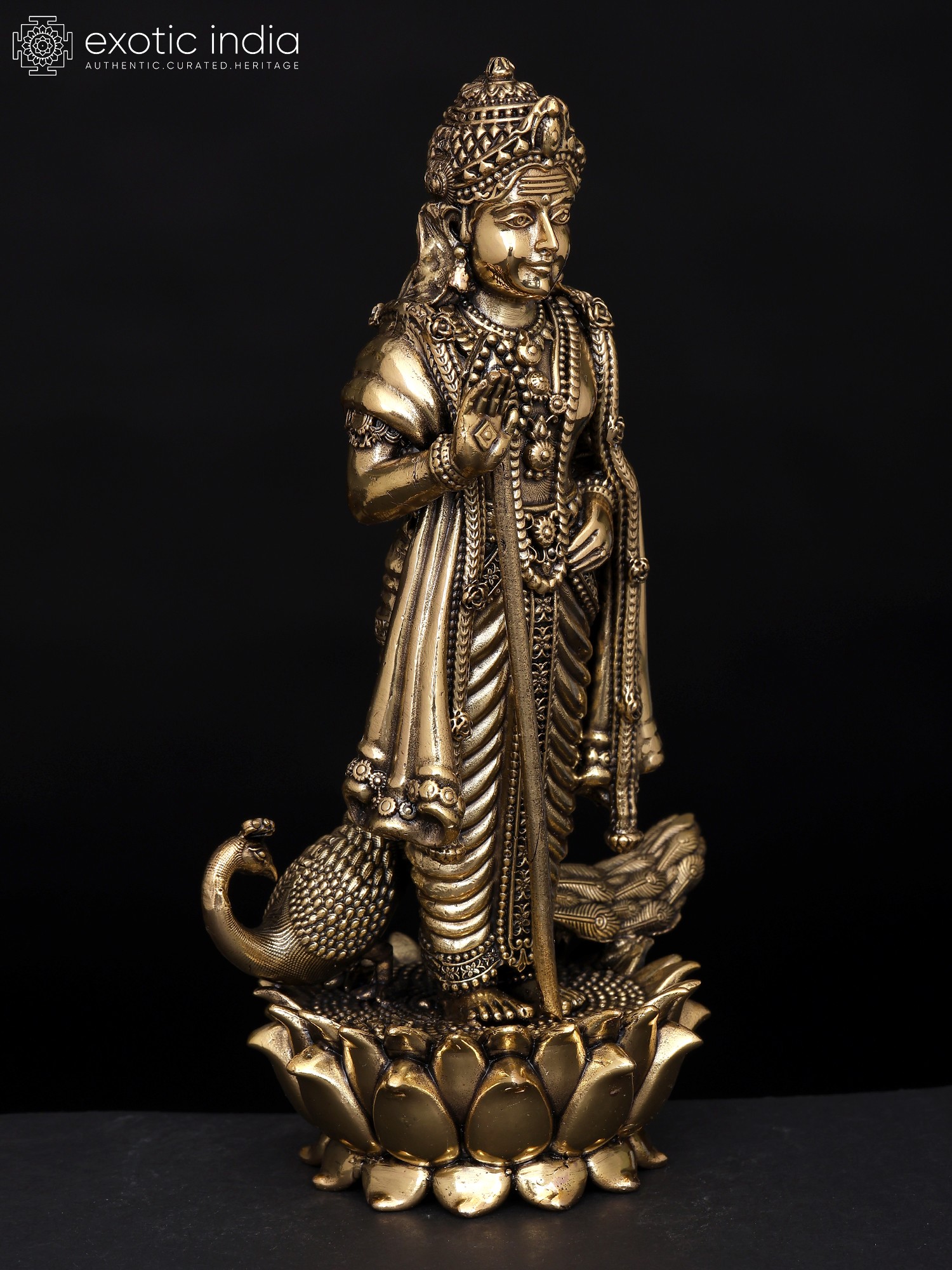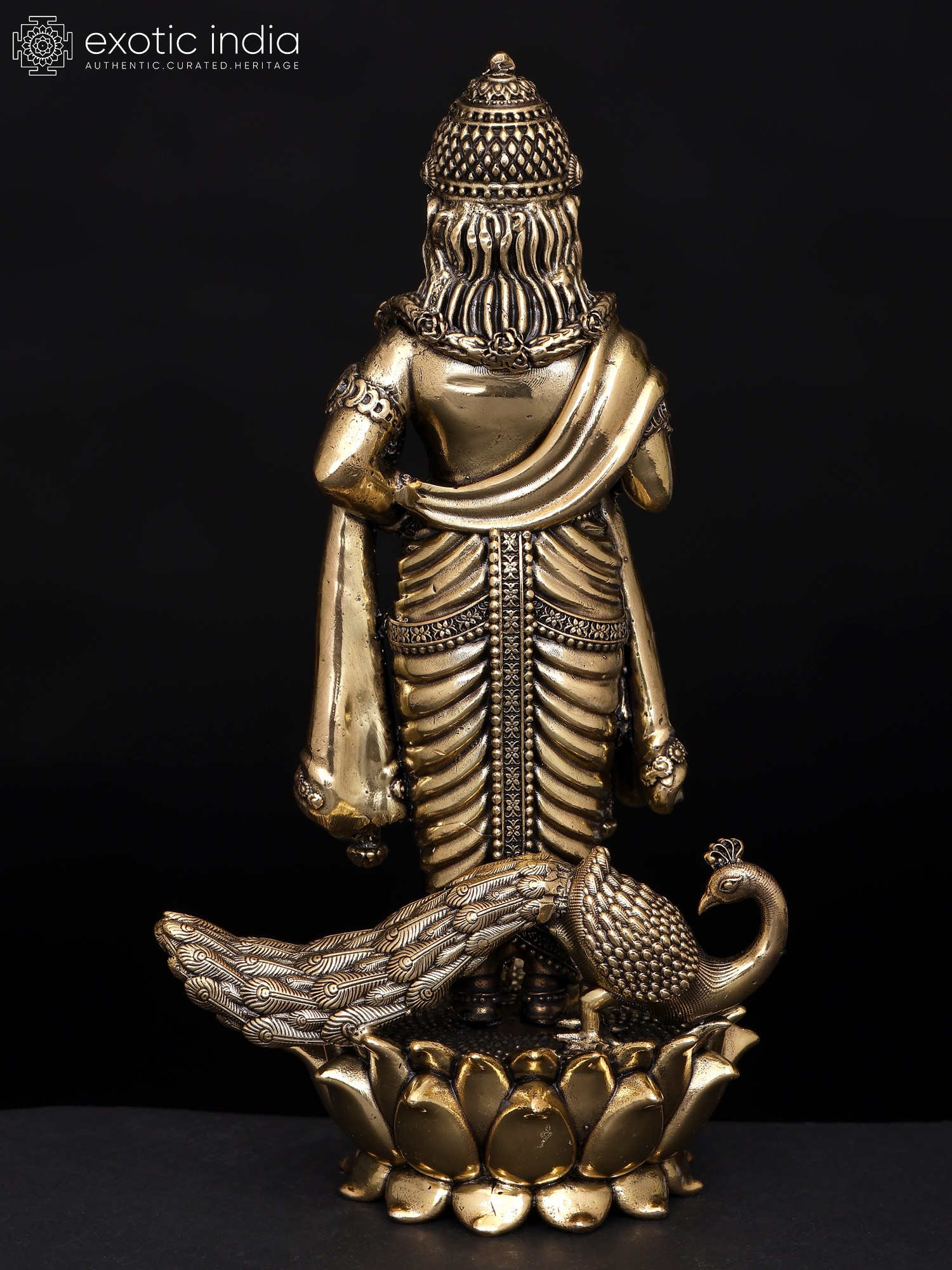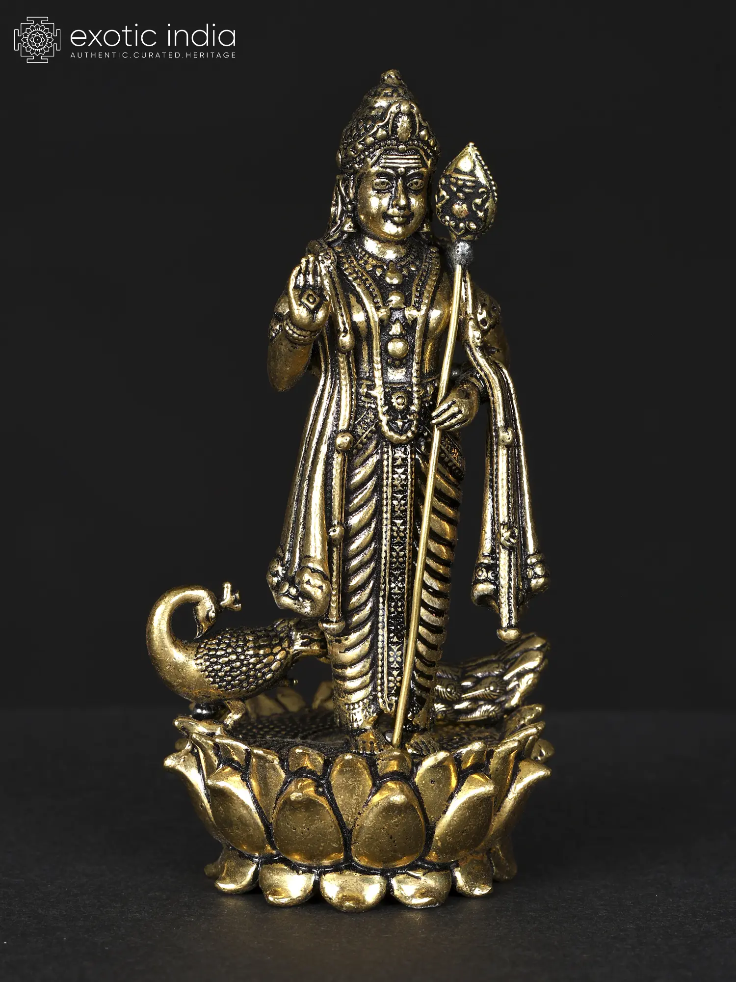 Karttikeya stands on a lovely fully bloomed lotus, that symbolizes the perfect bloom of knowledge in him. A crown sits on his symmetrical tresses (visible on the reverse), Tripunda adorns his forehead, ornaments embellish his form, and silken garments delineated with delicateness in metal convey the regalia of the Lord.