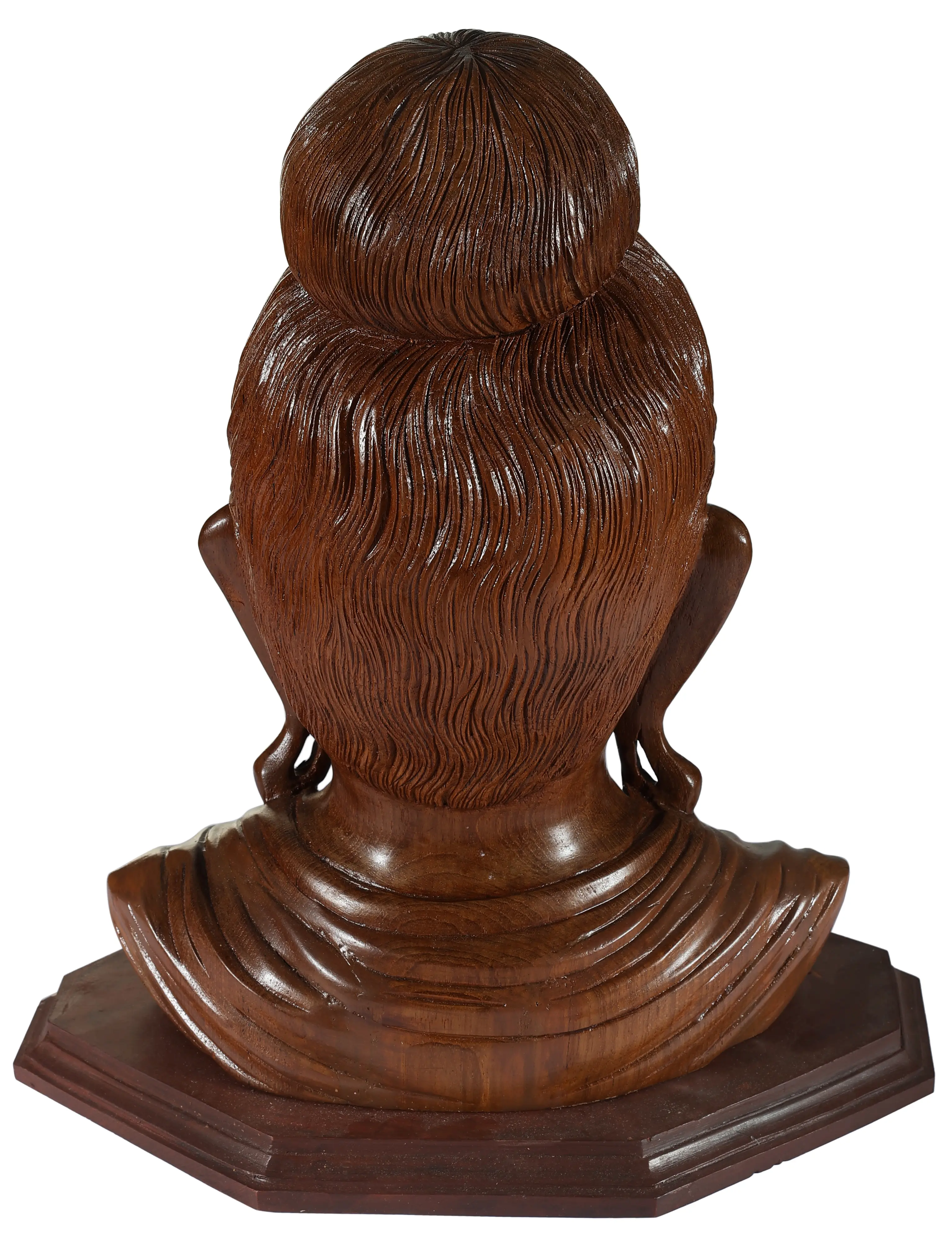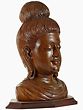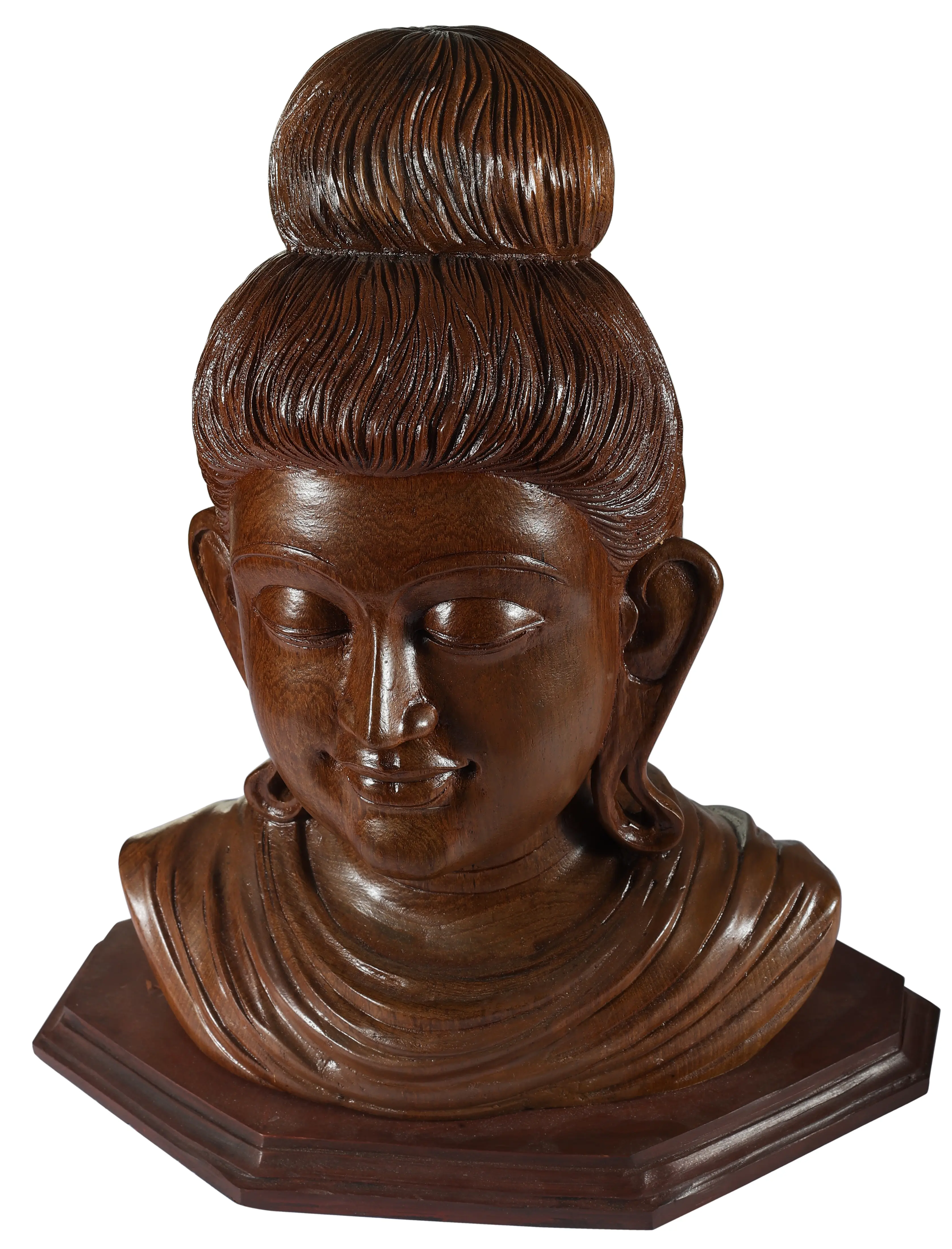 Behold this exquisite wooden sculpture, a captivating representation of the Buddha's gentle countenance. Crafted from rich, South Indian teakwood, this bust embodies a profound sense of peace and inner wisdom. The artist has masterfully captured the serene expression, with closed eyes suggesting deep meditation and a subtle smile that hints at the boundless compassion and enlightenment attained by the Awakened One. The intricate details of the sculpted hair, gathered in a timeless bun, and the delicately rendered earlobes, a symbol of the Buddha's renunciation of worldly possessions, speak to the dedication and skill of the artisan. The natural grain and warm hue of the teakwood lend an organic beauty and timeless quality to this piece. Teak, known for its durability and lustrous finish, has been a favored medium for sculptures across Asia for centuries. In Buddhist traditions, wood carvings often serve as sacred objects, used in temples or homes for contemplation and devotion. The act of carving itself can be seen as a meditative practice, with each stroke of the chisel bringing the form to life and imbuing it with spiritual energy. This particular bust, with its tranquil smile, evokes the teachings of the Buddha, reminding us of the potential for peace and joy that lies within each of us.