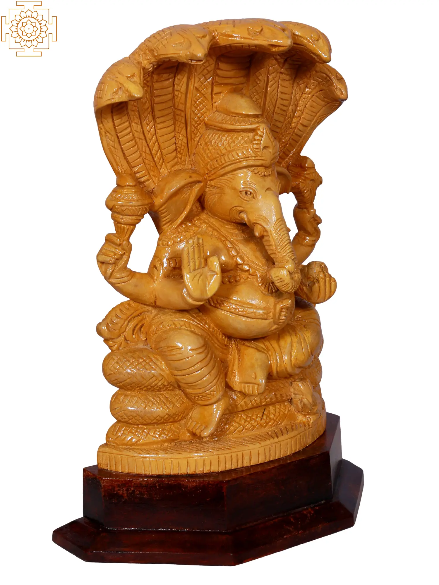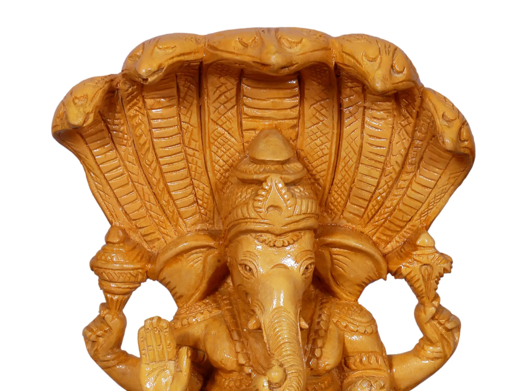 In this statue, Lord Ganesha, also known as “Vignaraja”, the King of obstacles, emerges, a captivating embodiment of divine artistry. Seated in Lalitasana atop the coiled serpent “Adishesha”, the five-hooded guardian of the cosmos, his form exudes serenity and power. Ganesha carries a goad to guide us through life's maze, and a noose to gently draw us towards righteousness. His front right hand extends in the Abhaya Mudra, offering protection and fearlessness. The coiled trunk, a marvel of balance, tenderly clasps a Modak, symbolizing sweetness in life's journey. A serpent, a symbol of transformation, embraces his ample belly, signifying his all-encompassing presence and the eternal cycle of creation and dissolution. This wooden masterpiece whispers a profound message - that with wisdom, love, and protection, obstacles can be transcended.