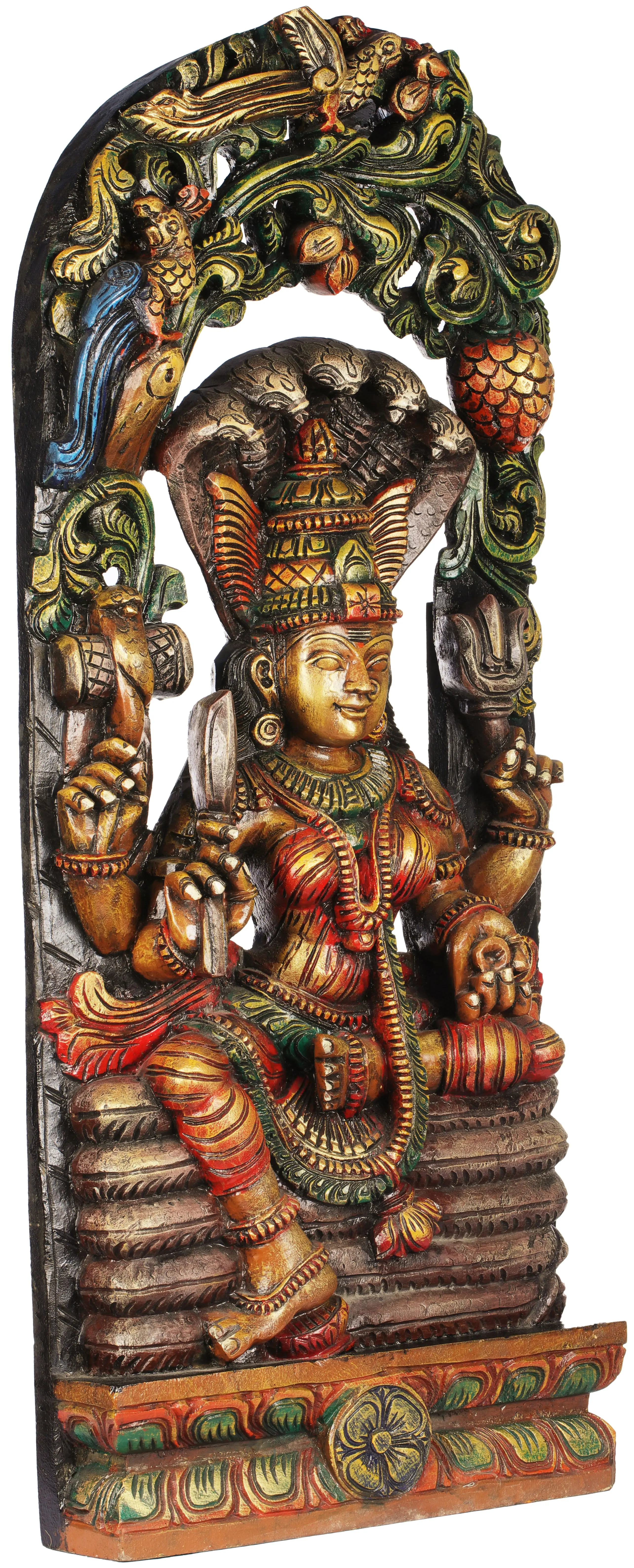 This magnificent wood carving is a testament to the rich artistic heritage of South India, depicting the benevolent and powerful Goddess Mariamman. Crafted with exquisite detail, this devotional piece captures the essence of the divine mother, who is revered as the protector of her devotees, a healer of diseases, and a bestower of prosperity. The intricate carvings showcase traditional South Indian temple artistry, where every curve, motif, and form is imbued with deep spiritual significance. The goddess is presented in a seated posture, exuding an aura of serene strength. Above her, a majestic serpent with multiple hoods offers a protective canopy, symbolizing her dominion over the primal forces of nature and her power to ward off evil. In Hindu mythology, serpents often represent divine energy, fertility, and immortality, and their association with deities like Mariamman underscores her potent protective and regenerative powers. The serpent's hooded presence creates a sacred space around the goddess, emphasizing her divine presence and the sanctity of the devotion she inspires.