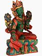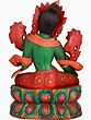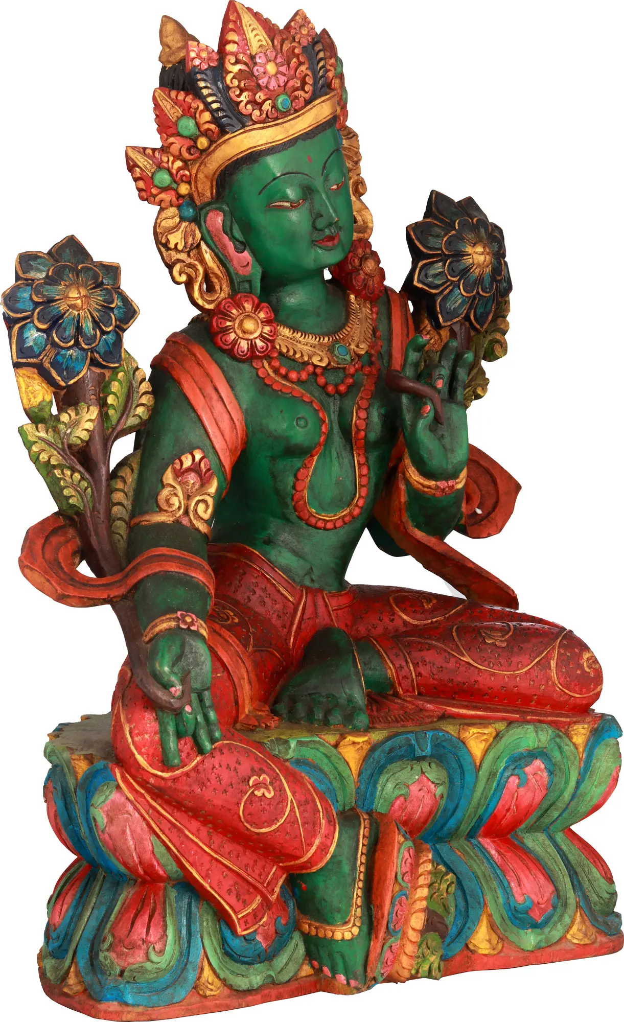 The beauty and tenderness of Her countenance are matched by Her lithe limbs and torso, carved skilfully out of coniferous wood that grows in abundance in Nepal. The sumptuous red of Her dhoti and meditation sash, and the resplendence of Her ample shringar from head to toe, are brought out by the riotous pastels that colour the dual-layer lotus pedestal. The lalitasana is typical of Bodhisattvas steeped in meditation - note how a fresh lotus has sprouted where the right feet lowers and rests itself. Her right hand is in dhyana mudra, while the left is in the characteristic gesture reminiscent of the Three Jewels. From amidst the circle made by Her thumb and forefinger emerges a gracious blue lotus with a centre of golden light. A similar lotus to the right of Green Tara adds balance to the composition.