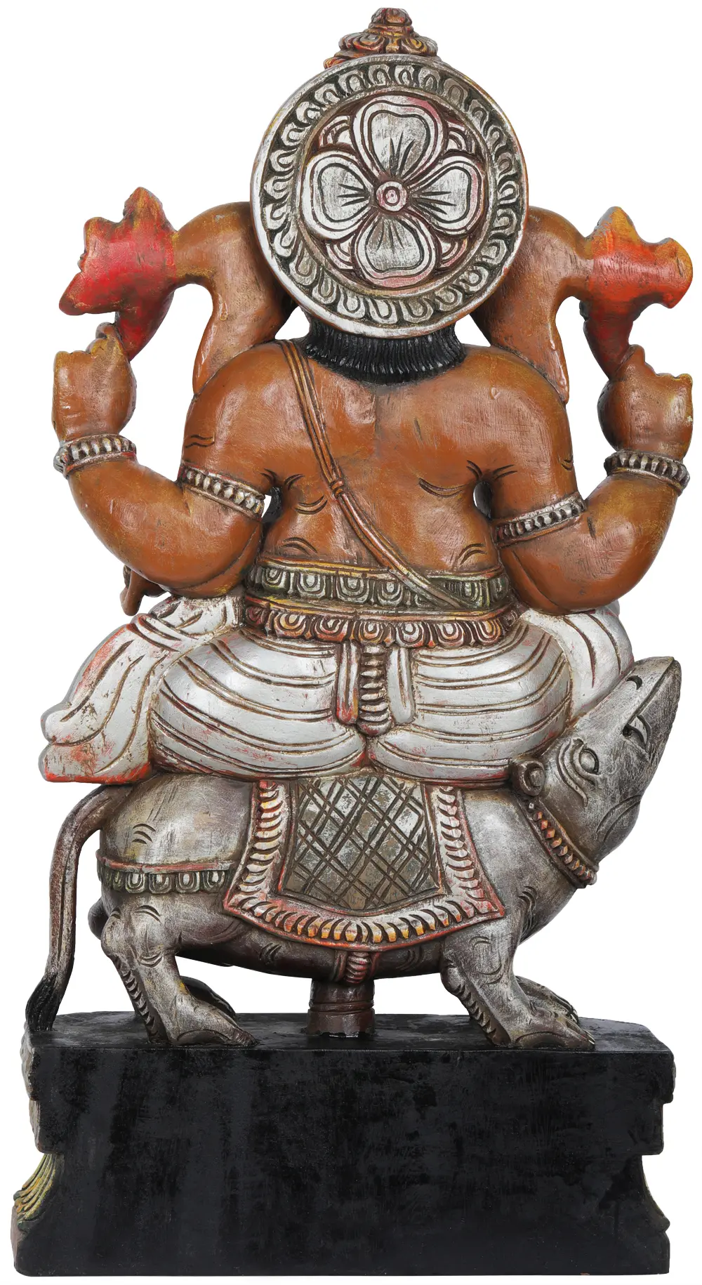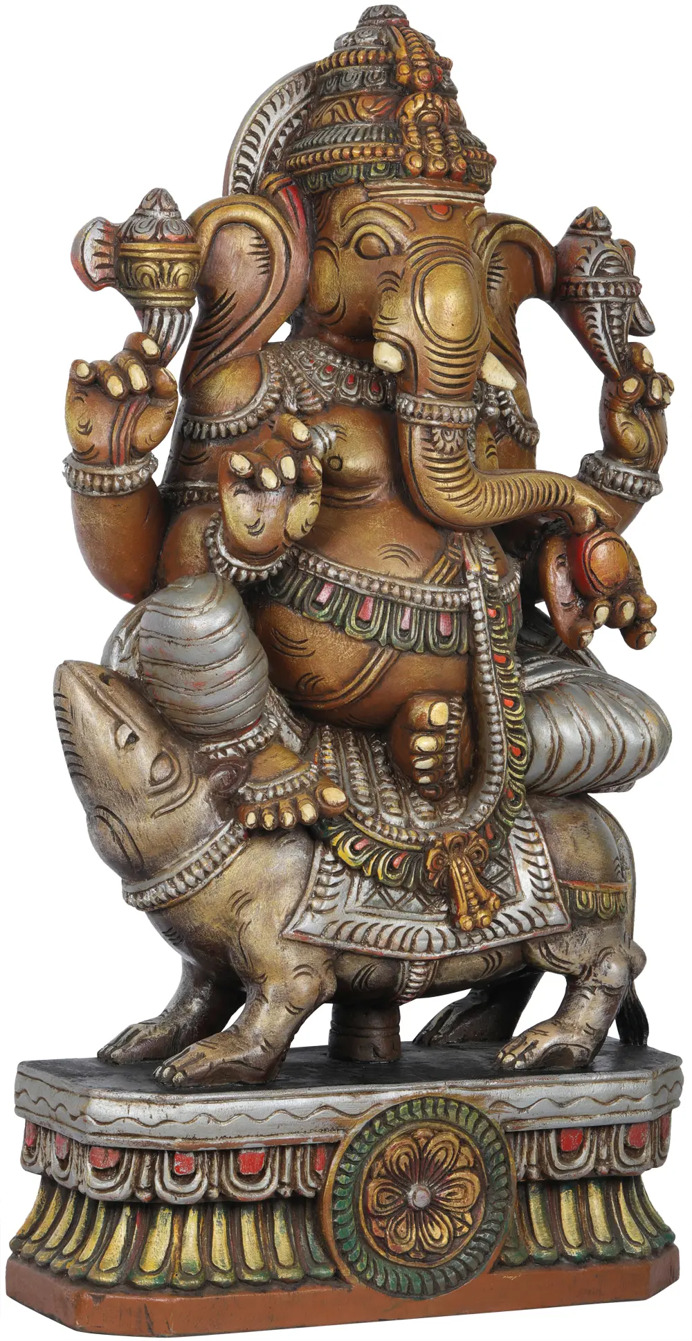 This wood carving is a testament to the enduring artistry of South India, a region renowned for its intricate temple sculptures and divine iconography. Each curve and contour of Ganesha's form, from the majestic crown adorning his head to the delicate rendering of his fingers and toes, speaks of the carver's profound skill and spiritual connection to the subject. The accompanying Musika is rendered with equal care, its form powerful yet subordinate, reinforcing the divine harmony. The vibrant colors and ornate detailing on Ganesha's attire, such as the bejeweled belt and decorative patterns, add a layer of opulence and spiritual significance. This piece is not merely a decorative item; it is a sacred artwork designed to inspire peace, prosperity, and the courage to face life's challenges with grace and wisdom. Its substantial presence and intricate craftsmanship make it a truly captivating addition to any spiritual or artistic collection.