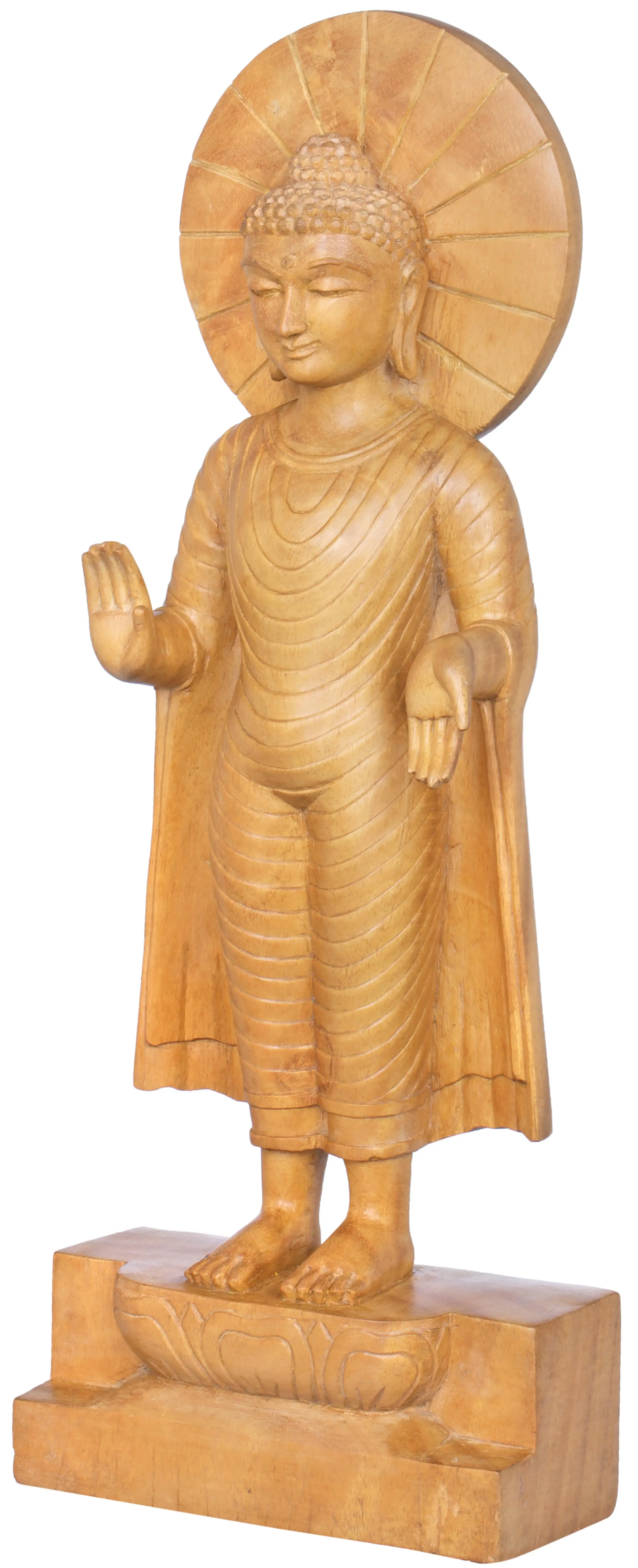 Experience the serene presence of the Standing Buddha, a depiction of Lord Buddha in an upright posture radiating peace, compassion, and enlightenment. With one hand raised in the gesture of fearlessness (abhaya mudra) and the other hand resting by his side, the Standing Buddha symbolizes protection, courage, and tranquility.