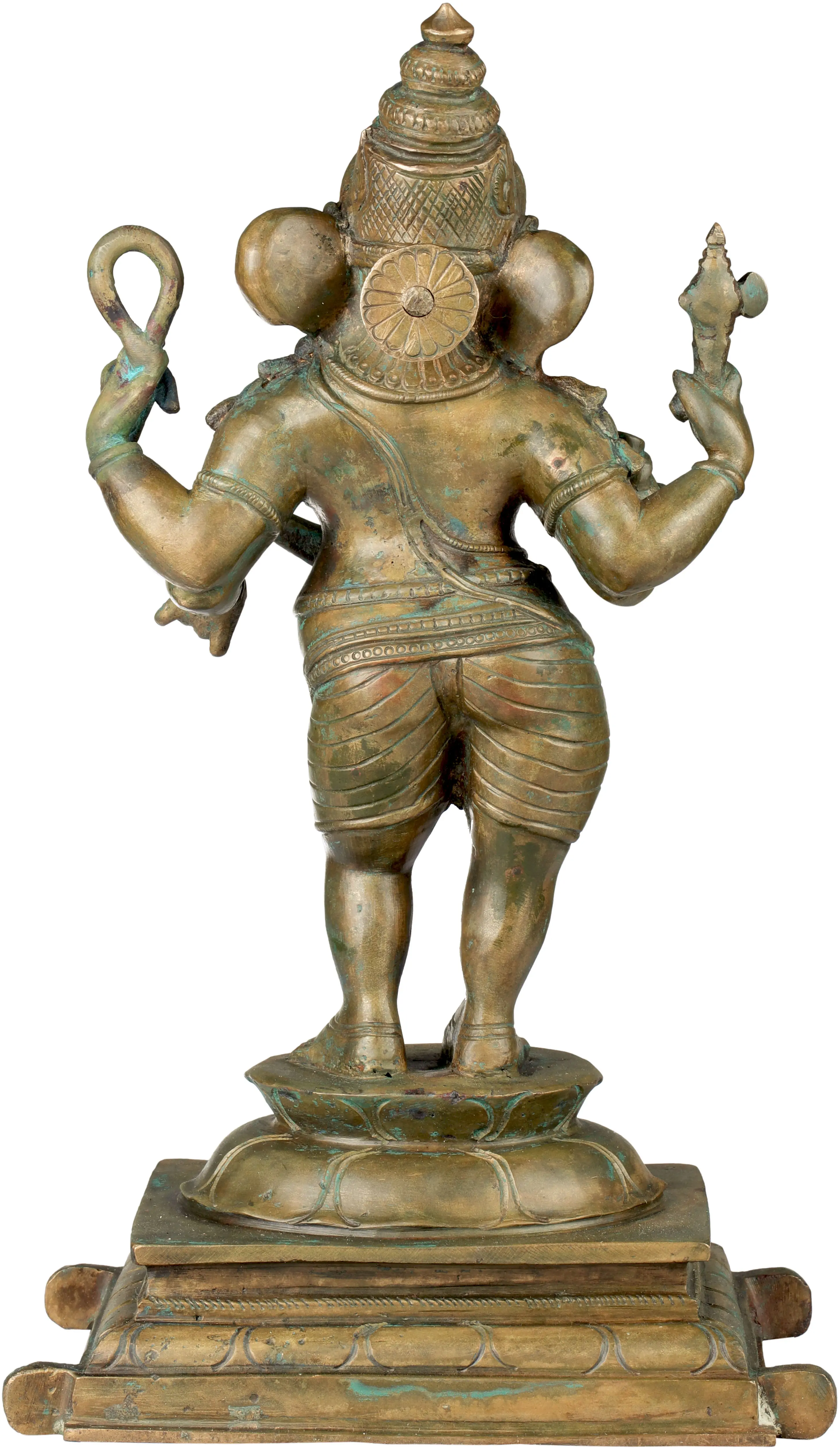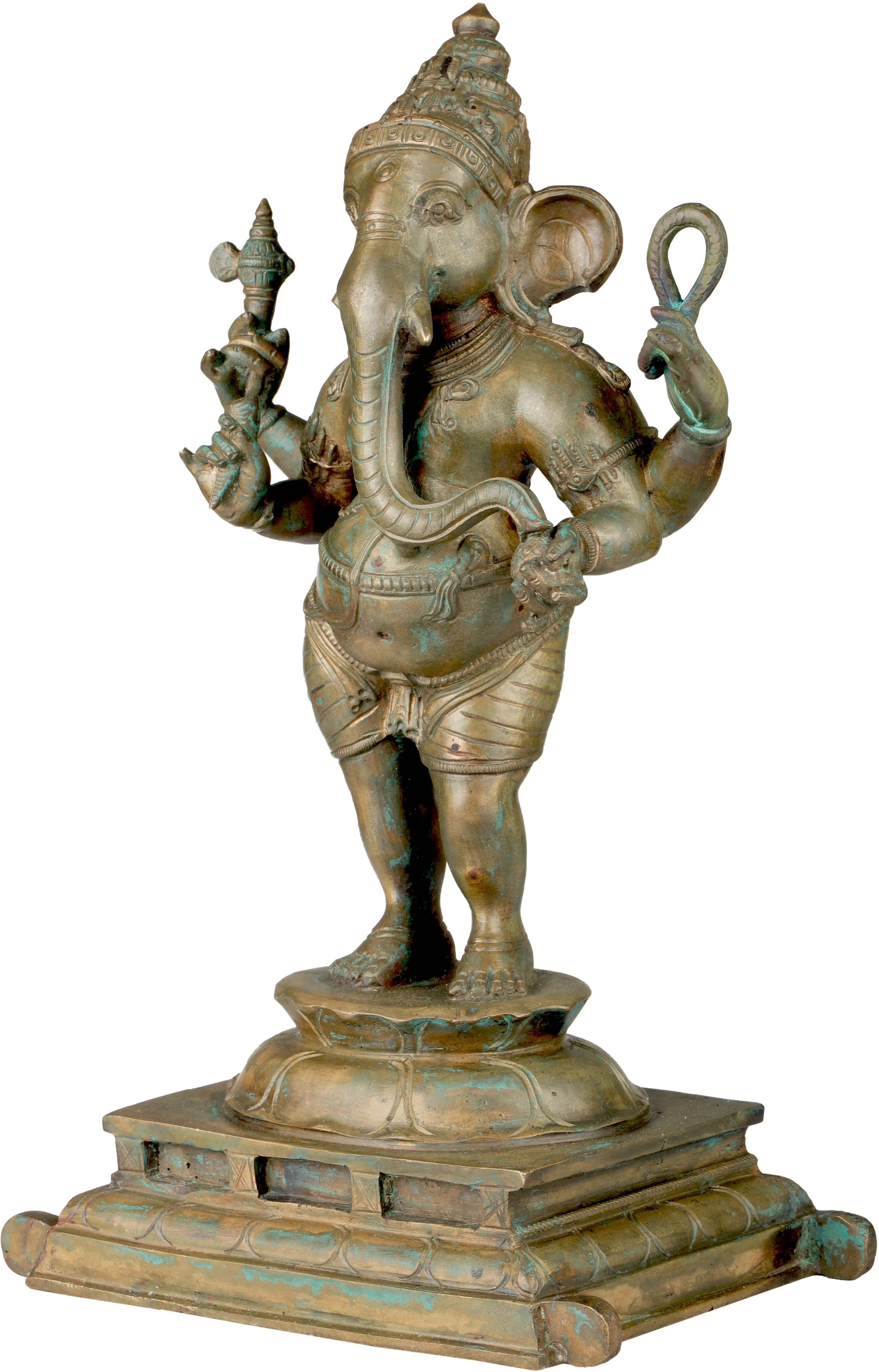 He stands on an upturned lotus featuring gigantic gold petals. The same is placed atop an engraved pedestal with extensions on all four corners, making the work of art convenient to carry. Note the childlike yet all-knowing gaze of Ganesha, and the laddo in His anterior left hand, without which His iconography would be incomplete.