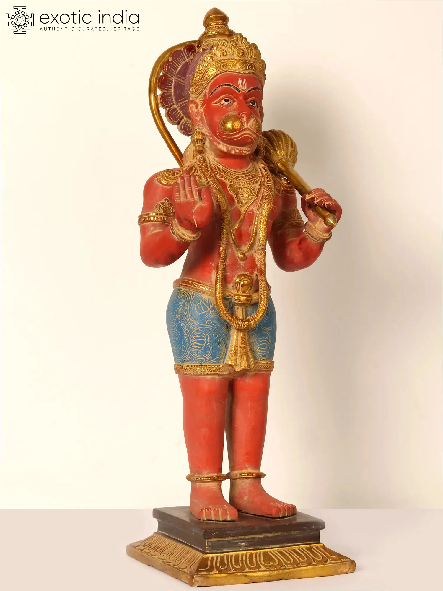 In this brass rendition, Lord Hanuman, the One Who supports and protects the helpless (Deenbandhave), graces a lotus pedestal, an ethereal symbol of purity, while his right hand, extended in the “Ashirwad Mudra” (Gesture of Benediction), radiates blessings to all who gaze upon him. His towering form carries the mighty Mace upon his shoulder, a testament to his unwavering strength and devotion.