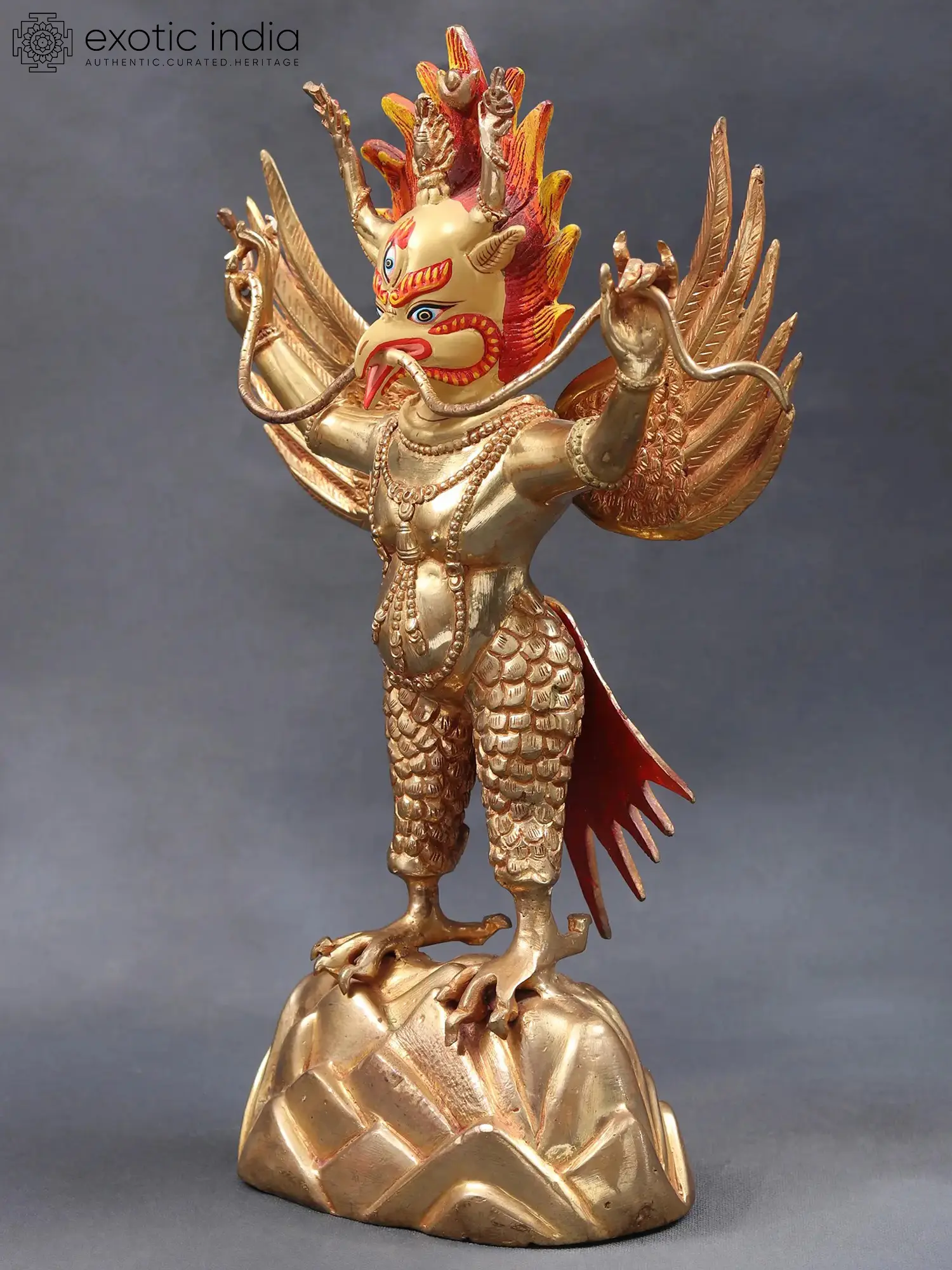 In the Hindu literary tradition, Garuda is often depicted as an arch-rival of serpents or Nagas, drawing on which this statue from Nepal depicts Garuda in a vigorous mood, with his large wings flapping in the air as he holds his enemy- a Naga in his sharp beak.