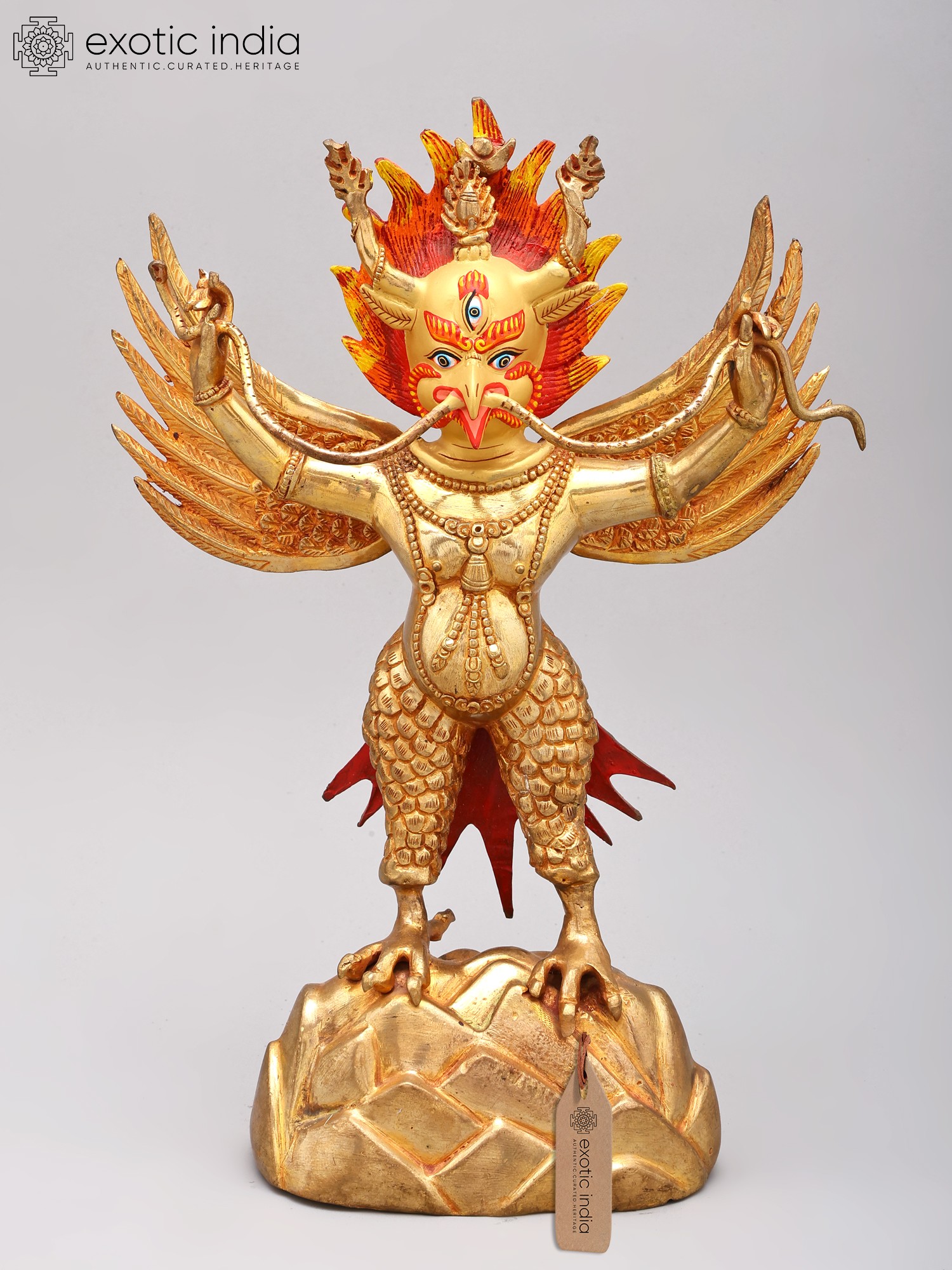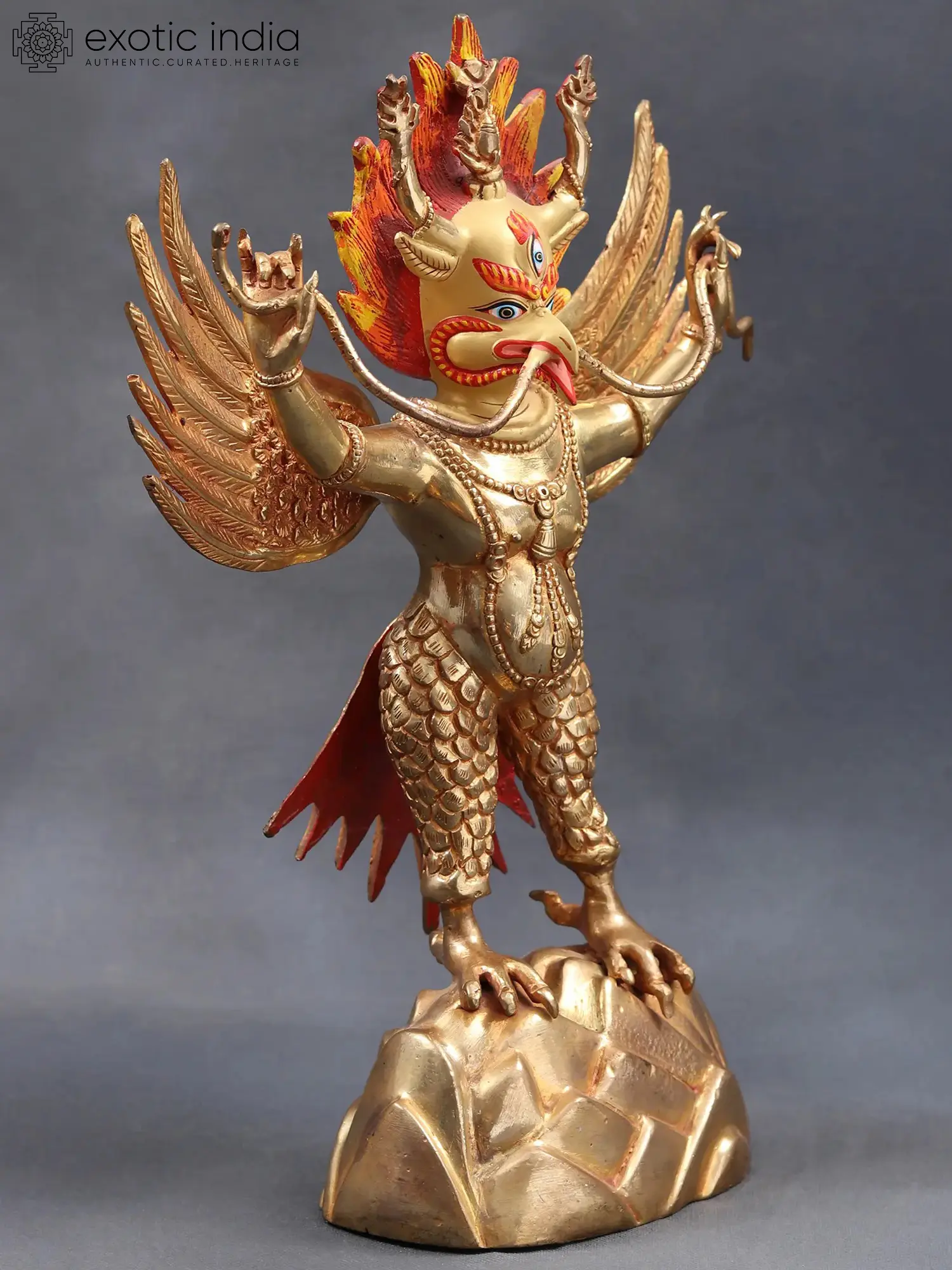 The countenance of Garuda, with three animated eyes, horns, and a fiery halo inspires awe in the onlooker, giving the composition an enlivened and ferocious aura.