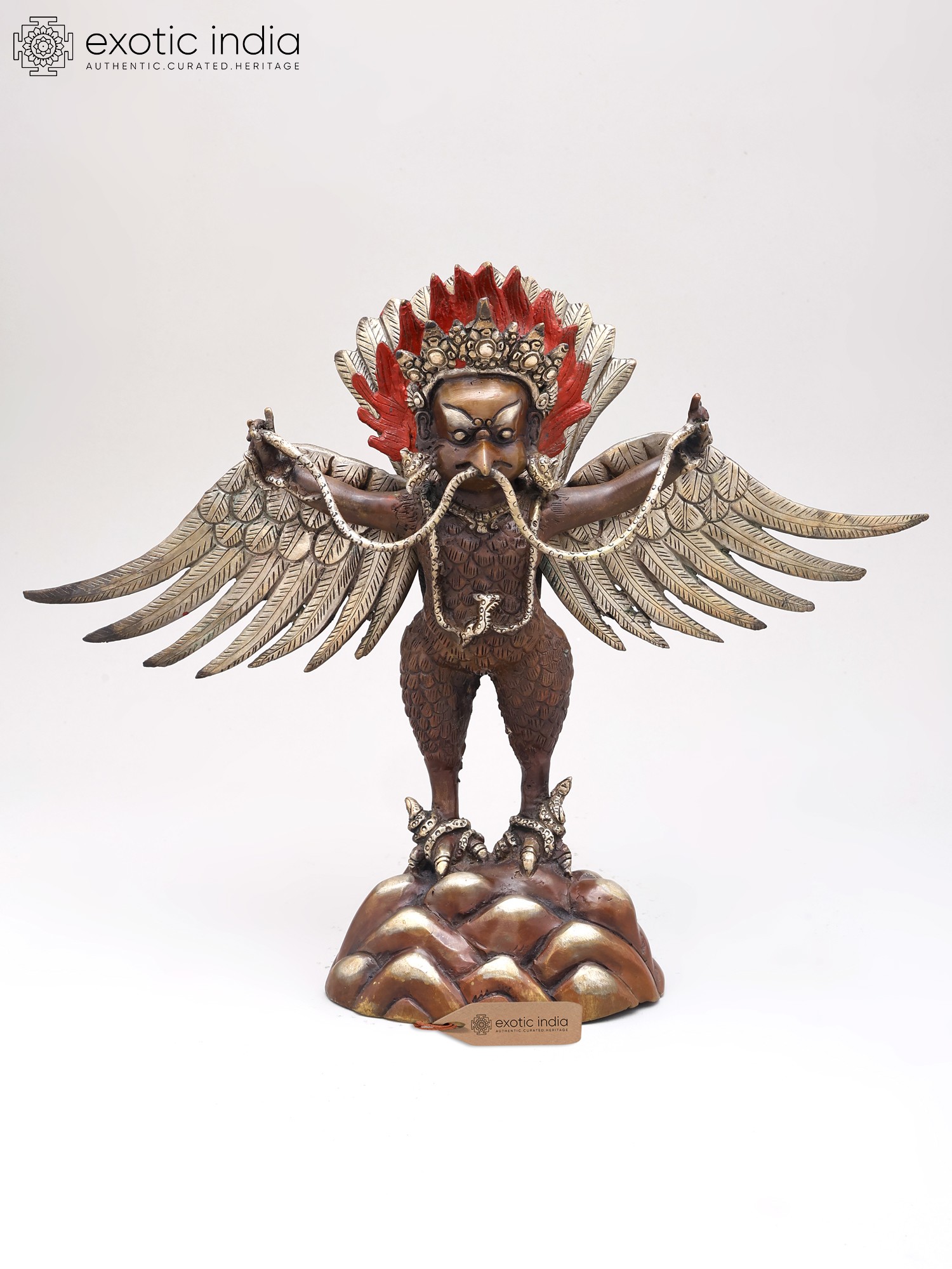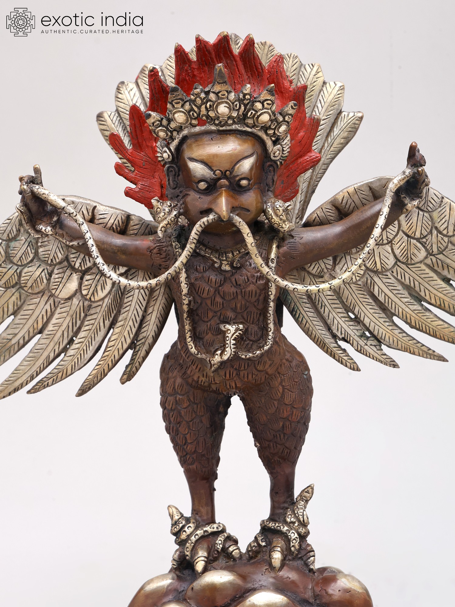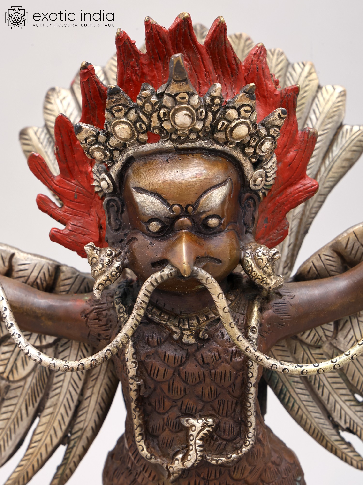This cosmic immortal bird-god or the king of birds is favoured by both Hindus and Buddhists; having torso and arms of a strong man in a dark golden brown shade and a traditional Nepali Buddhist crown in white and ted combination. He defeated snakes in a battle and wears one as jewelry and the other he carries in his vicious looking beak and holds the ends by hands.