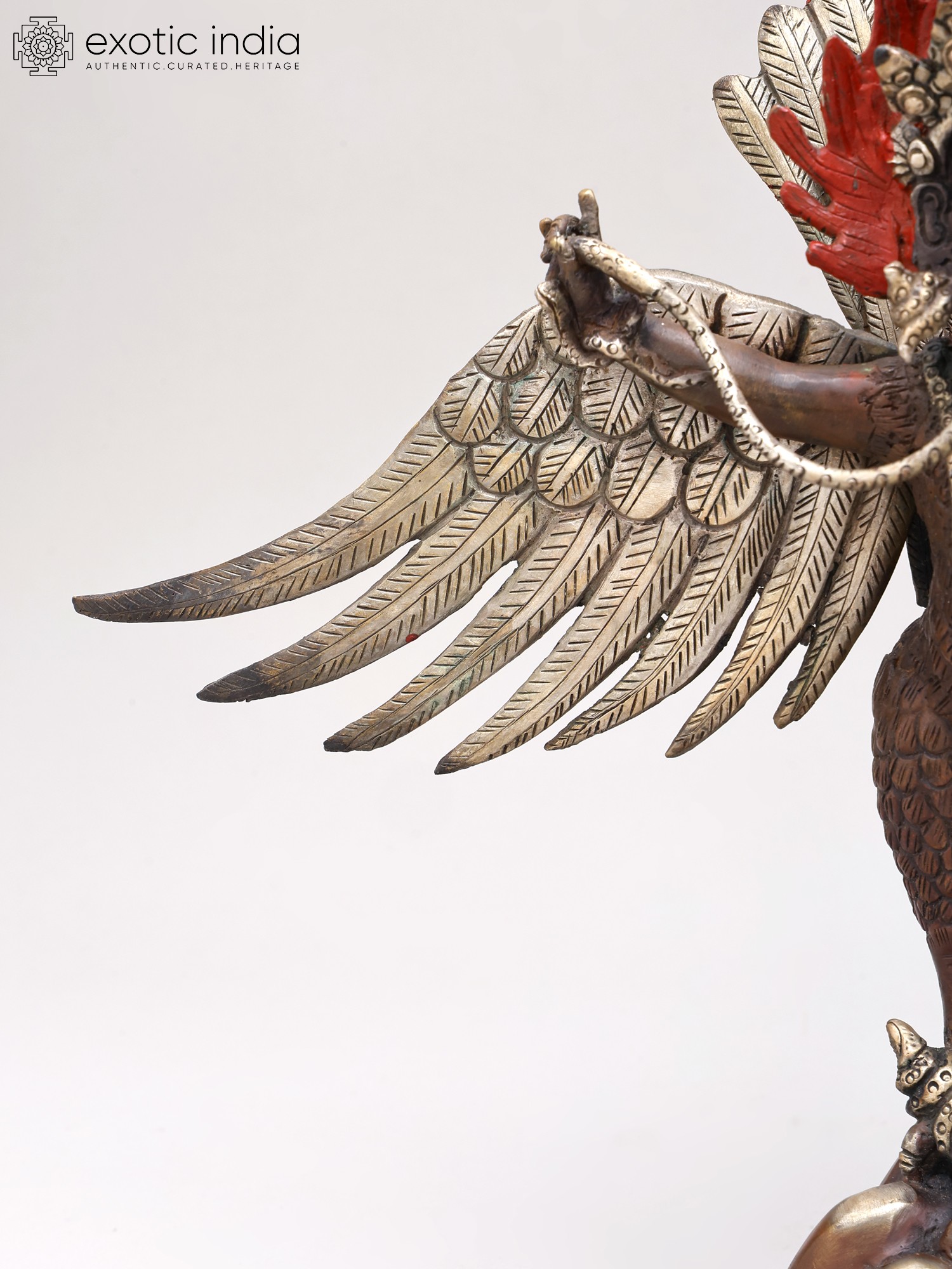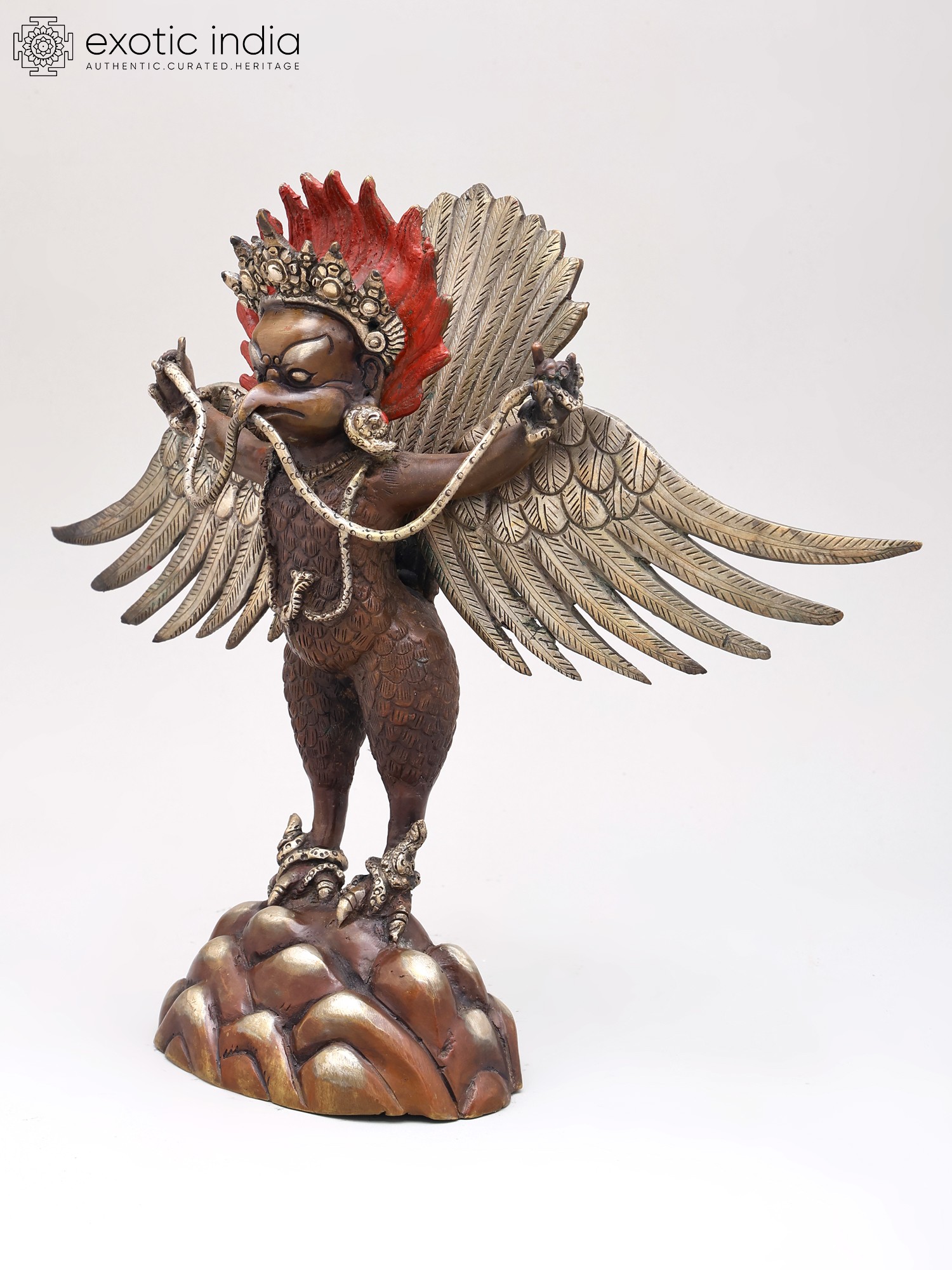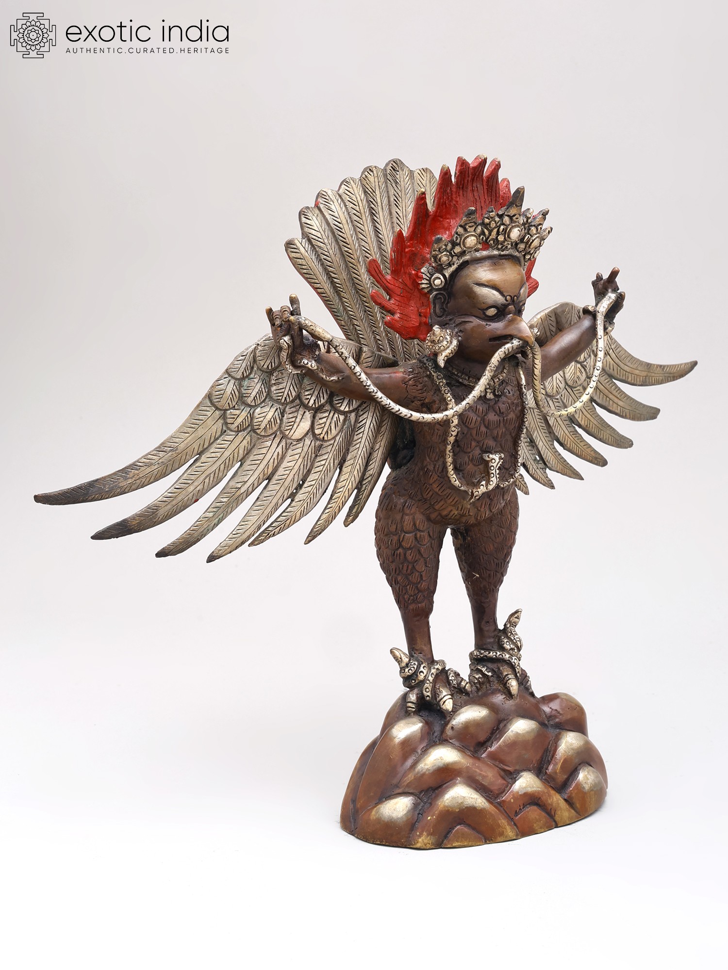 This cosmic immortal bird-god or the king of birds is favoured by both Hindus and Buddhists; having torso and arms of a strong man in a dark golden brown shade and a traditional Nepali Buddhist crown in white and ted combination. He defeated snakes in a battle and wears one as jewelry and the other he carries in his vicious looking beak and holds the ends by hands.