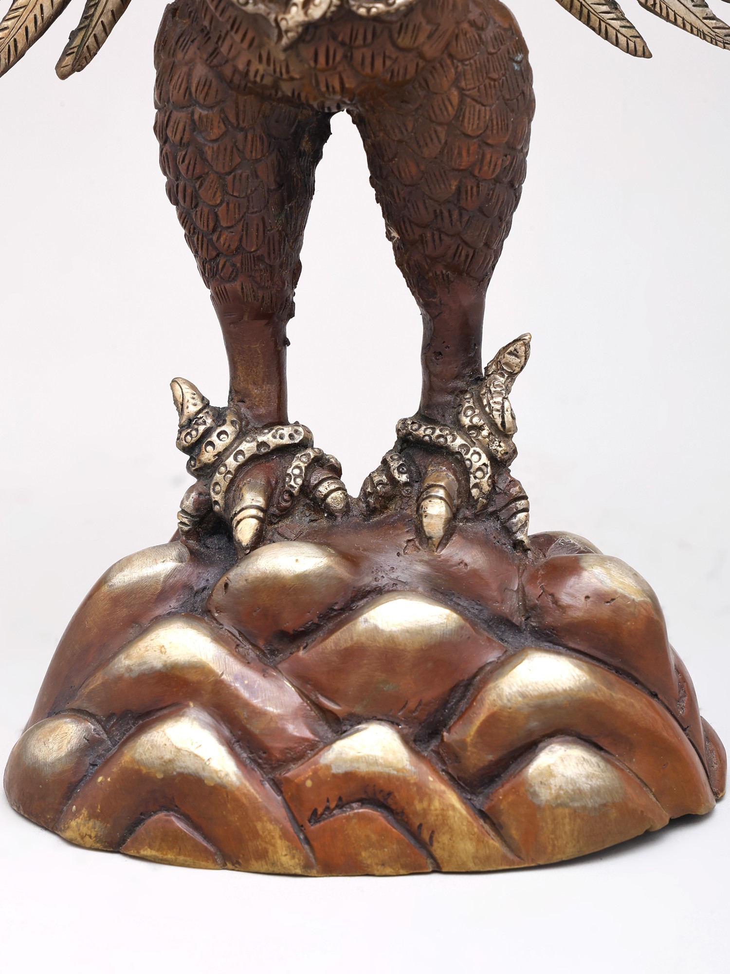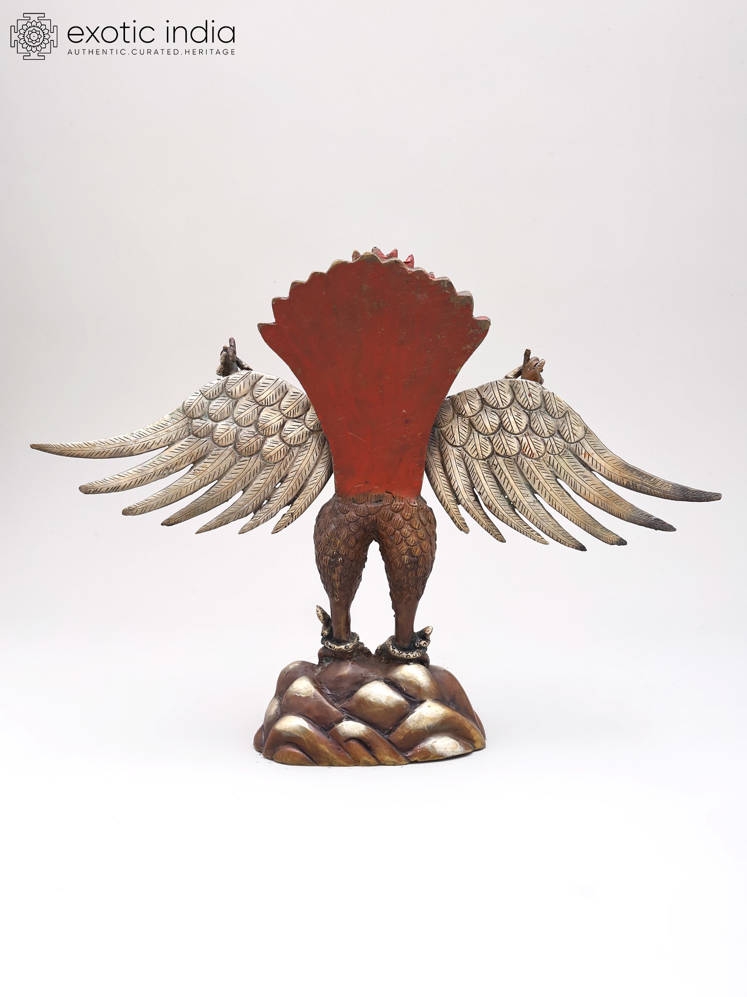 The vahana of Vishnu steeped in legend, mythology and modern symbolism as a bird creature that has a mix of eagle and human beings. Garuda is an enemy of all snakes and represents birth and heaven. In Indian art form, Garuda is depicted in human form; shown here as standing on a realistic multi-levelled rock with the white colored marvellously styled and carved feathers stretched up to a mile wide.