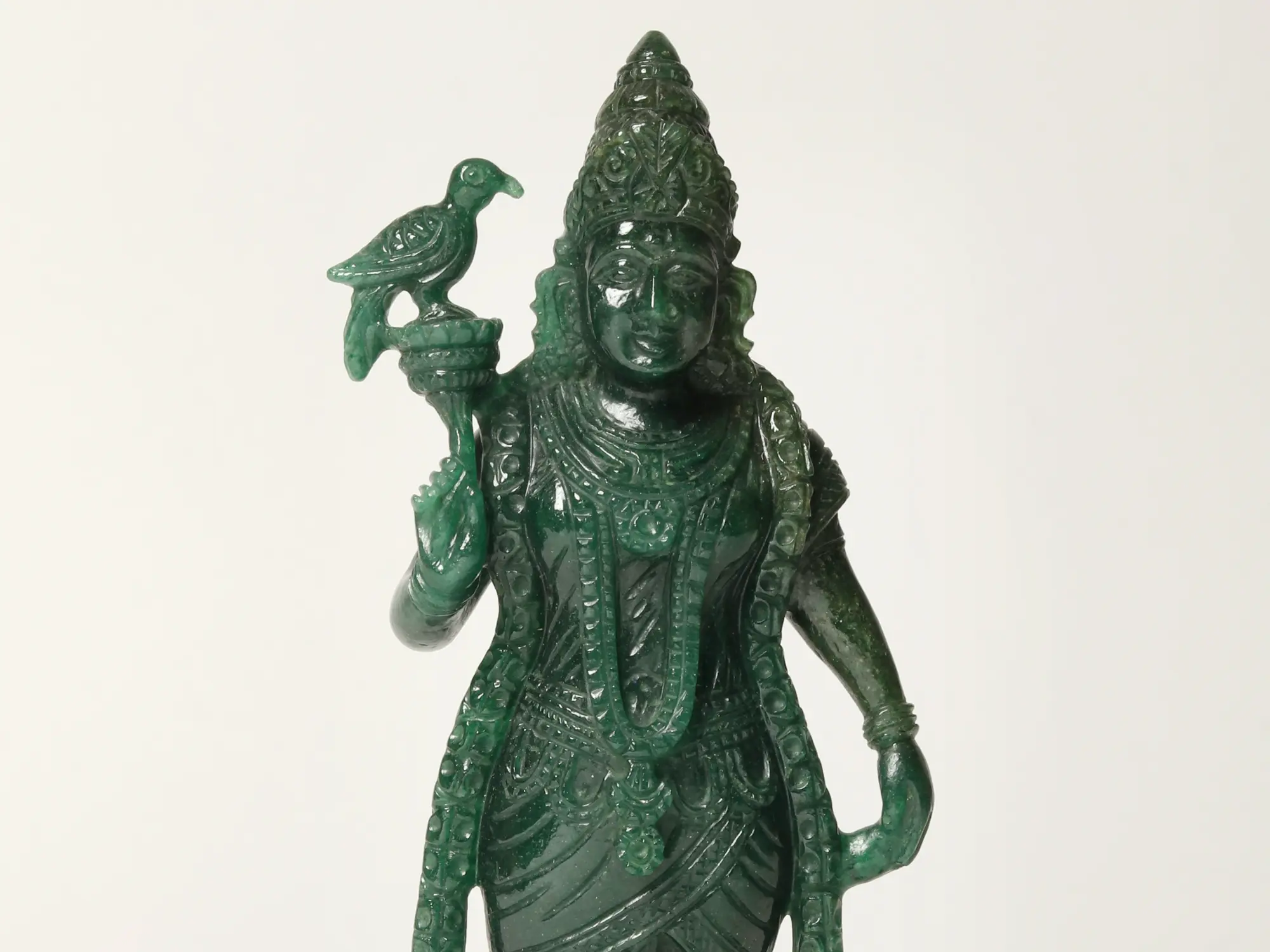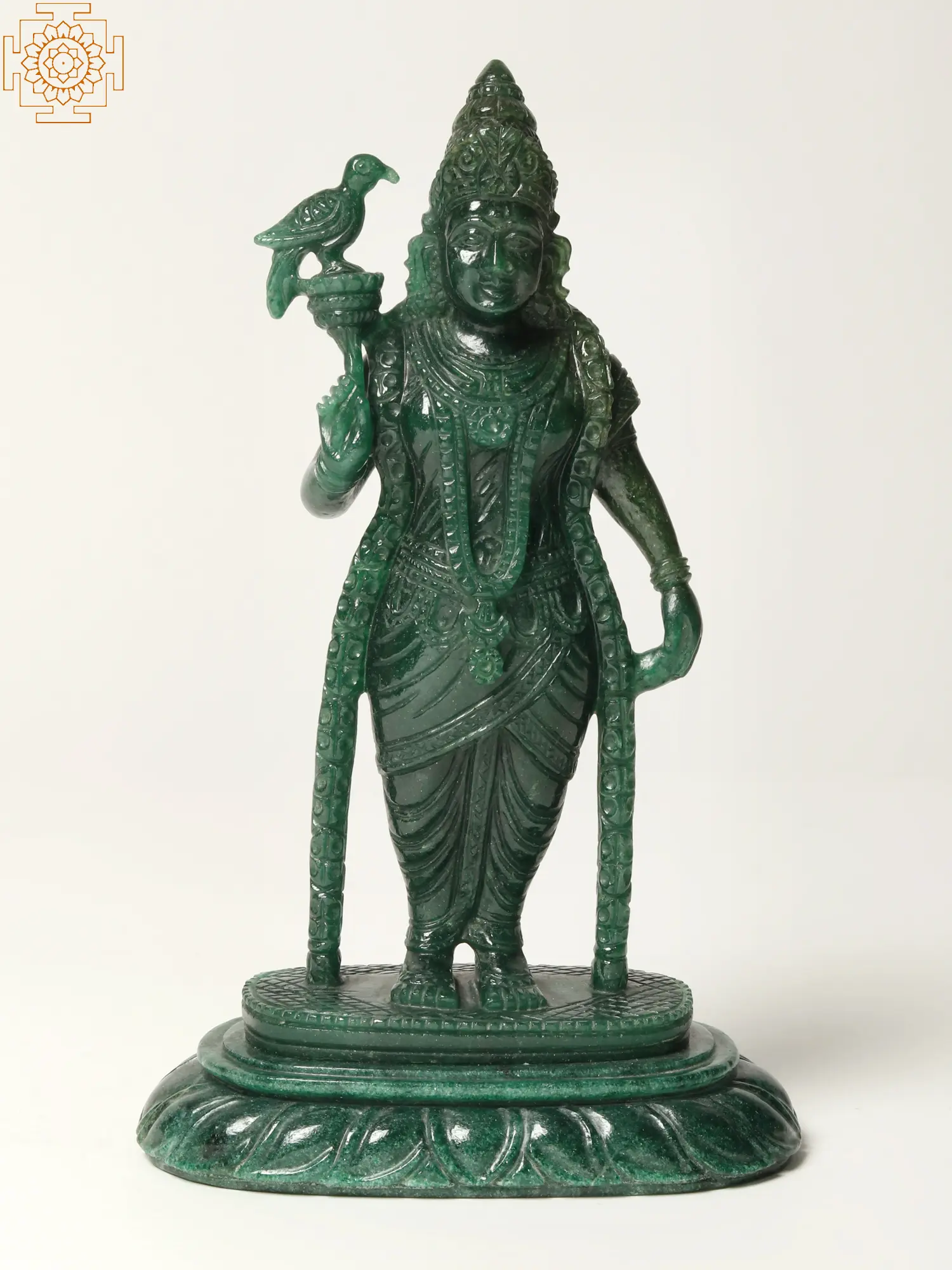 The heavenly green-skinned form of goddess Parvati, Meenakshiamman is artistically presented in this handmade aventurine statue. The stone aventurine is sought after as a potent source and attractor of feminine energies, strength, abundance, and prosperity in life, making it the ideal material for the sculpting of this icon. The divine mother Meenakshi stands on a marvelously delineated lotus pedestal, ornamented with an intricately detailed crown, jewelry, garland, and a lovely saree. Her left hand is dangling on her side in the Lolahasta mudra and her right hand holds her attributes- a lotus with a parrot perched on it.