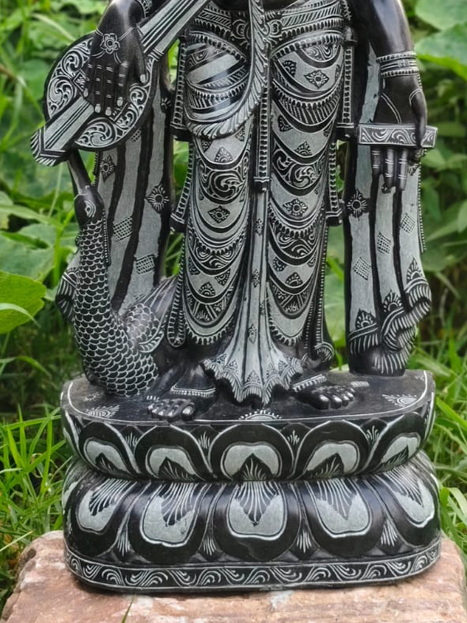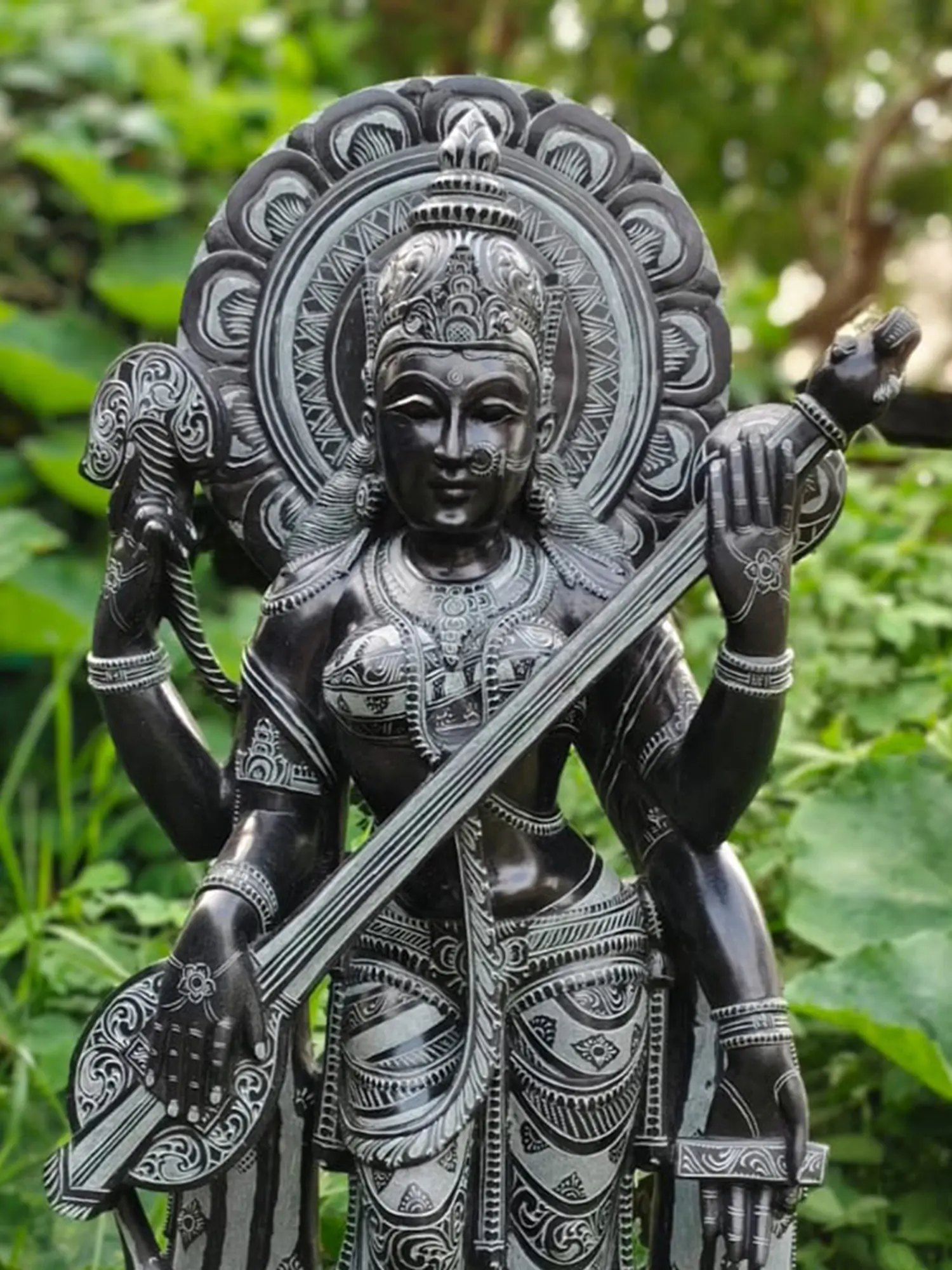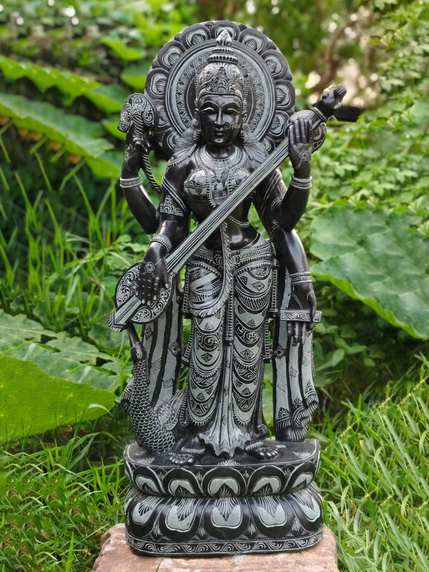 Crafted with remarkable attention to detail, this black stone statue is a testament to the enduring legacy of artisanal traditions, possibly drawing inspiration from the renowned stone carving styles of regions like Odisha. Its imposing size and dignified presence make it a perfect centerpiece for any temple, meditation room, study, or any space where the pursuit of knowledge, creativity, and spiritual growth is cherished. Inviting this divine form into your home is to invite inspiration, a deeper connection to the arts, and the blessings of wisdom. Let this stunning representation of Goddess Saraswati fill your environment with creativity, harmony, and the pursuit of higher learning.