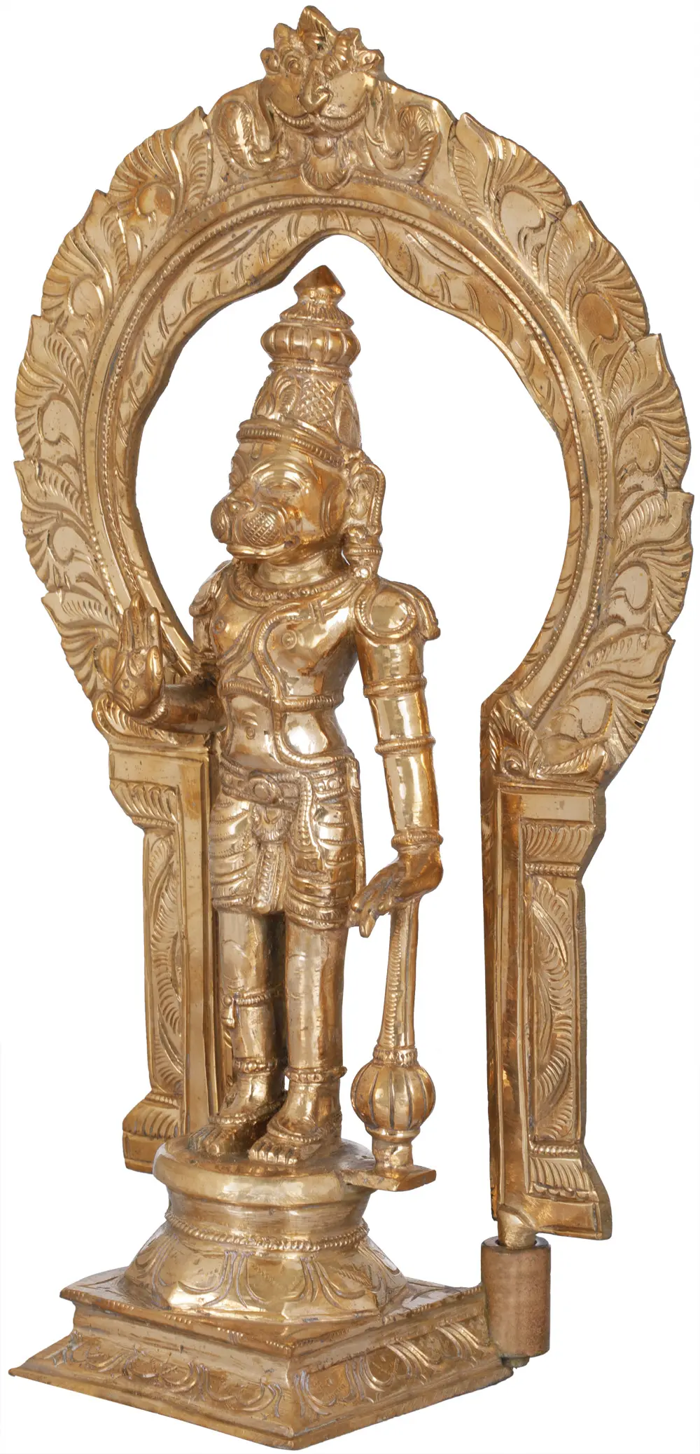 Lord Hanuman is the Hindu god of strength, celibacy, knowledge and bhakti; he serves as the best companion of god Rama and the central character of Ramayana. Here in this sculpture Hanuman stands on an inverted lotus pedestal and thick floral carved prabhavali that enhances his essence of divinity. Lord Hanuman’s dedicated and selfless service to his guru, Lord Rama is very well known by the entire universe; garbed in a short length pleated dhoti with his sacred weapon gada in his hand, he teaches all to work for good and abolish the evil.