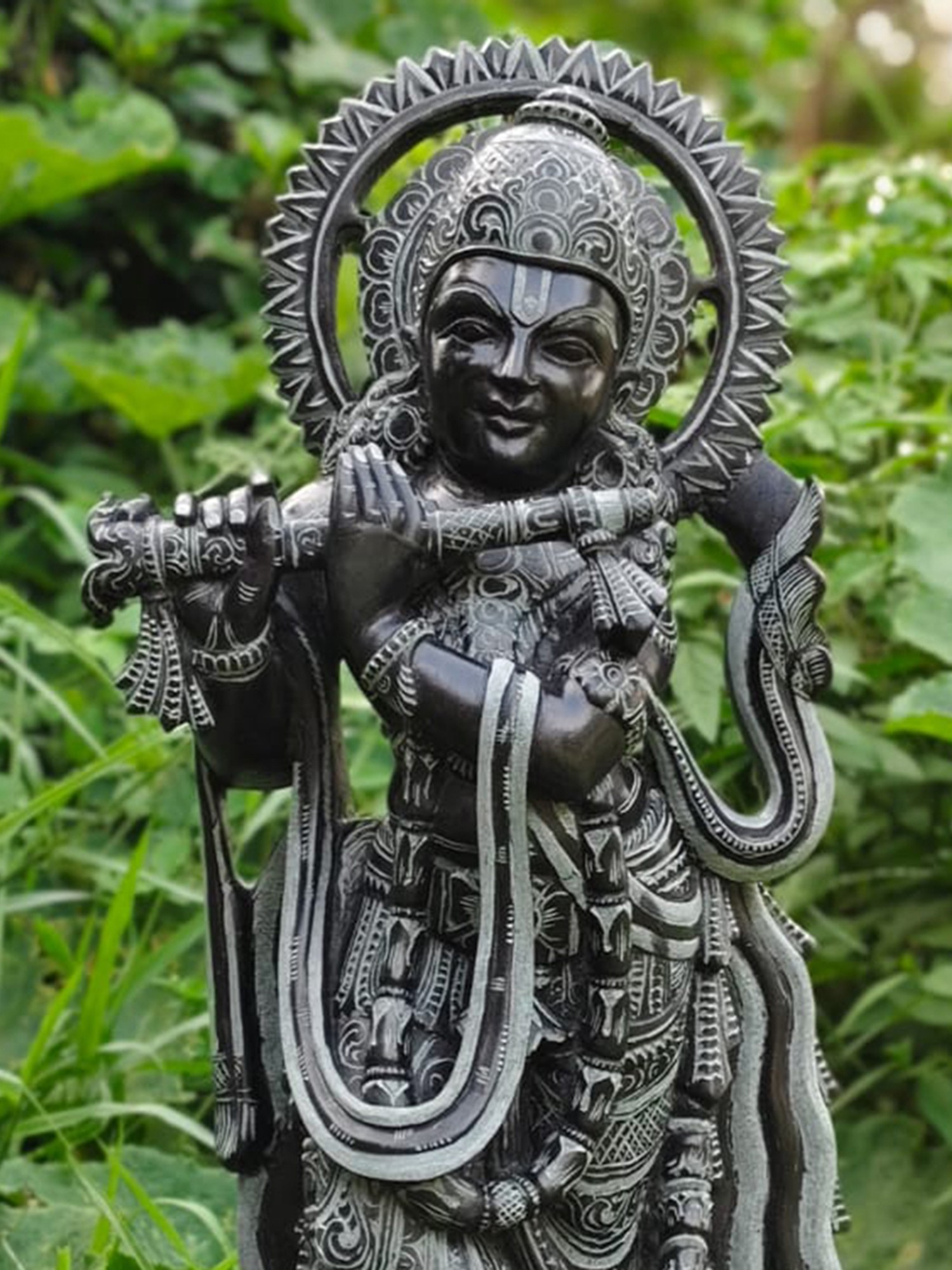 Originating from the skilled hands of artisans in Odisha, a region renowned for its rich tradition of stone carving, this statue is a testament to centuries-old techniques and artistic dedication. Each intricate detail, from the delicate carvings on Krishna's divine attire to the serene expression on his face, is meticulously rendered. The halo behind his head, a symbol of divinity, is adorned with a radial pattern, adding to the statue's majestic presence. The flowing robes and the subtle curve of his posture convey a sense of movement and life, as if the divine musician is about to grace the world with his presence.
