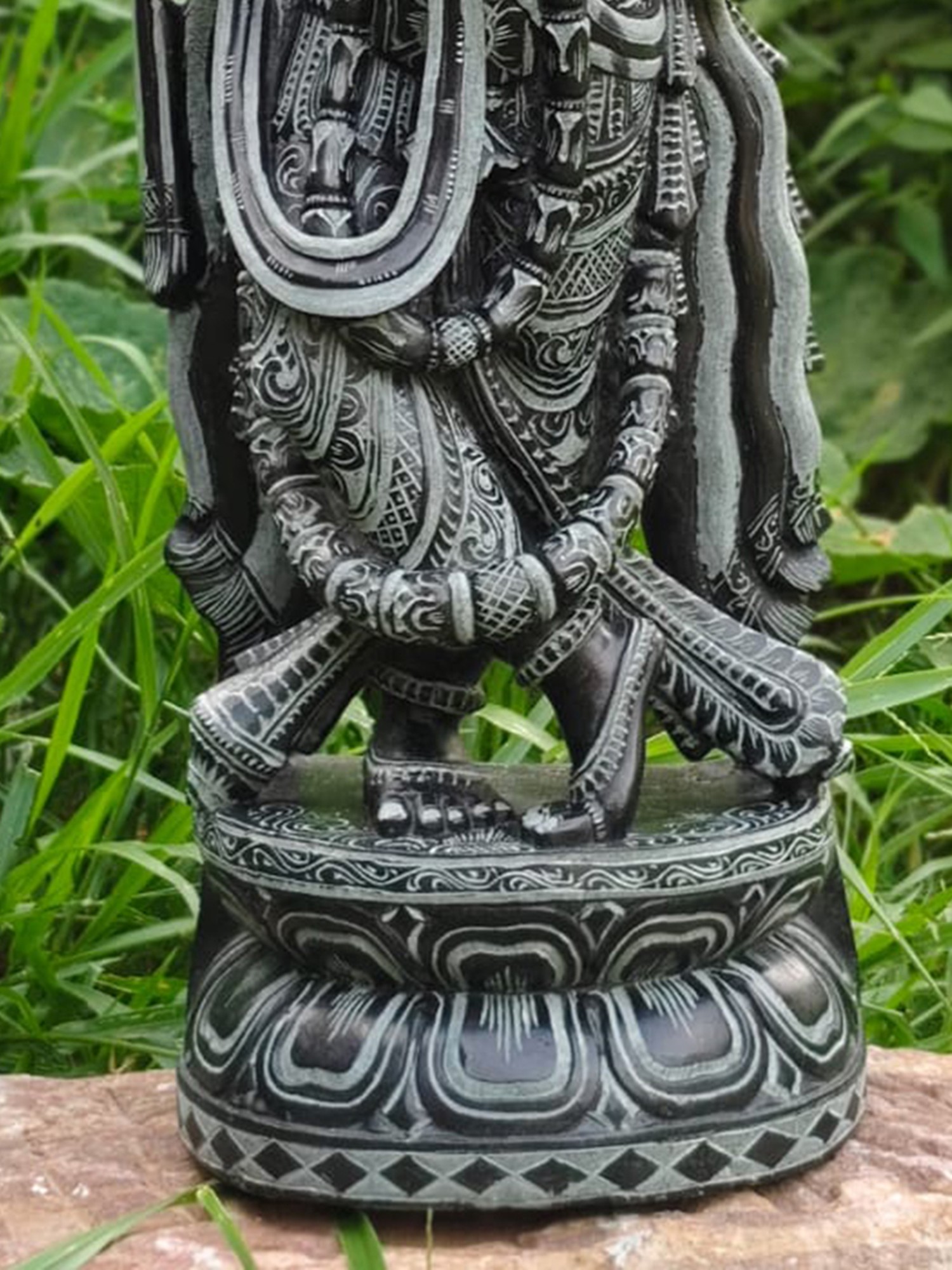 This black stone statue of Krishna playing the flute is more than just a decorative piece; it is a profound symbol of devotion, a conduit for spiritual contemplation, and a celebration of artistic mastery. The natural beauty of the black stone, combined with the intricate carving, creates a timeless piece that will resonate with beauty and spirituality for generations to come. Whether placed in your home temple, meditation room, or as a statement piece in your living space, this statue offers a constant reminder of the divine harmony and loving presence that Lord Krishna embodies. Let the gentle gaze and the poised flute of this magnificent carving bring peace, joy, and spiritual inspiration into your life.