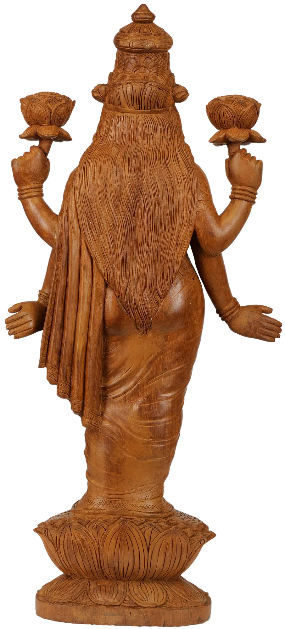 Kerala, known as "God's Own Country," has a rich artistic heritage, particularly in wood carving. The artisans of Trivandrum have preserved their ancestral skills, passed down through generations. Teakwood, valued for its durability and beautiful grain, is a favored medium. The creation of this statue reflects the dedication and devotion of the craftsman, who infuse the wood with reverence and artistry. The delicate detailing of the Goddess’s adornments, the flowing lines of her sari, and the serene expression on her face demonstrate the mastery of the artisans. Each curve, contour, and embellishment is carefully rendered, making this piece a unique and timeless work of art.