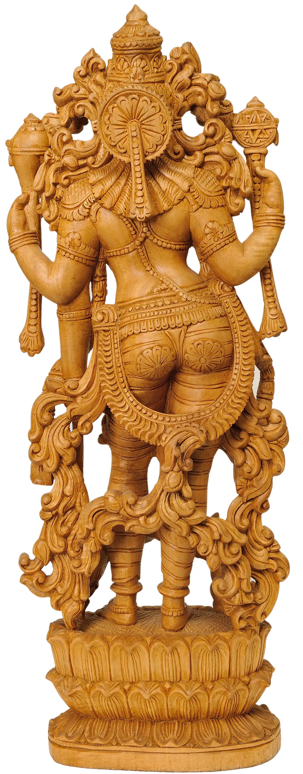 Gaze upon this exquisite wood carving, a testament to the divine presence of Lord Vishnu, the preserver and protector of the universe in Hindu mythology. Crafted with meticulous detail from select White Cedar wood sourced from the lush regions of Trivandrum, this statue captures the benevolent and formidable essence of the Supreme Being. The warm, natural tones of the wood lend an aura of serenity and timelessness, making this piece a captivating focal point for any sacred space or discerning collection. Lord Vishnu, often depicted with four arms, symbolizes his omnipresence and ability to perform multiple tasks simultaneously. In this magnificent rendition, each attribute held signifies a specific aspect of his divine power. The discus, or Sudarshana Chakra, represents the power to destroy evil and uphold righteousness. The conch shell, or Shankha, signifies the primordial sound of creation and the announcement of victory. The mace, or Gada, embodies strength and authority, while the lotus flower, held gently in another hand, symbolizes purity, beauty, and spiritual awakening. The intricate details of his celestial ornaments, the serene expression on his face, and the flowing fabric of his attire speak volumes about the artisan's skill and devotion. ––––––––––