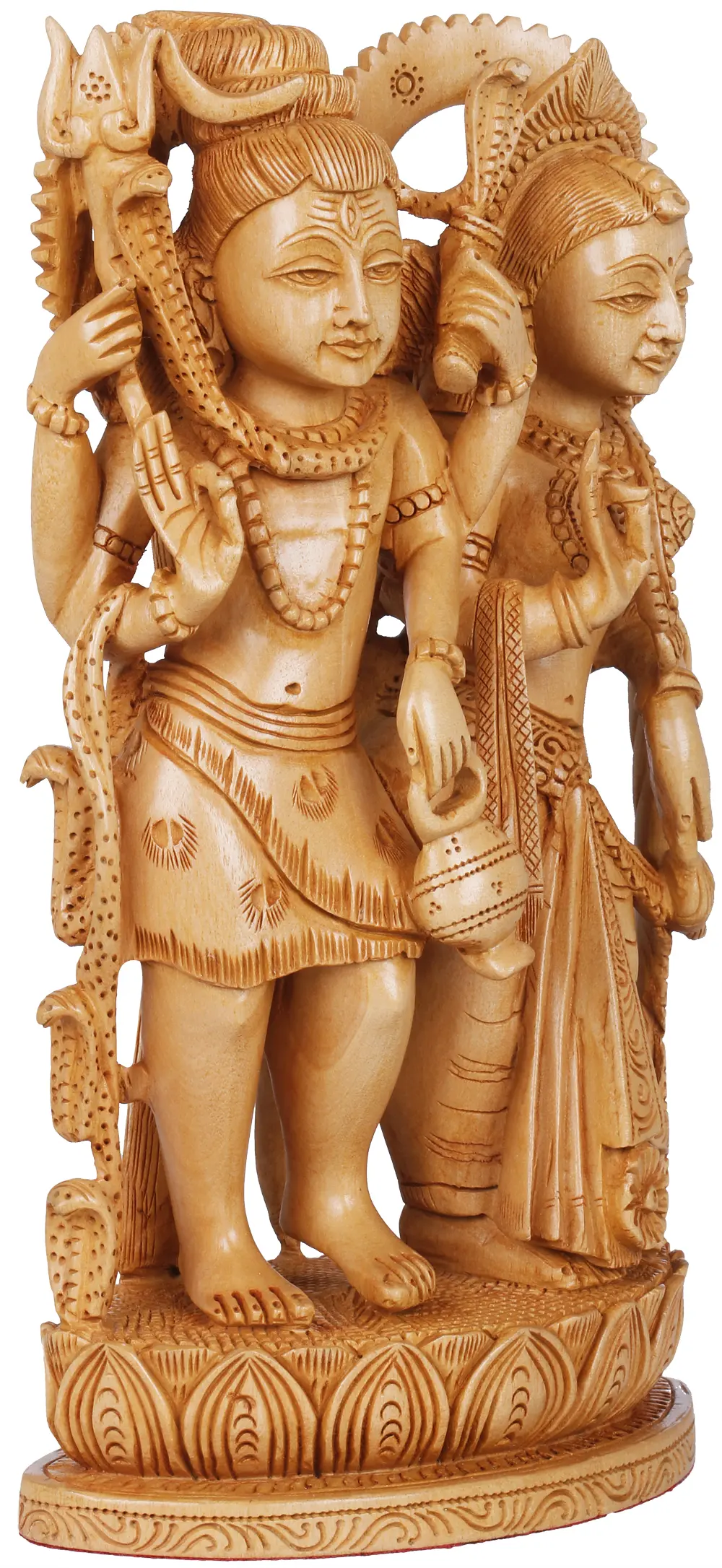 Lord Shiva is in His characteristic tigerskin loincloth. A bunch of snakes is His only adornment, besides the multitude of rudrakshas on His arms and torso. In one of His hands He holds a dotted kamandalu, without which no picture of the ascetic is complete. His wife, the beauteous Devi Parvati, is in a silk dhoti and gold shringar. She holds in Her delicate hand the lotus of compassion as She looks on at the realm of existence beneath Her heavenly abode. While Her hair is parted in traditional style down the centre and held back with a classical tiara, His is gathered in coils on the top of His head in keeping with the conventional iconography of Lord Shiva.
