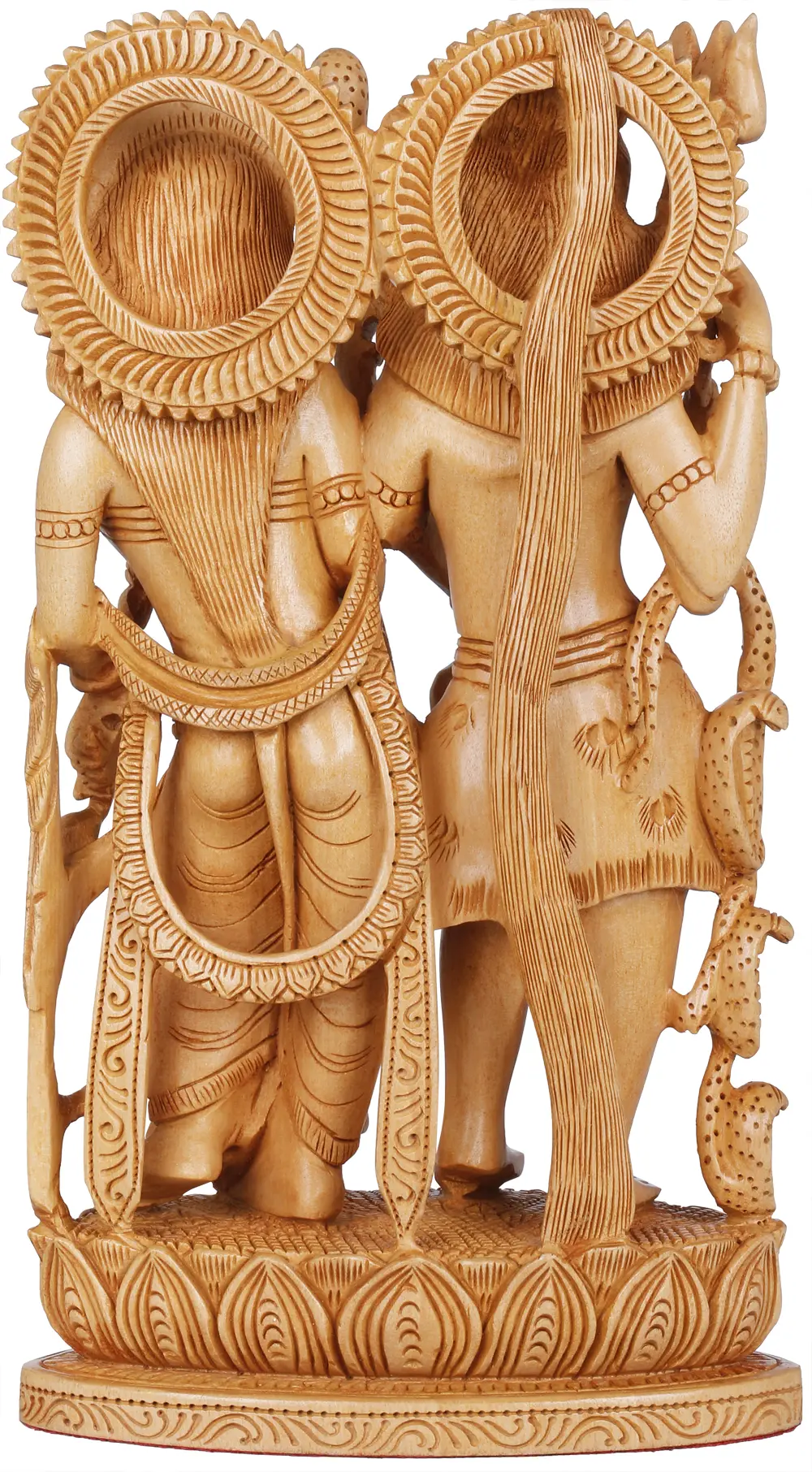 The couple is standing on a lotus pedestal carved with great finesse. It is in full bloom, its spaced-out petals engraved with dense lines along the edges and centre.