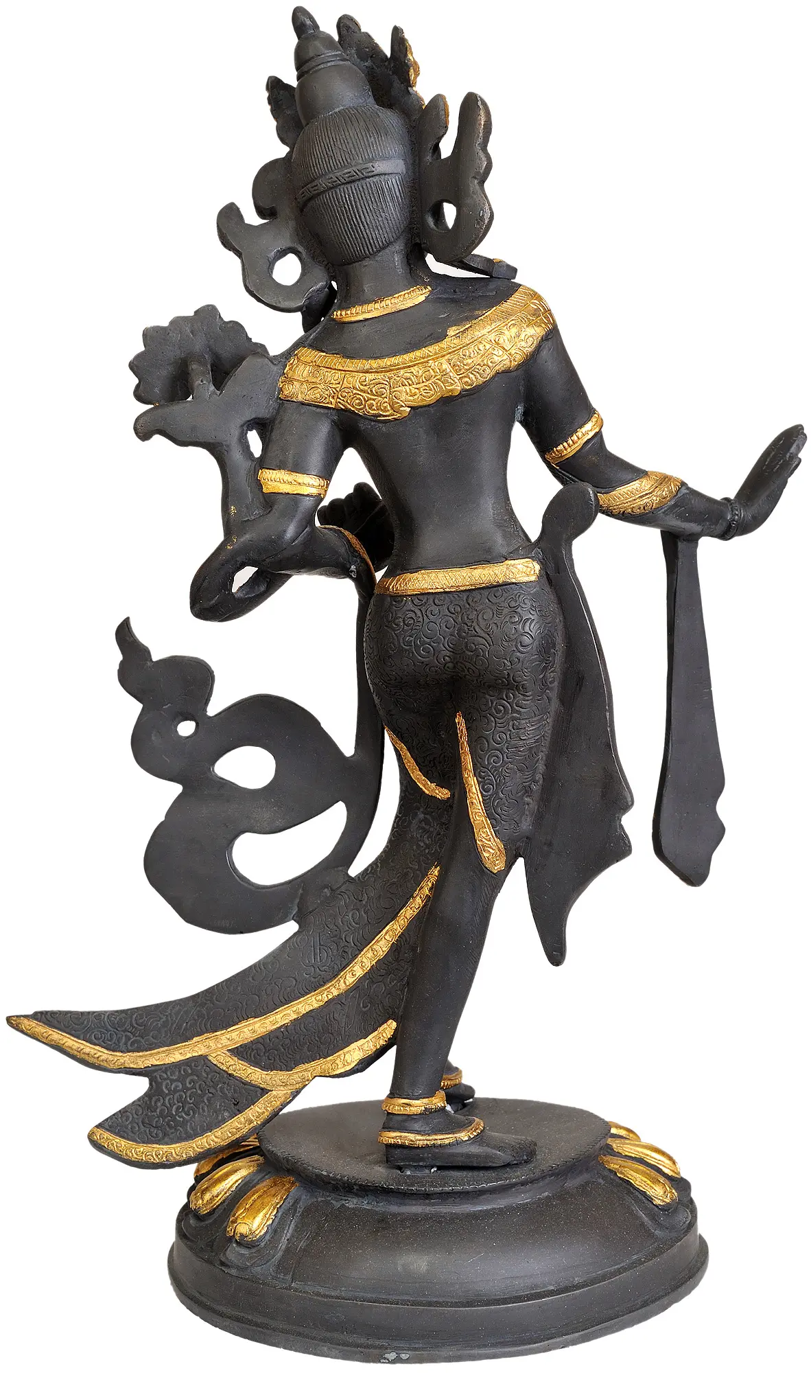 The artistry of this piece captures the profound essence of Tara's attributes. The ornate crown and delicate jewelry adorning her person are meticulously crafted, gleaming with auspicious gold. Her facial features are serene yet powerful, with eyes that convey deep empathy and boundless compassion. The flowing drapery cascading around her, also highlighted with intricate golden patterns, adds a sense of ethereal movement, as if she has just alighted from the heavens. Each fold and swirl speaks of her swift and effortless intervention in the world. According to legend, Tara manifested from a teardrop of the compassionate Avalokiteshvara, who wept upon witnessing the suffering of the world. Her immediate emergence as a fully enlightened being underscores her swiftness in responding to distress. She is seen as a motherly figure, nurturing and protective, guiding her followers through the challenges of life and death towards spiritual awakening. The dark hue of her skin is often associated with the deep, all-pervading nature of her wisdom and her ability to cut through delusion. ––––––––––