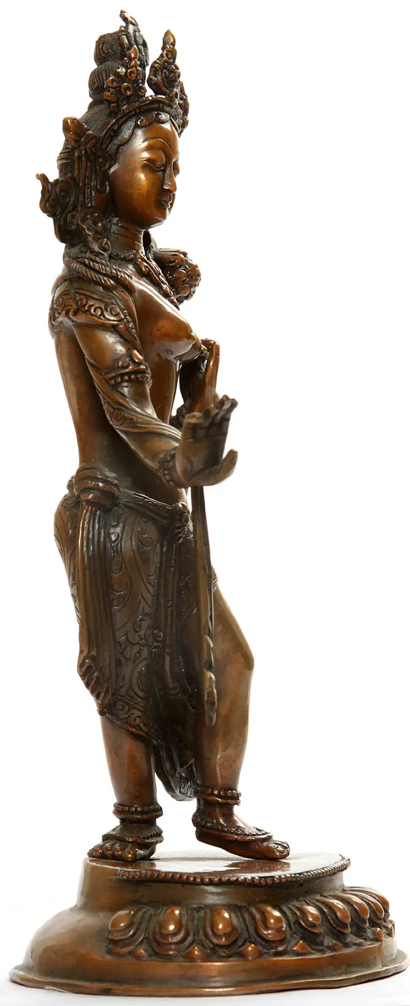 Crafted from copper, this statue captures the essence of a beloved figure in Buddhist traditions. The statue stands with a gentle sway, radiating serenity and grace. Her hands are positioned in meaningful mudras. One hand extends outwards, signifying giving and openness, while the other delicately holds a lotus flower, a symbol of purity, enlightenment, and spiritual awakening. The lotus, rising from muddy waters, represents the potential for all beings to achieve liberation. Her serene expression and downcast eyes invite contemplation and inner peace.