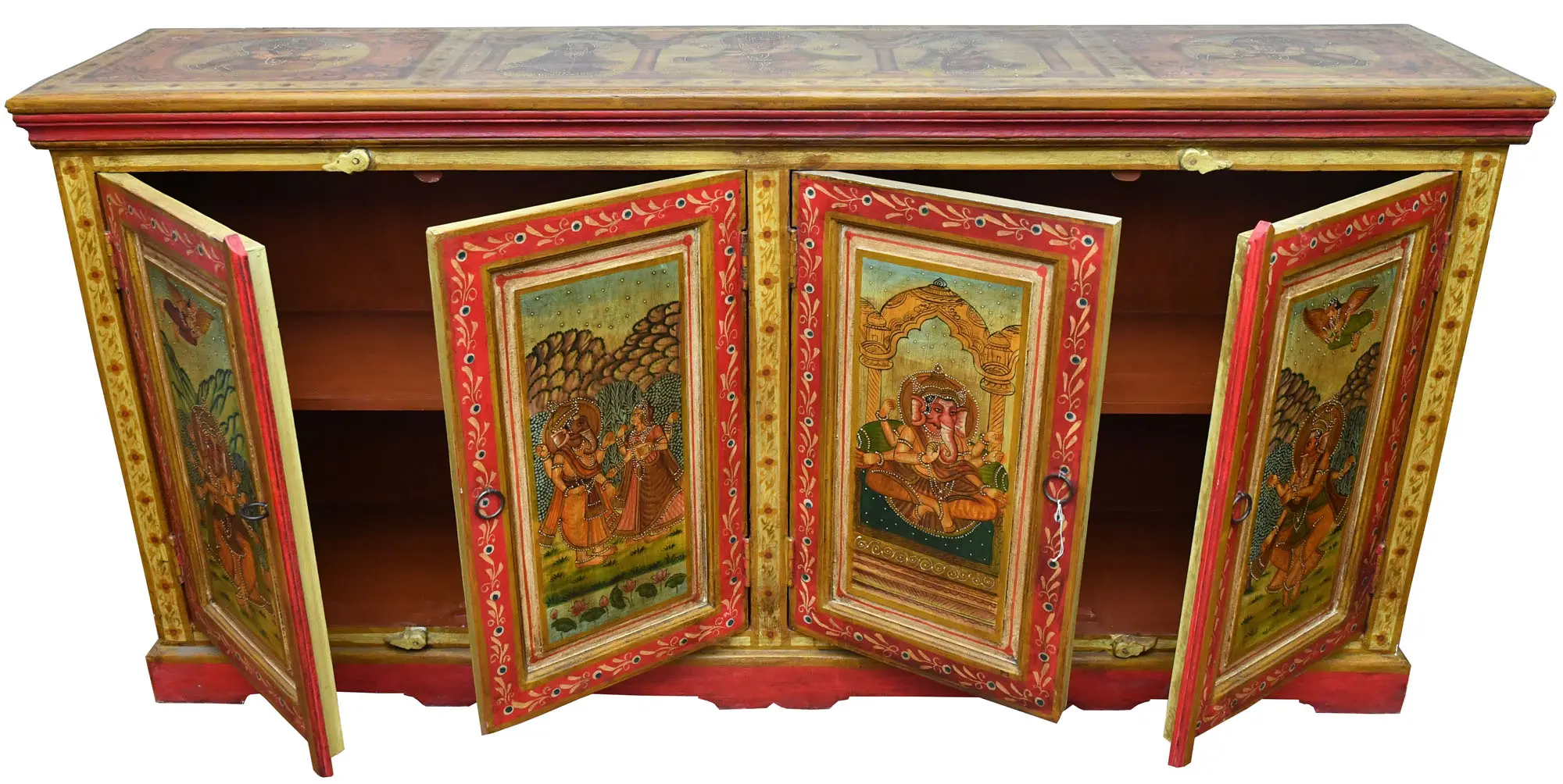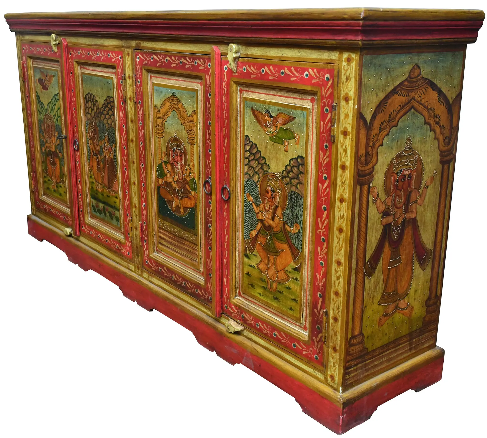 Invite the blessings and wisdom of Lord Ganesha into your home with this magnificent, hand-painted wooden cupboard. More than just a piece of furniture, this cupboard is a testament to the rich artistic heritage of India, beautifully depicting the elephant-headed deity in various revered forms. Each of the four doors is a canvas, adorned with vibrant scenes that capture the essence of Ganesha, the remover of obstacles and the patron of arts and sciences. The craftsmanship of this cupboard is evident in every detail. The wood is expertly carved and finished, providing a sturdy and elegant structure. The hand-painted motifs are a feast for the eyes, featuring intricate floral borders in striking reds and gold, framing the central Ganesha panels. These panels showcase Ganesha not only as a solitary figure but also in companionship, perhaps hinting at his divine family or his role as a guide in life's journeys. The use of rich pigments and meticulous brushwork brings these ancient stories to life, making each glance a moment of contemplation.