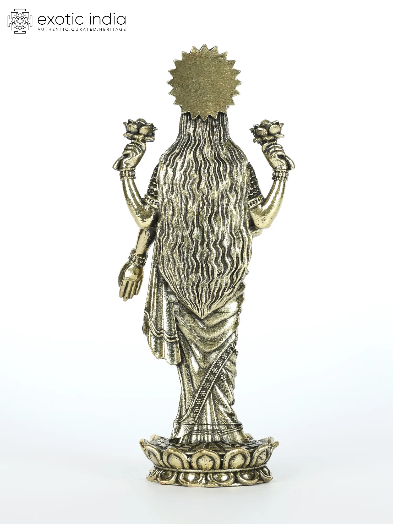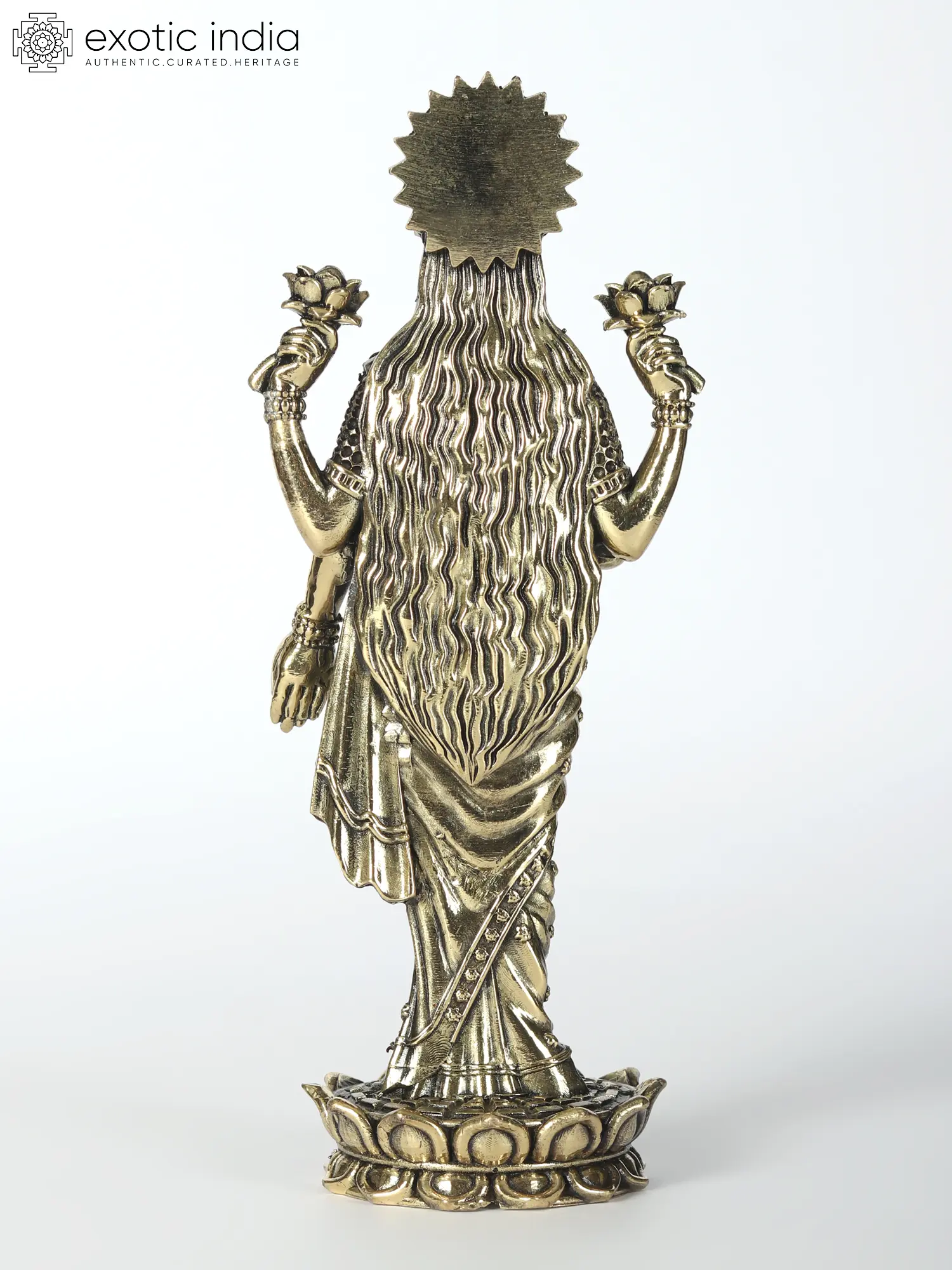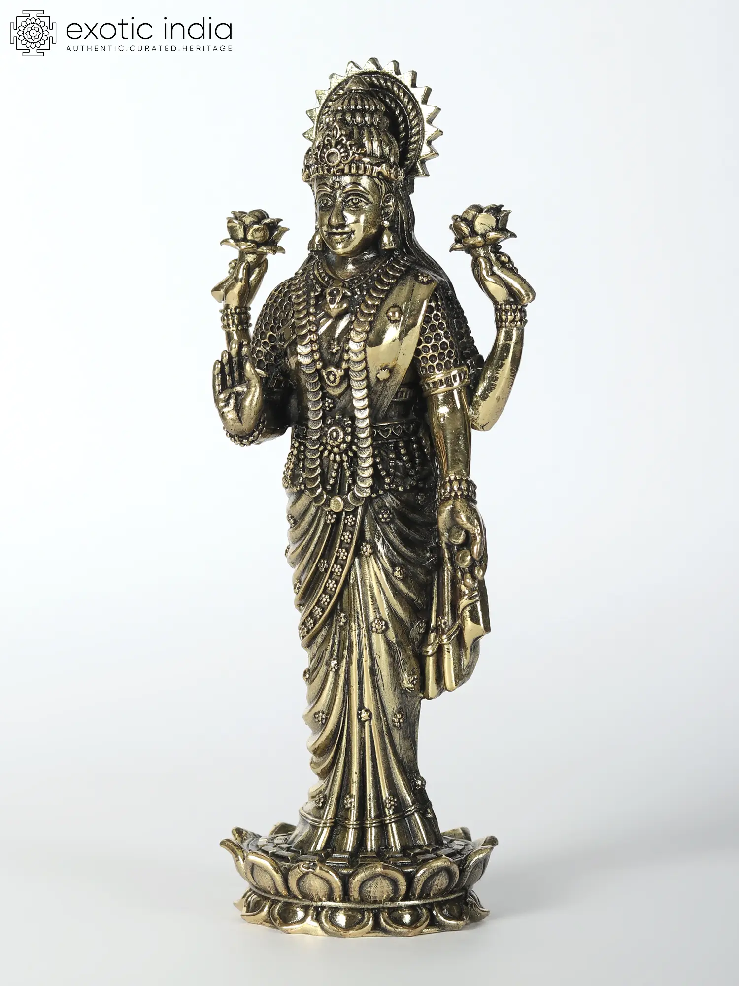 A murti of goddess Lakshmi in your place of worship is a powerful presence of the great goddess and a source of auspiciousness eternal. This superbly crafted, superfine brass statue makes for a divine icon for your Puja ghar, depicting the heavenliness of Sri Lakshmi in the most exquisite iconography. Goddess Lakshmi stands on a finely delineated lotus, wrapped in a lovely saree whose folds are realistically captured in metal. Charming floral motifs, a bejwelled girdle, a necklace of gold coins, gemmed ornaments, an ornate waistband, and the regal crown of the goddess are depicted with such meticulousness, that the icon achieves an iconic effect not because of their scale but because of its elaborateness.