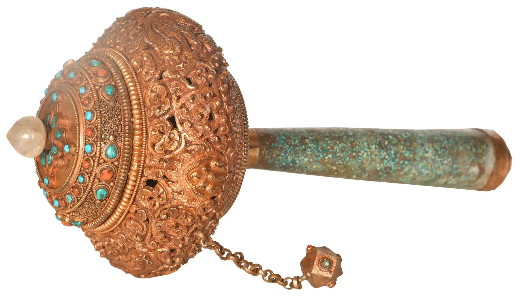 Each element of this prayer wheel has been thoughtfully chosen for its symbolic meaning and aesthetic beauty. The primary body is sculpted from lustrous copper, a metal revered for its conductive properties and its association with warmth and vitality. Adorning its surface is a breathtaking mosaic of vibrant gemstones, including the deep blues and greens of turquoise, symbolizing wisdom, healing, and protection, and the fiery reds of coral, representing life force, passion, and courage. These precious stones are meticulously set into the ornate copperwork, creating a rich and visually stunning tapestry that catches the light and draws the eye. The handle is similarly encrusted, offering a comfortable and grounding grip as you engage in your meditative practice. At the very end of the handle, a delicate, clear crystal finial rests, amplifying positive energy and reflecting the clarity of mind sought through prayer.
