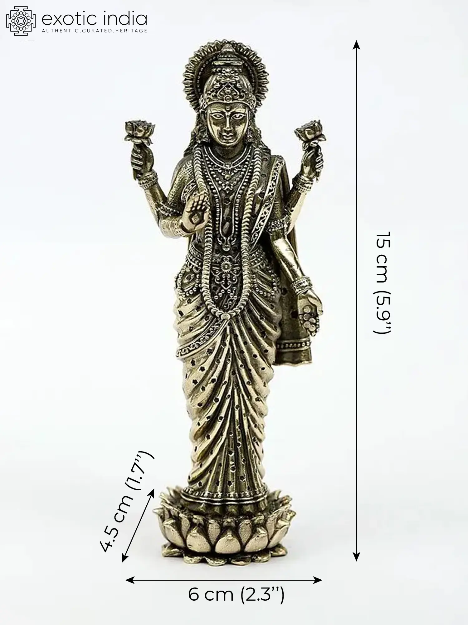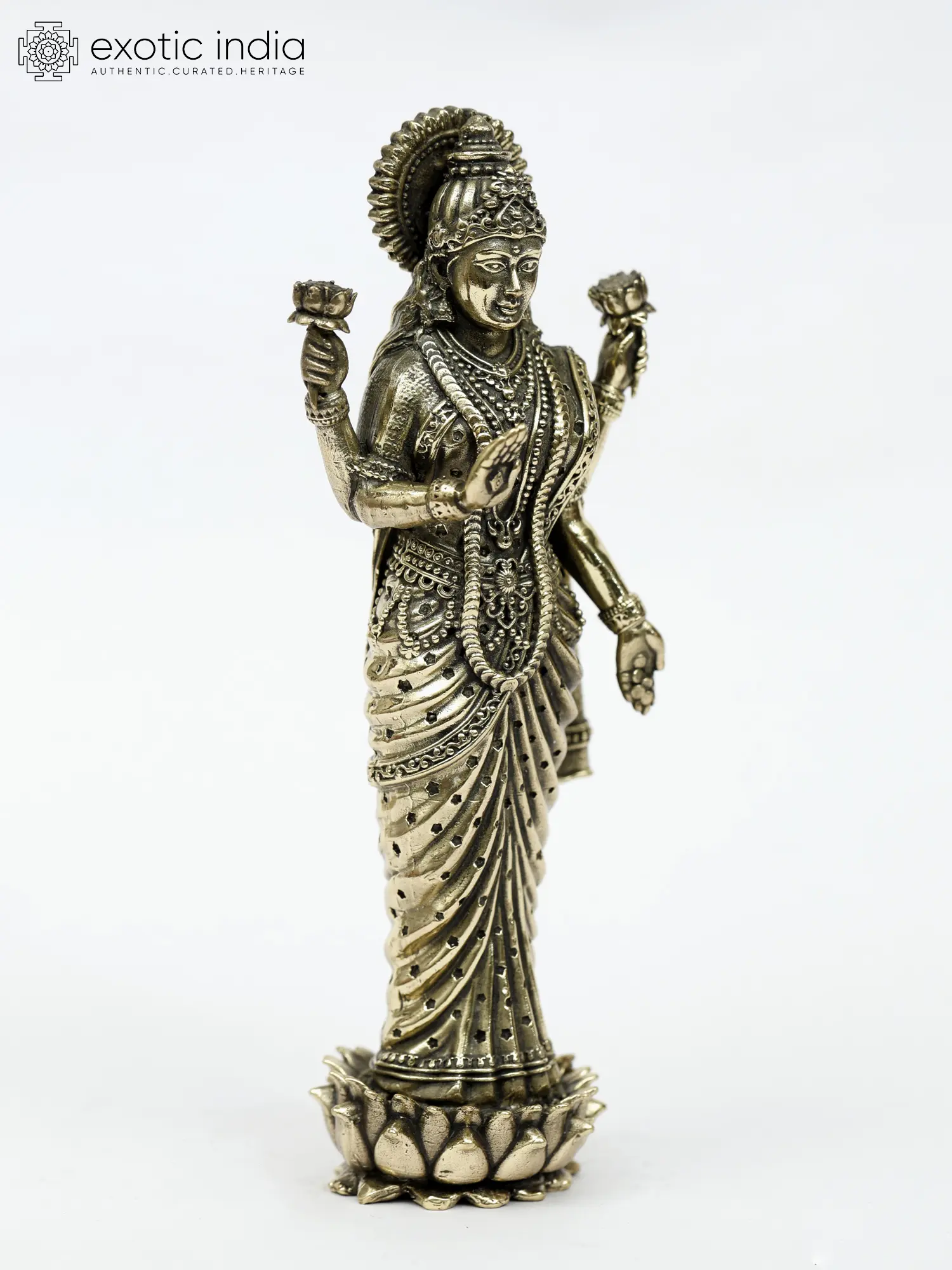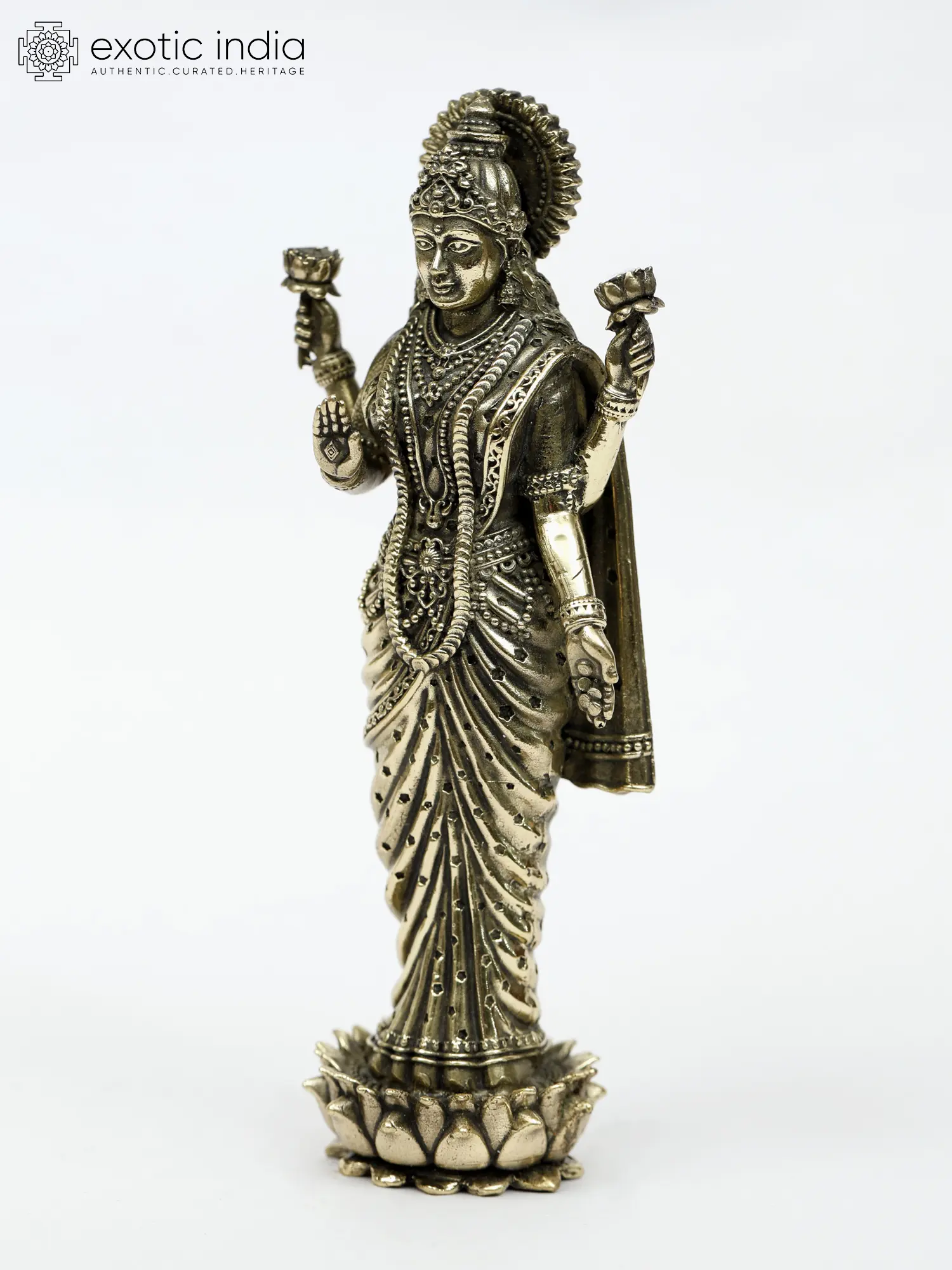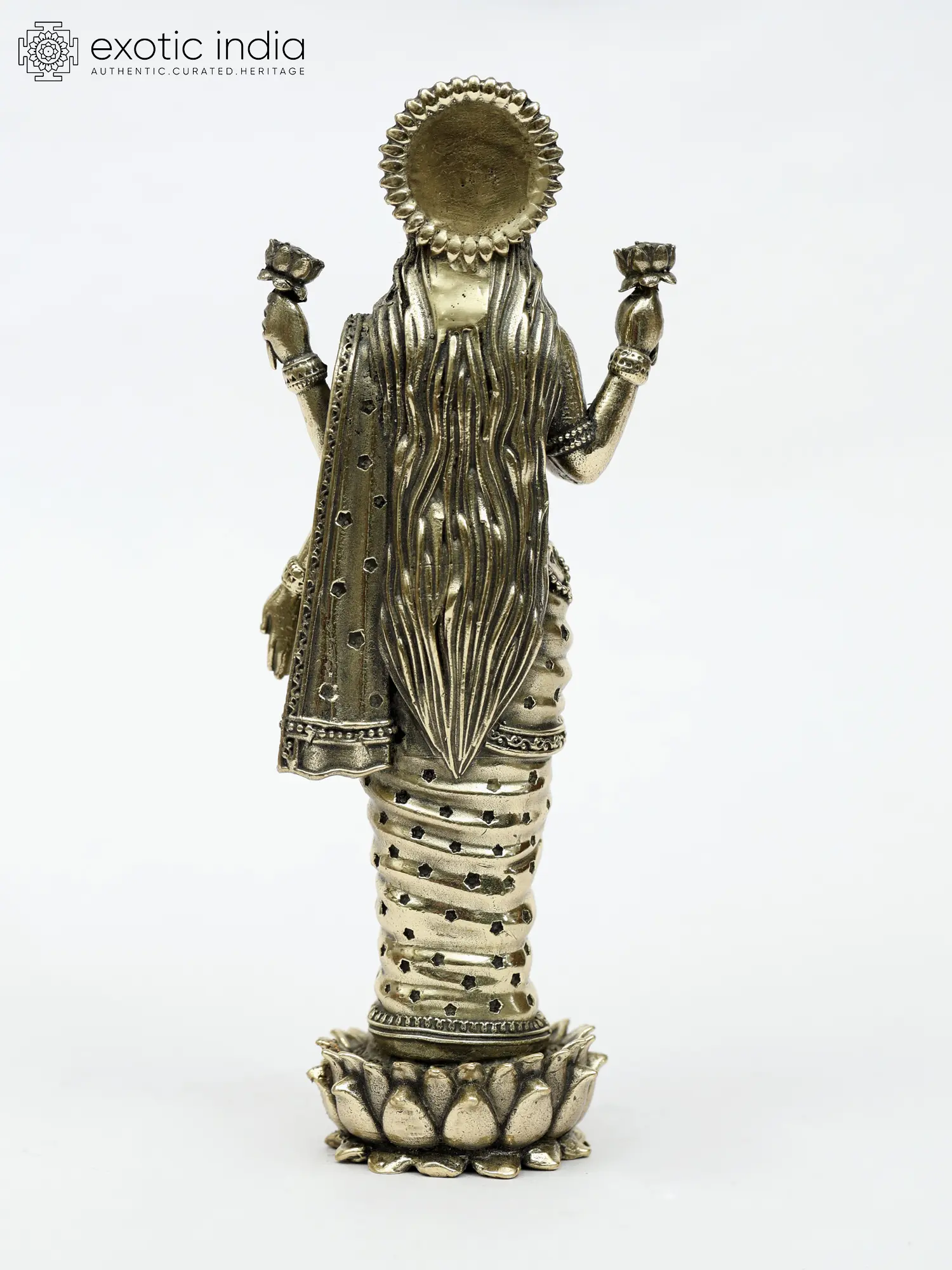 Her hands hold lotus flowers, representing beauty and fertility, while her other hands are in Abhaya Mudra and Varada Mudra, symbolizing protection and the granting of boons. The brass material lends a timeless, antique look, enhancing its divine appeal.