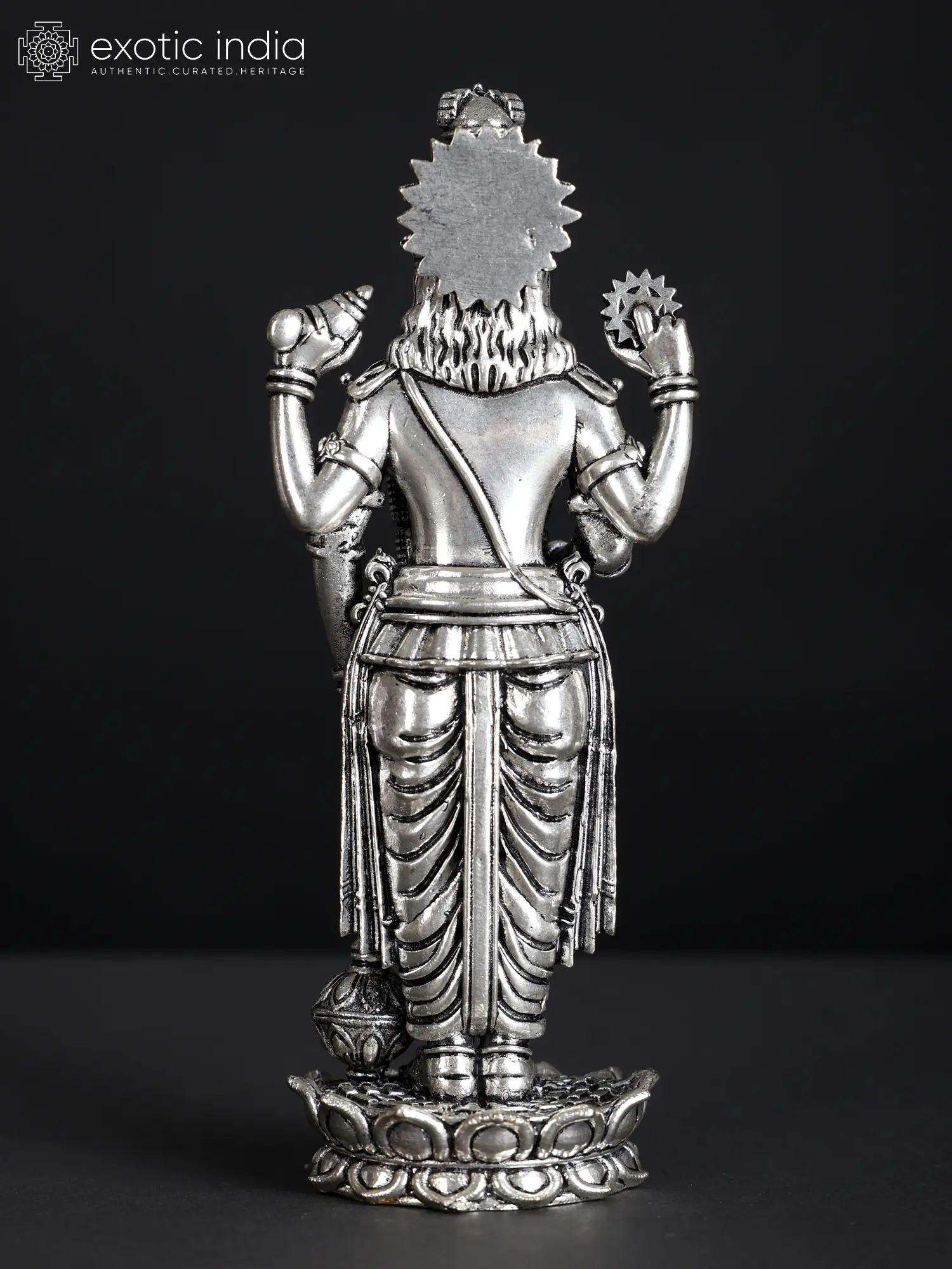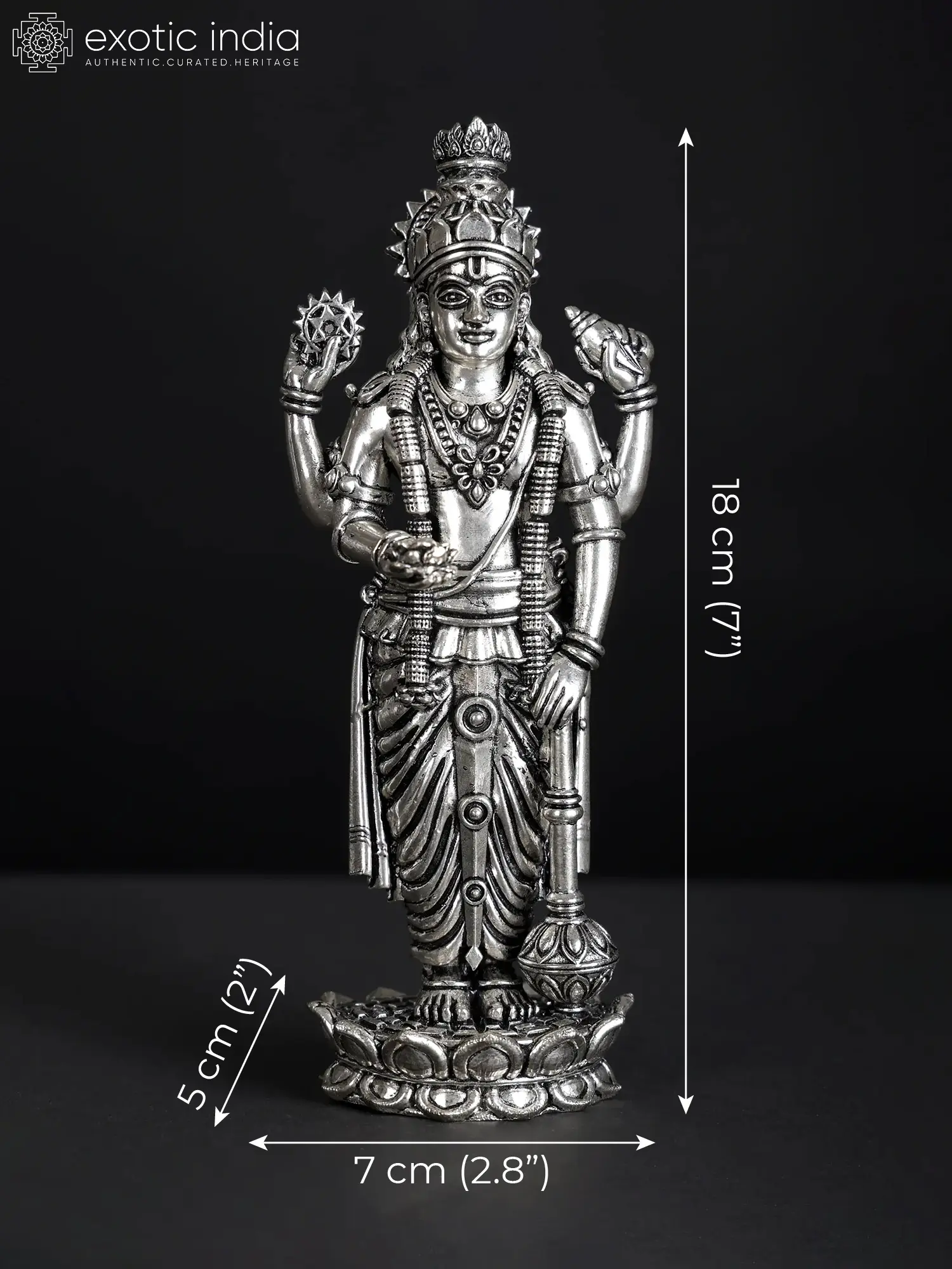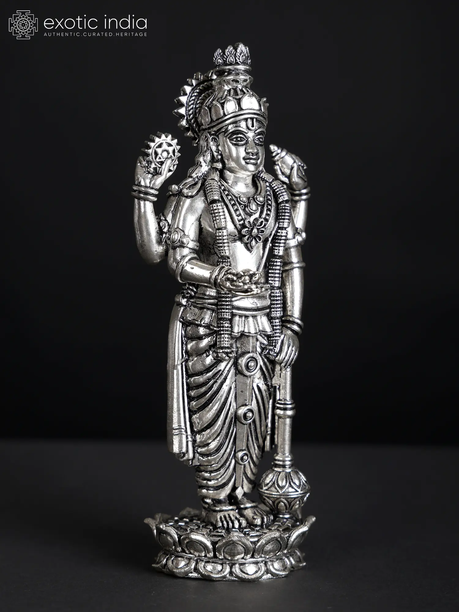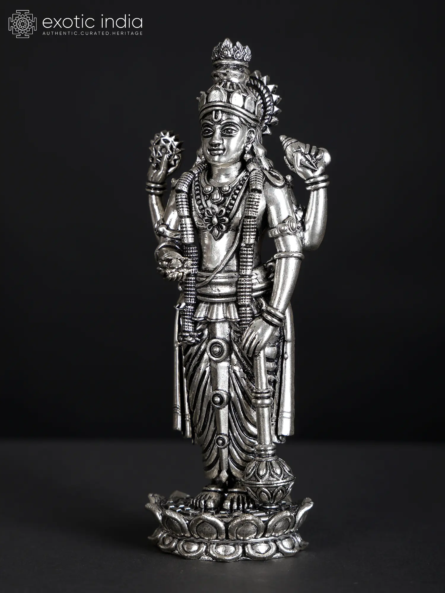 Holding weapons of cosmic power and a delicate lotus in her hands, the Chaturbhuja (four-armed) Vishnu Narayana, in this small brass icon is the divine parent, the guardian of all beings. In an auspicious upright pose that symbolizes his active nature, Vishnu is adorned with a peacock feather crown, garland, and a flowing dhoti. With his lotus eyes gazing at the devotee, this icon is infused with life, perfect for the place of worship.