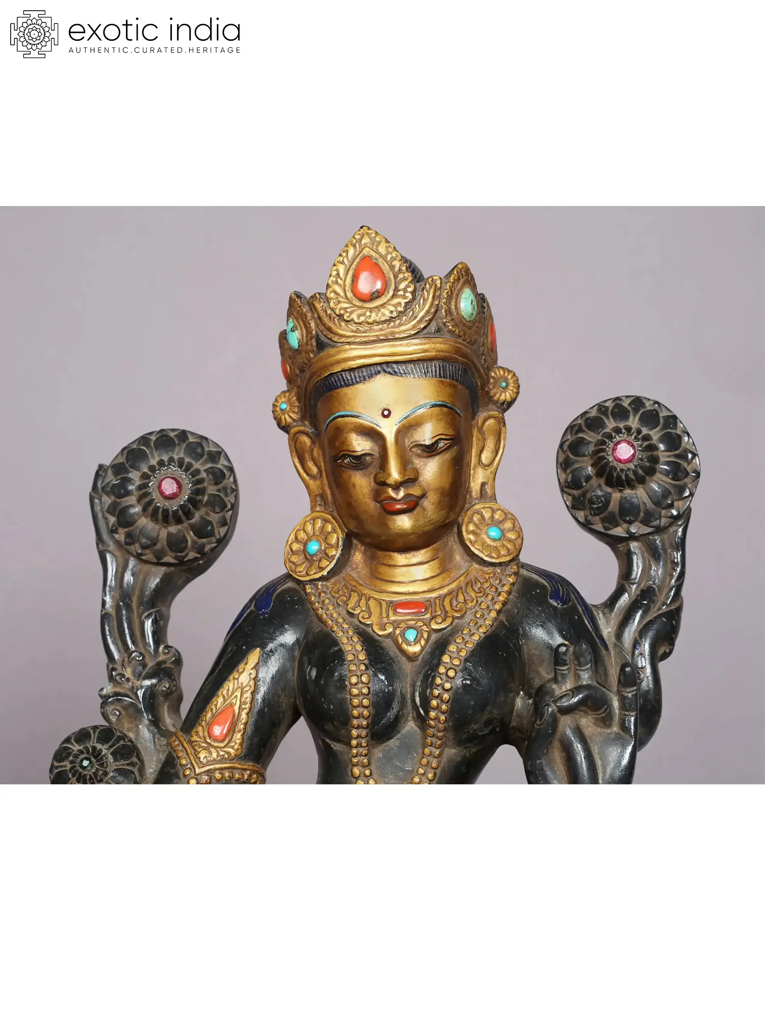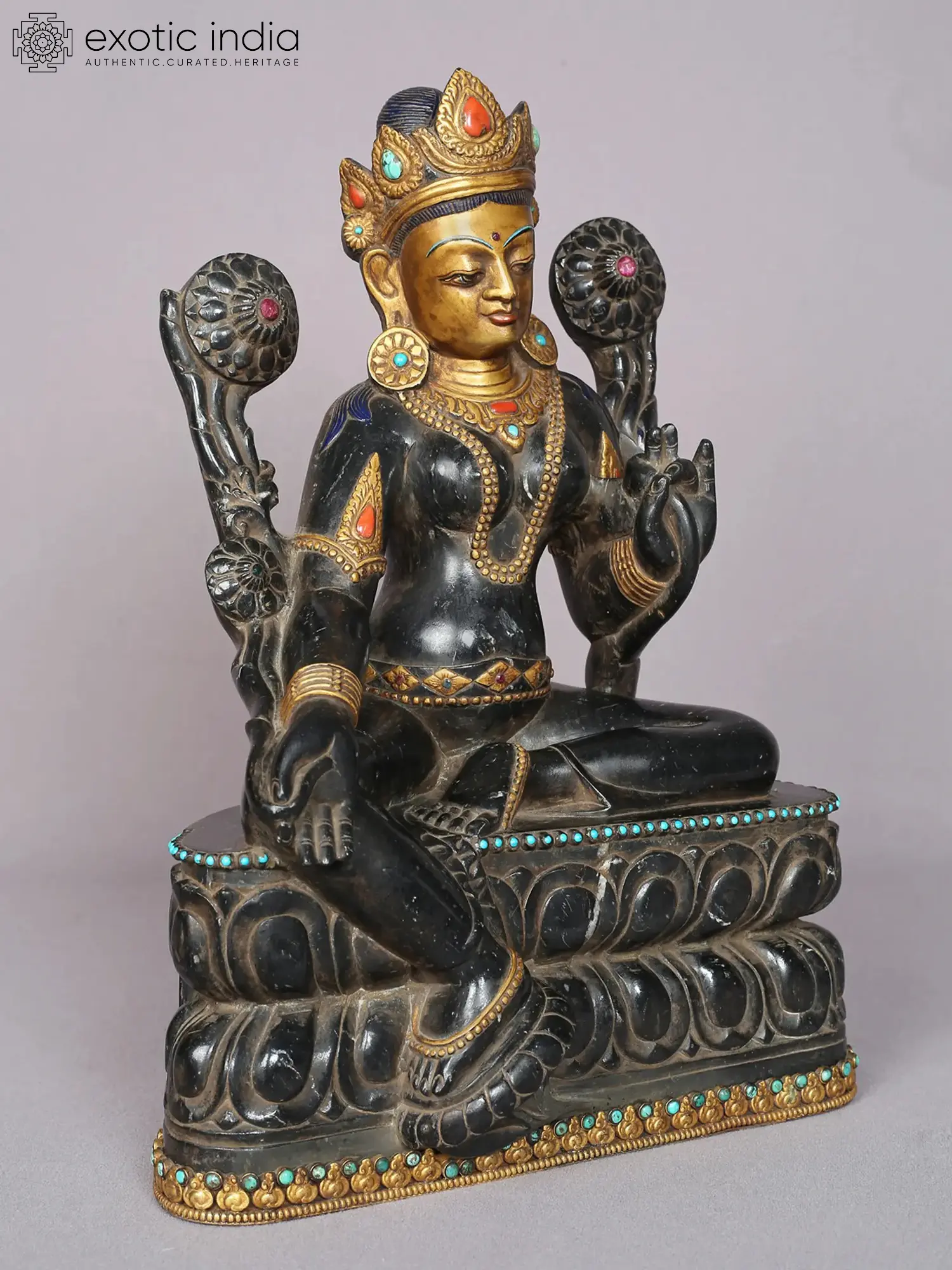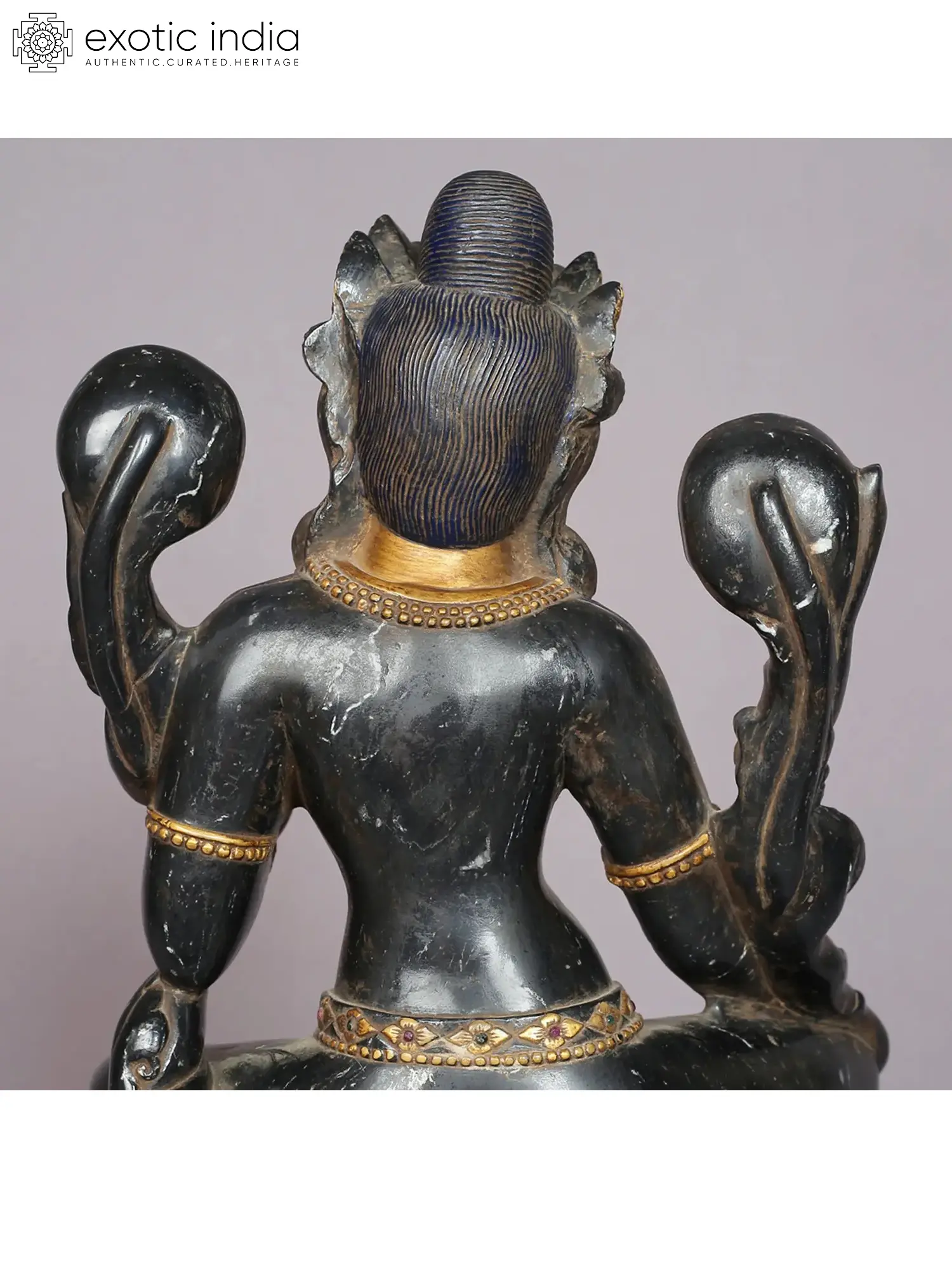 Green Tara in Nepalese Buddhism is often evoked as Shyama Tara or the dark Tara, owing to the deep green hues of her divine body. In this black stone statue from Nepal, the mystical form of Tara has received a fitting representation. With her surreal eyes, the benevolent Green Tara gazes at her devotees from her heavenly abode, surrounded by her attributes, the lotuses, and adorned by exquisite gold ornaments. The contrast of gold and black has given the statue a distinctive allure, making it a superb composition for the worshippers of Tara.