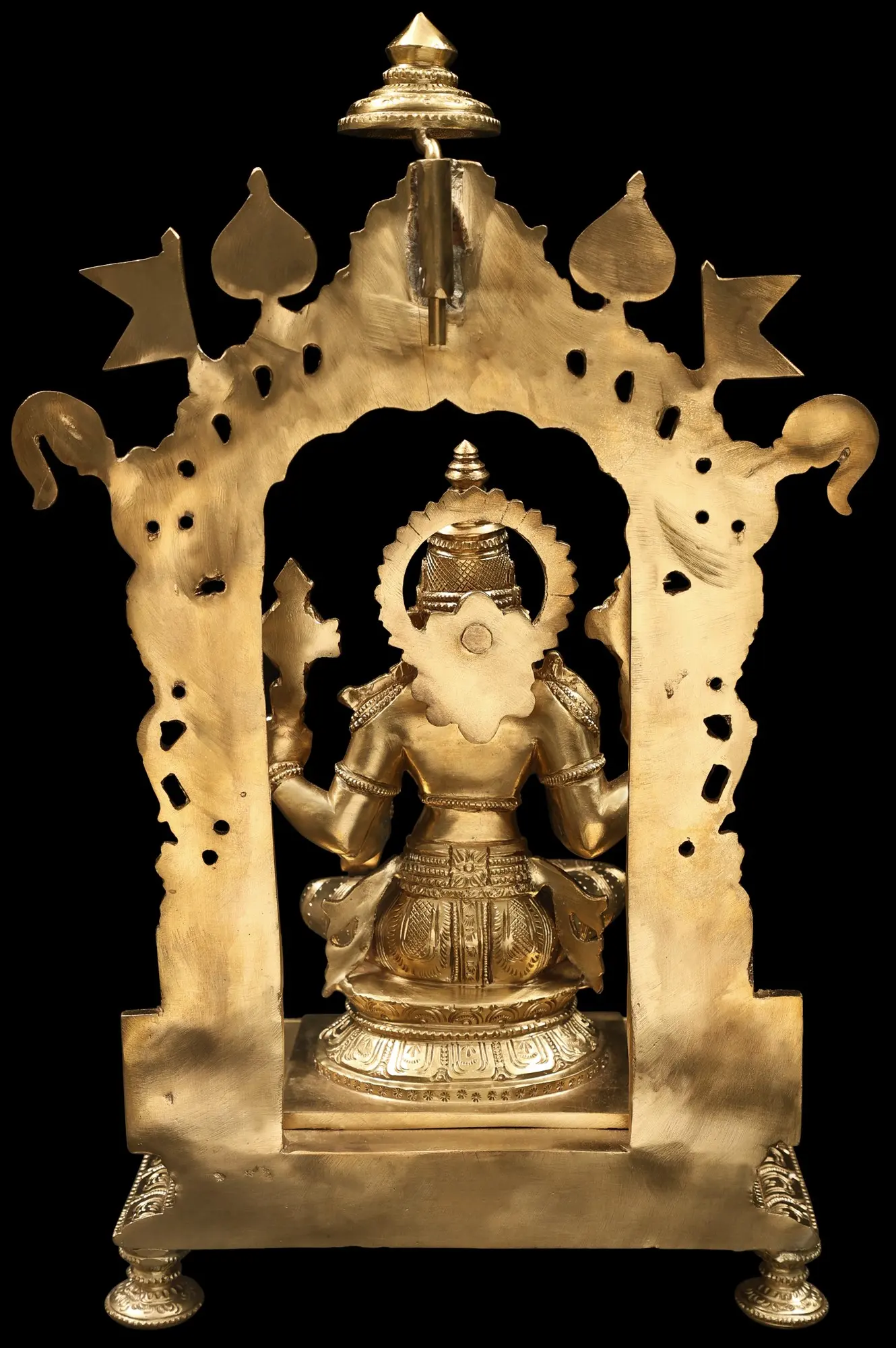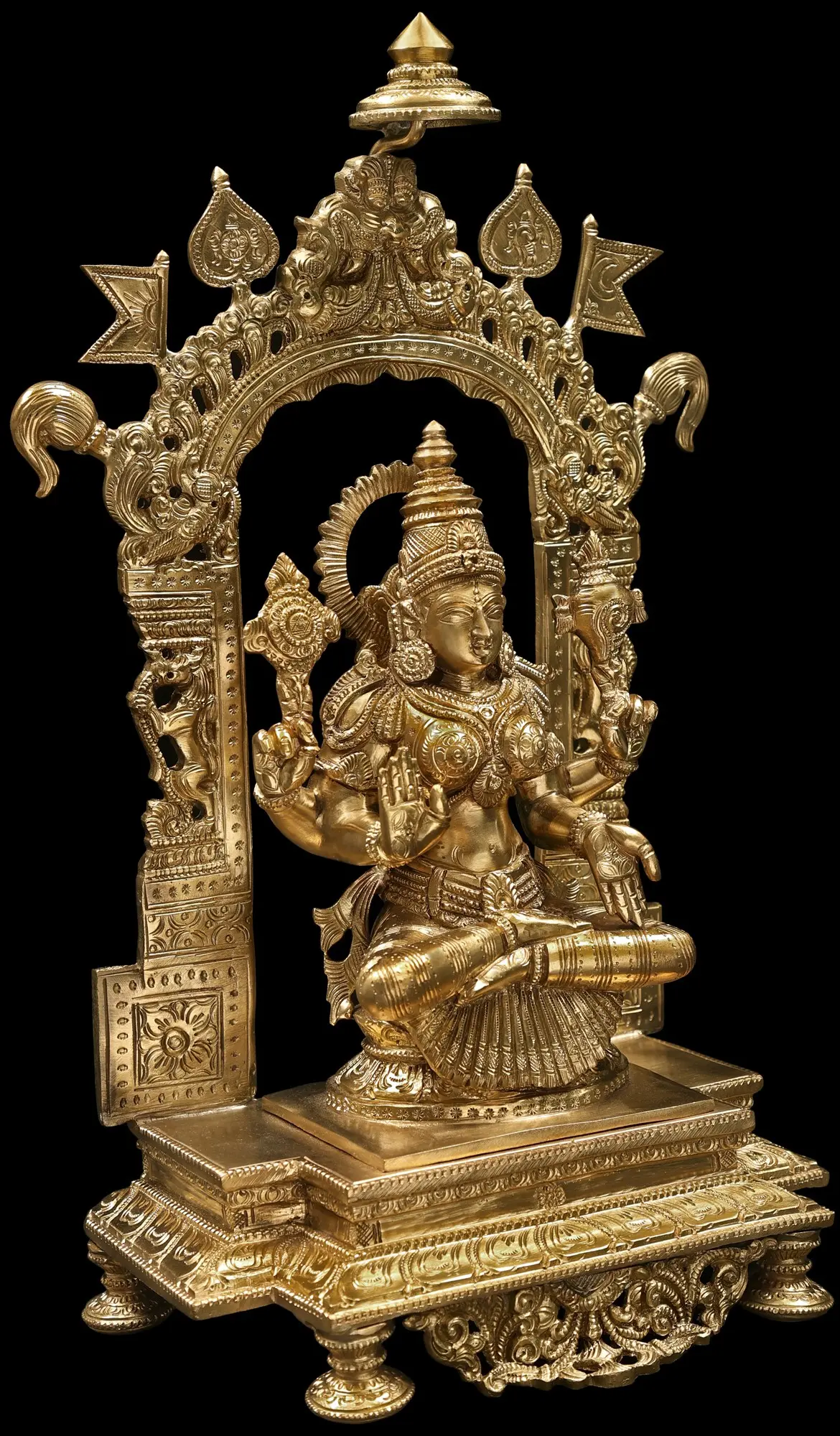 The deity is surrounded by a supremely chiselled Kirtimukha arch, topped with a layered parasol. Two peacocks stand on either side of the arch with the popping symbols inscribed in different patterns towards the top; conch and discuss chiselled in the leaf base represent her weapons that lead to spiritual perfection; shining sun and moon on the settled flags represent the deity’s all-pervasiveness and the fans are symbolic of her divinity and a gesture of her comfort. The pillars on sides are uniquely patterned with floral designs and dots and the arch is sculpted in long petals and coils joined together.