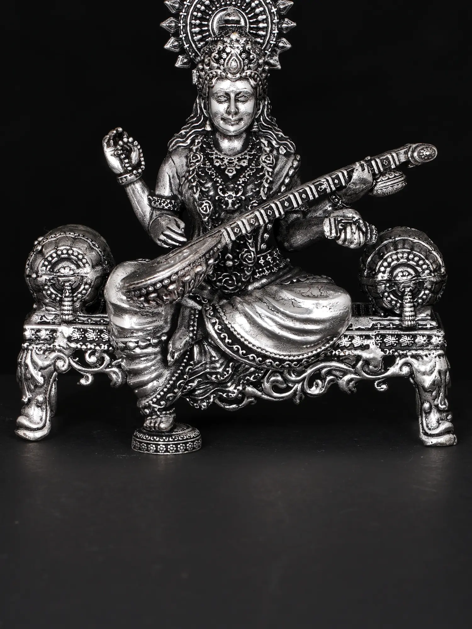Goddess Saraswati, “the possessor of knowledge”, in regal attire, graces her singhasan with divine presence. With grace and elegance, She strums the Veena, her melody weaving the threads of knowledge and creativity. In her upper hand, she holds a rosary, guiding the seekers towards wisdom. The sacred Vedas rest in her left hand, symbolising her role as the patroness of wisdom and learning. This artwork, crafted in brass, captures her serene beauty, inspiring reverence. Worshipping Goddess Saraswati bestows the gift of knowledge, creativity, and eloquence. She empowers minds, nurturing intellects to bloom like the lotus that she adorns, embodying the transcendence of wisdom and the arts.