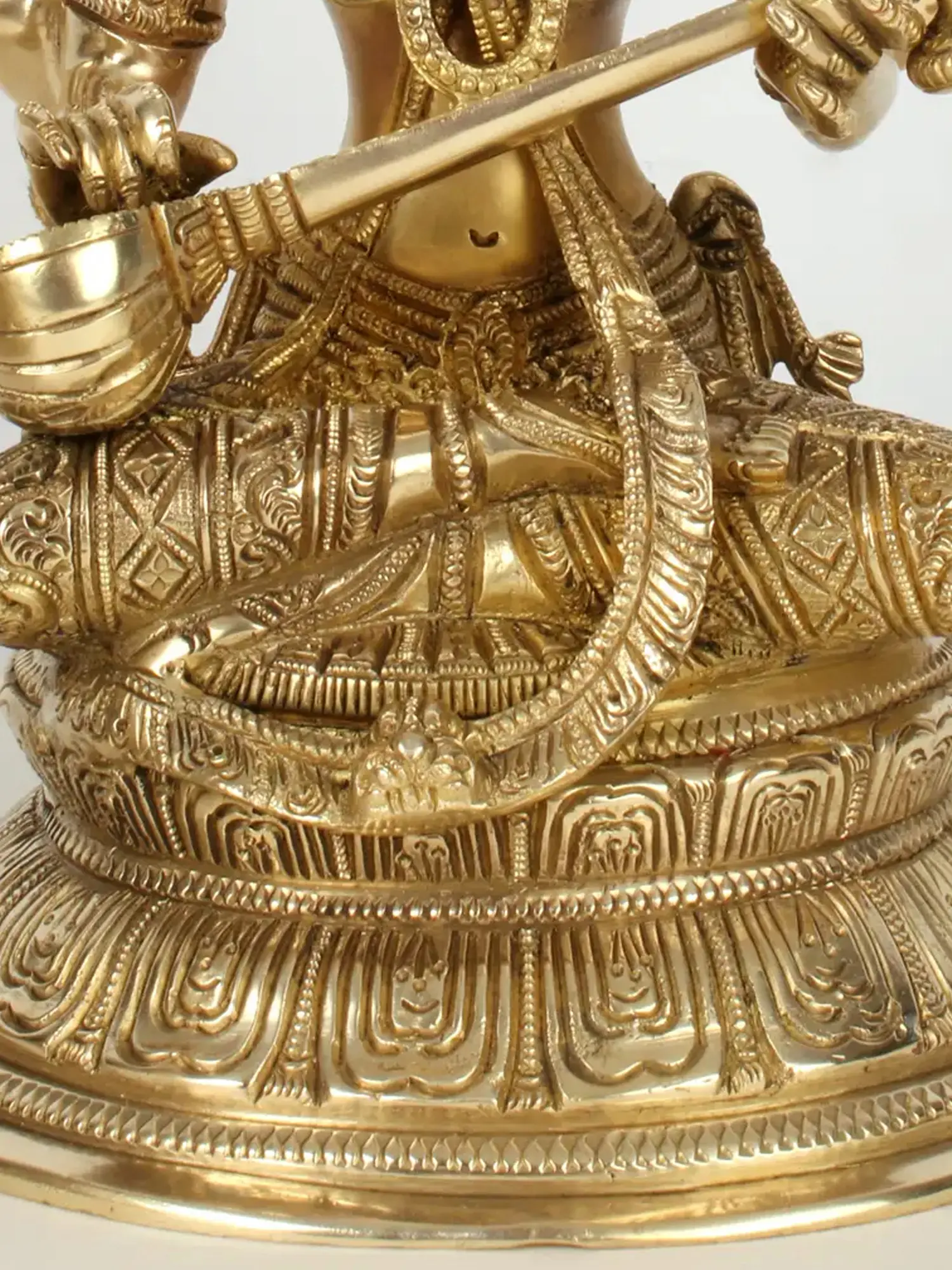 This exquisite set of three brass deities embodies the potent trinity of Lakshmi, Ganesha, and Saraswati, revered as the goddesses of wealth and fortune, the remover of obstacles and wisdom, and the embodiment of knowledge, music, and art, respectively. Crafted from the finest brass, each figurine is a testament to meticulous artistry and spiritual devotion, radiating an aura of divine grace and auspiciousness. The warm, lustrous glow of the brass amplifies the sacred presence of these revered deities, making them a captivating centerpiece for any home, altar, or sacred space. In Hindu tradition, the presence of Lakshmi ensures material and spiritual prosperity, bestowing abundance and good fortune upon her devotees. She is often depicted seated on a lotus, a symbol of purity and spiritual awakening, holding lotuses in her hands, signifying beauty and fertility. Her consort, Lord Vishnu, is the preserver of the universe, and Lakshmi's blessings are considered an essential complement to his divine grace. Ganesha, the elephant-headed deity, is universally invoked at the beginning of any new venture. His wisdom and power are said to clear the path for success, removing hindrances and protecting against misfortune. Legends tell of his intelligence and his ability to overcome even the most formidable challenges, making him the patron of intellect and learning. Saraswati, the goddess of knowledge, music, and the arts, is the source of creativity, eloquence, and wisdom. She is often depicted with the veena, a musical instrument, and a book, symbolizing her mastery over sound and learning. Her blessings are sought by students, artists, musicians, and all who strive for intellectual and creative excellence. Together, these three deities form a powerful confluence of blessings, fostering a holistic environment of prosperity, wisdom, and creative flourishing.