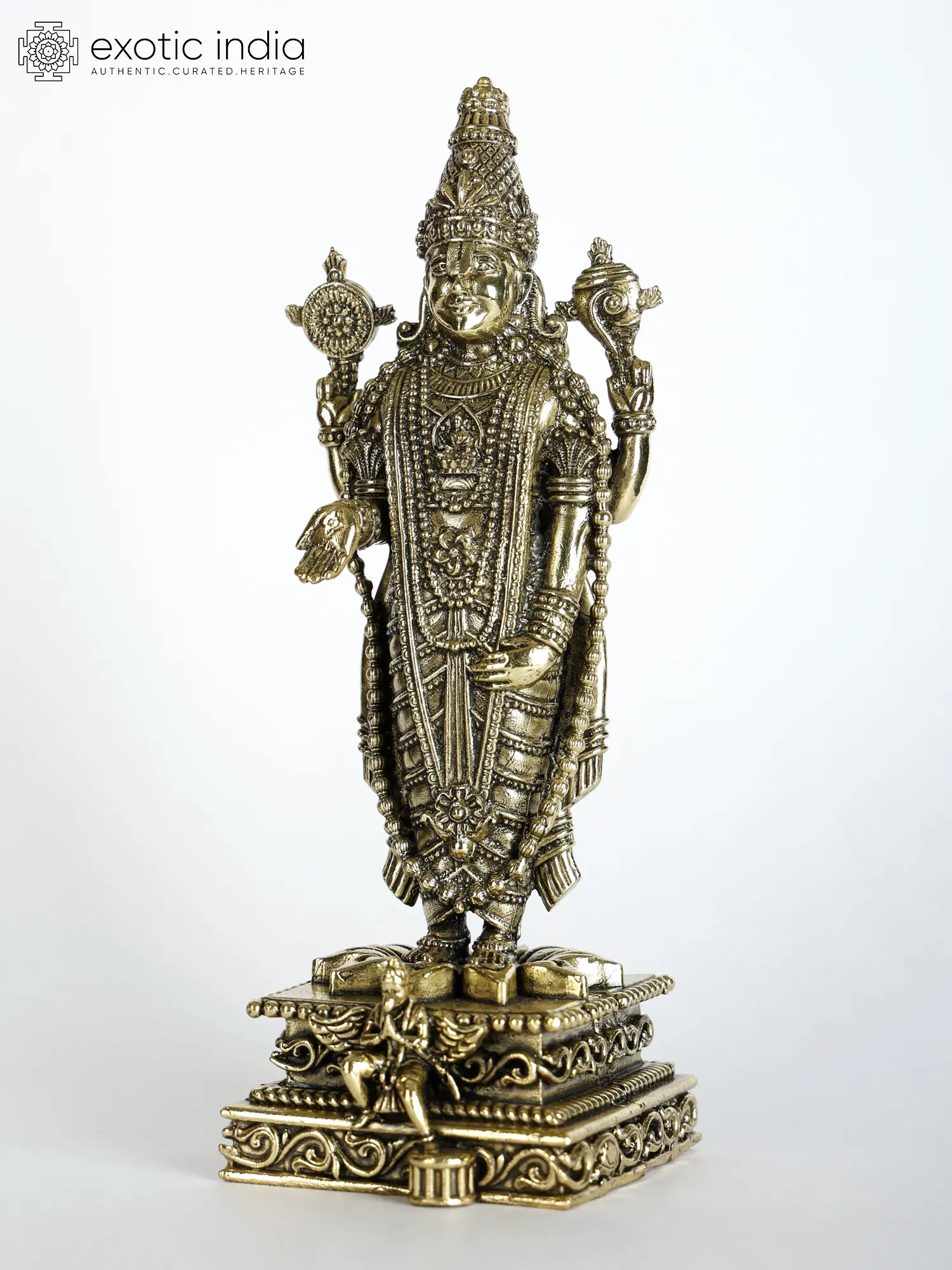 The image of Lakshmi resides in his heart, accompanying her lord as the ideal wife. The dynamic pose of Garuda on the pedestal adds a celestial aura elevating the sanctified presence of Venkateshwara.