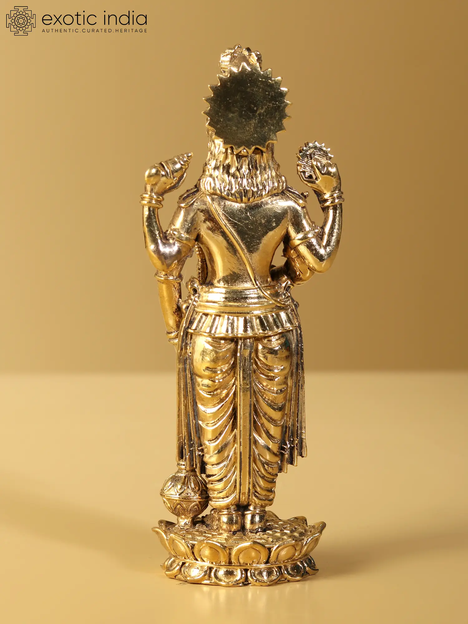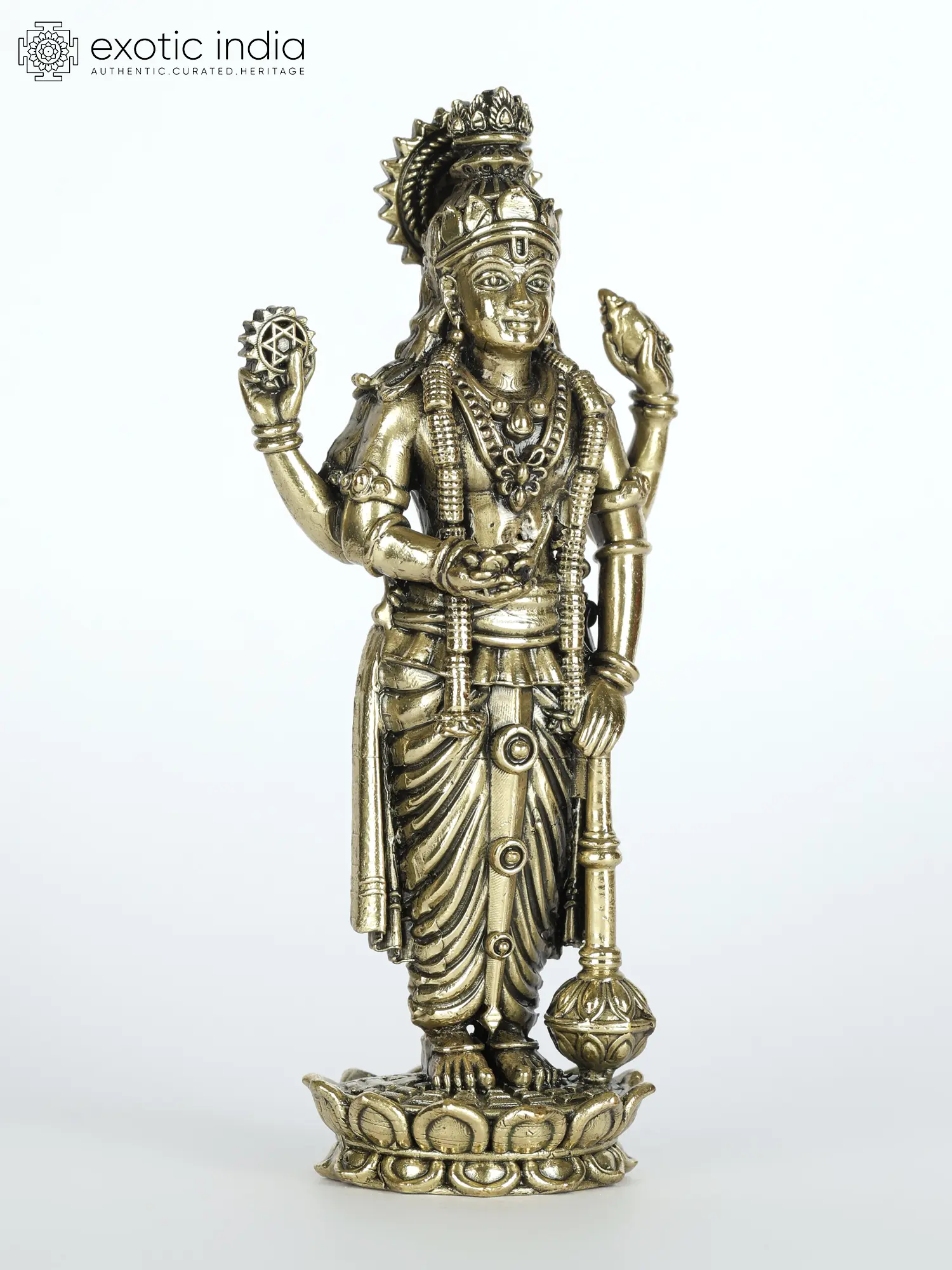 In the cosmic theater of divinity, Lord Vishnu, the preserver and sustainer of the universe, stands ethereally on a blooming lotus, a vision of sublime grace. His upper hands cradle the “Panchajanya”, a celestial Conch Shell, and the Discus named “Sudarshan”, resonating power and cosmic order. A Lotus rests delicately in his lower right hand, while the left wields the formidable Mace named “Kaumodaki”. Bedecked in regal attire, Vishnu, is adorned with the Kaustubha gem, a beacon of spiritual splendor, and a Vaijayanti garland weaves the fragrance of forest blooms.