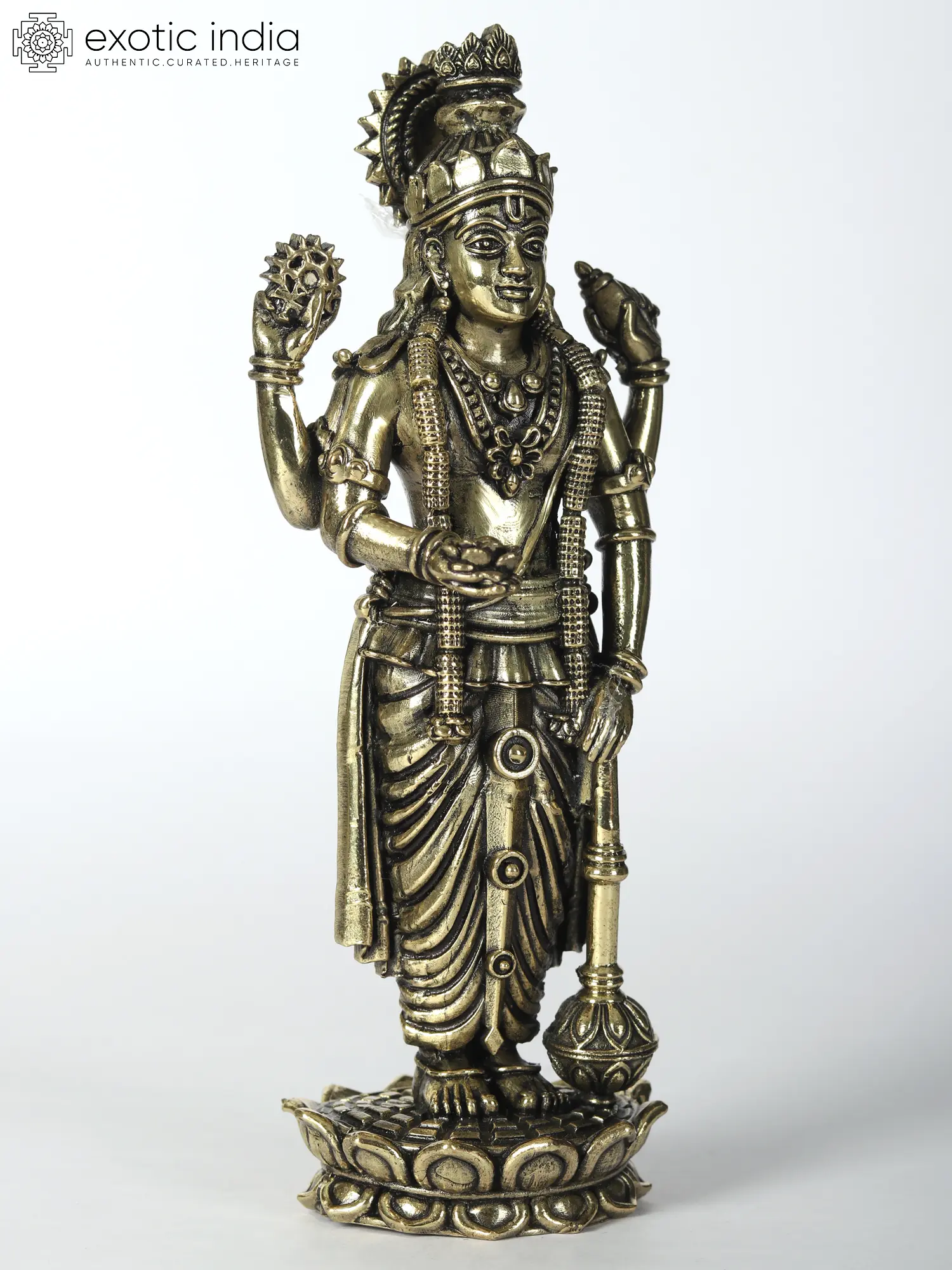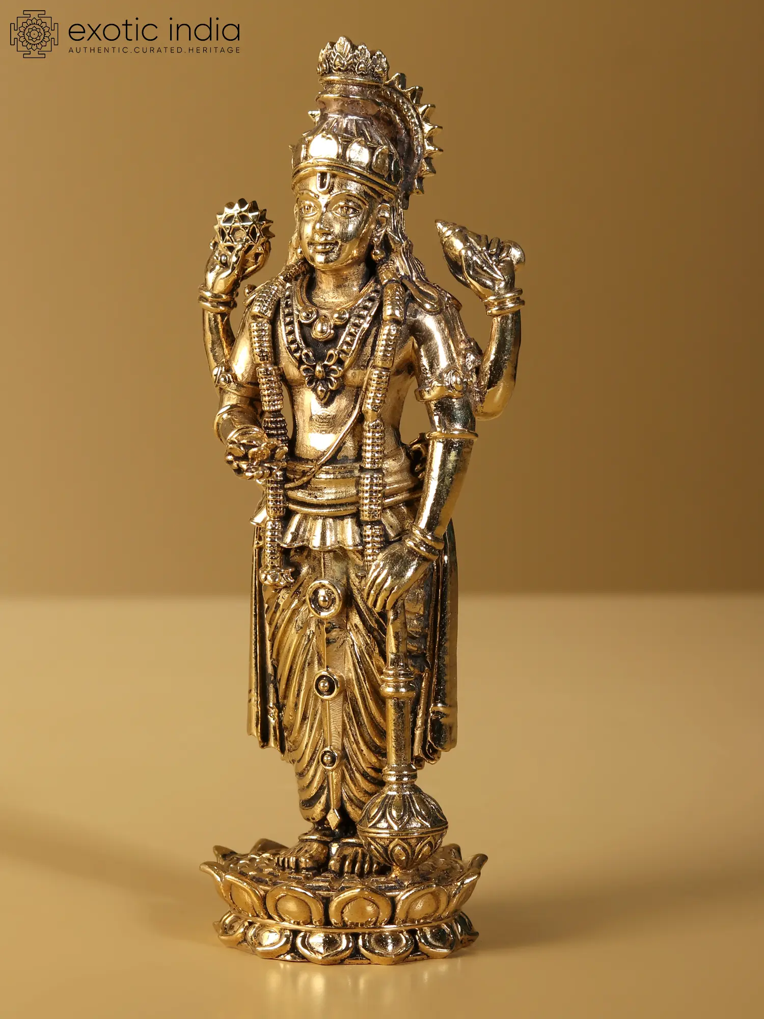 In the cosmic theater of divinity, Lord Vishnu, the preserver and sustainer of the universe, stands ethereally on a blooming lotus, a vision of sublime grace. His upper hands cradle the “Panchajanya”, a celestial Conch Shell, and the Discus named “Sudarshan”, resonating power and cosmic order. A Lotus rests delicately in his lower right hand, while the left wields the formidable Mace named “Kaumodaki”. Bedecked in regal attire, Vishnu, is adorned with the Kaustubha gem, a beacon of spiritual splendor, and a Vaijayanti garland weaves the fragrance of forest blooms.