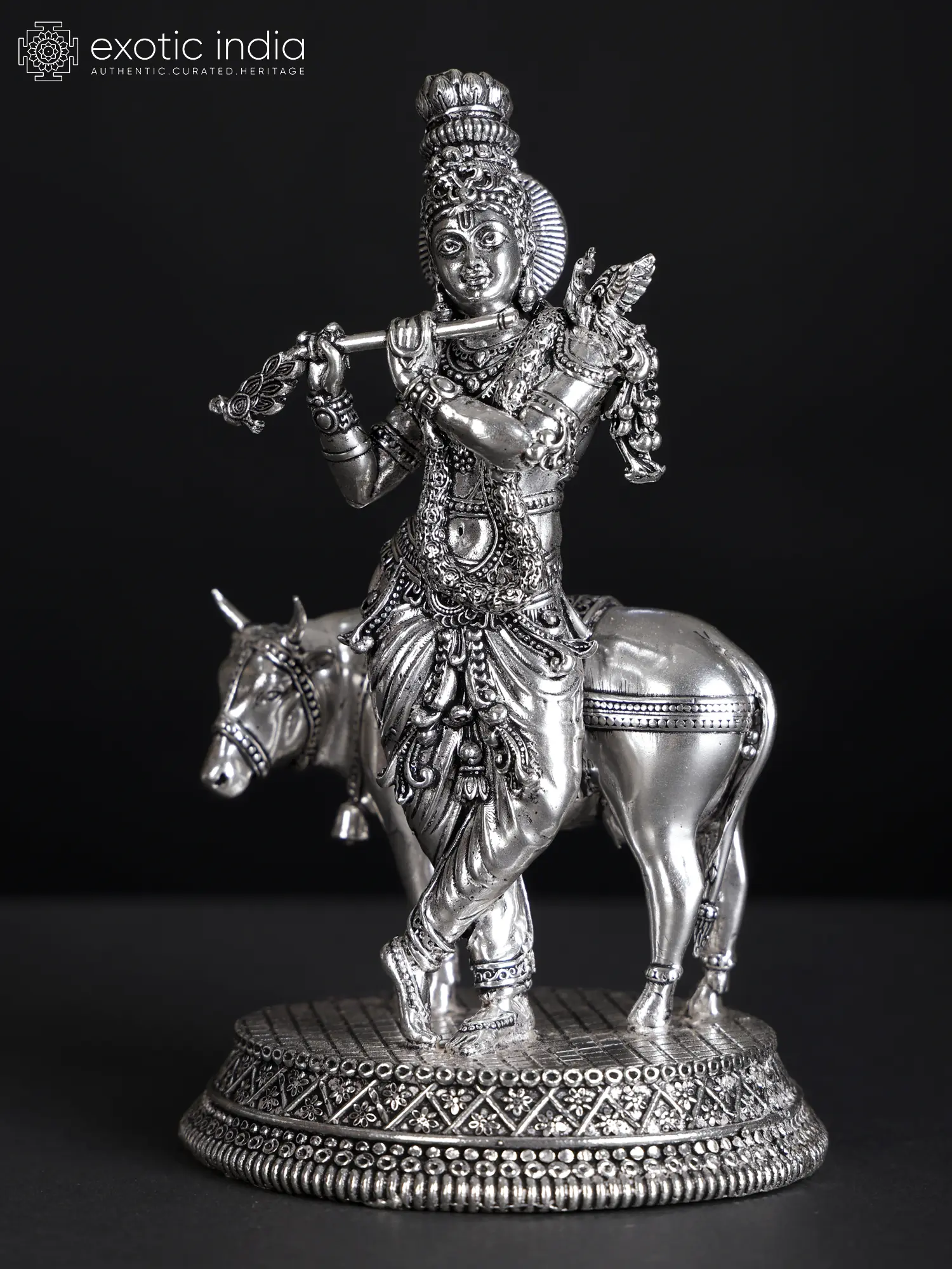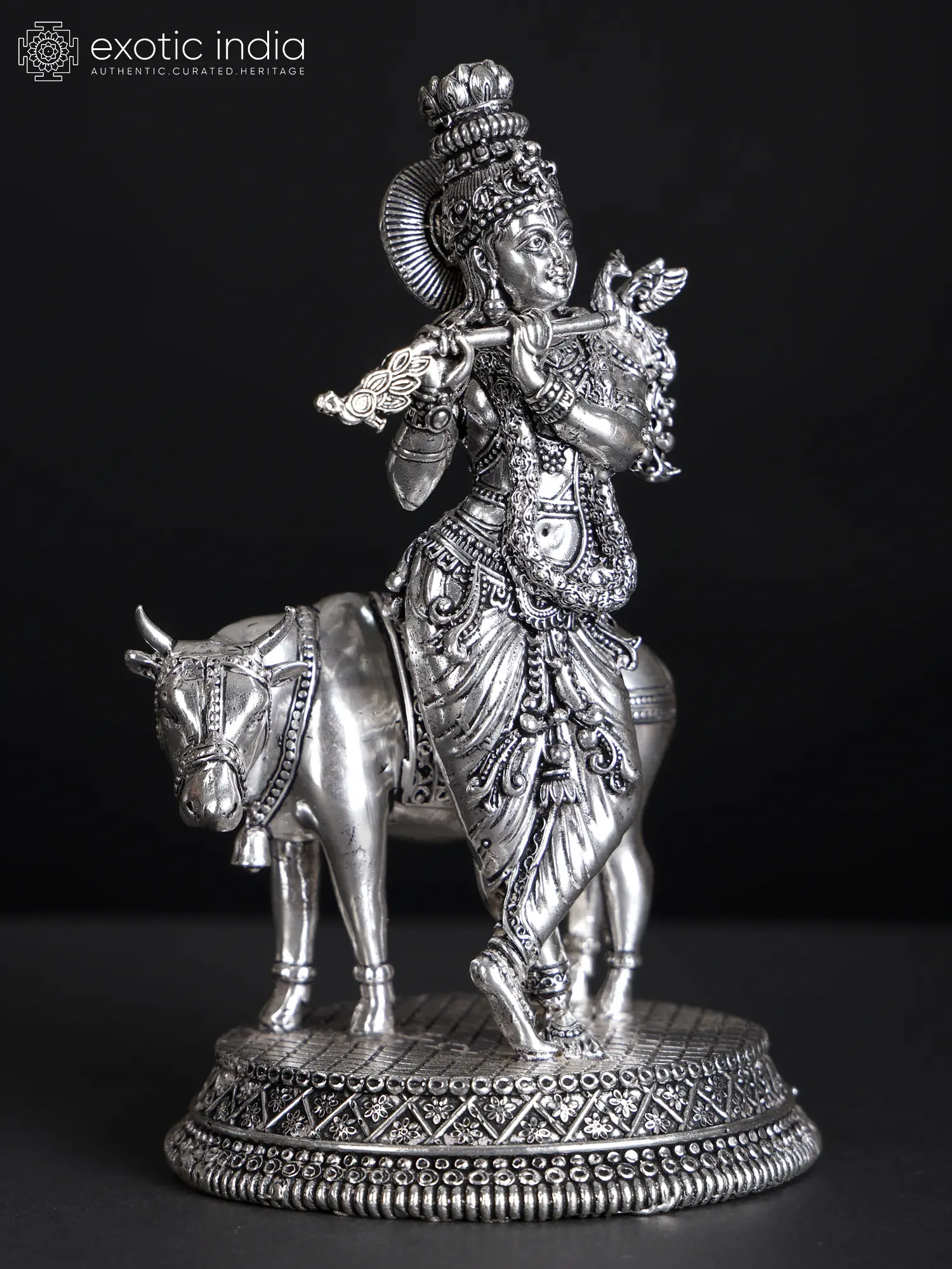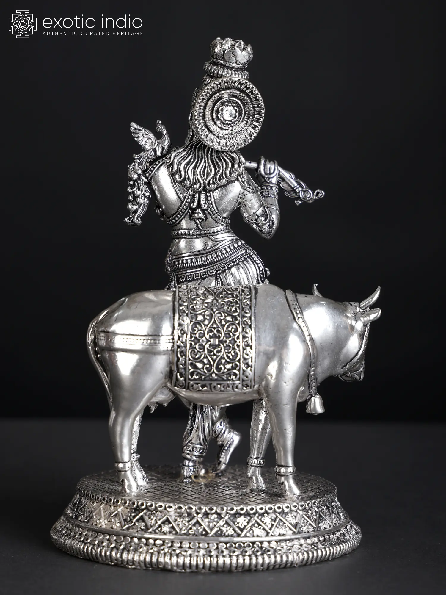 Krishna is accompanied by Gau Mata, who stands behind him on the pedestal, and a Mayura, perched on his shoulder- a symbol of beauty and romance that finds nourishment in the sweetness of Krishna’s Murli.