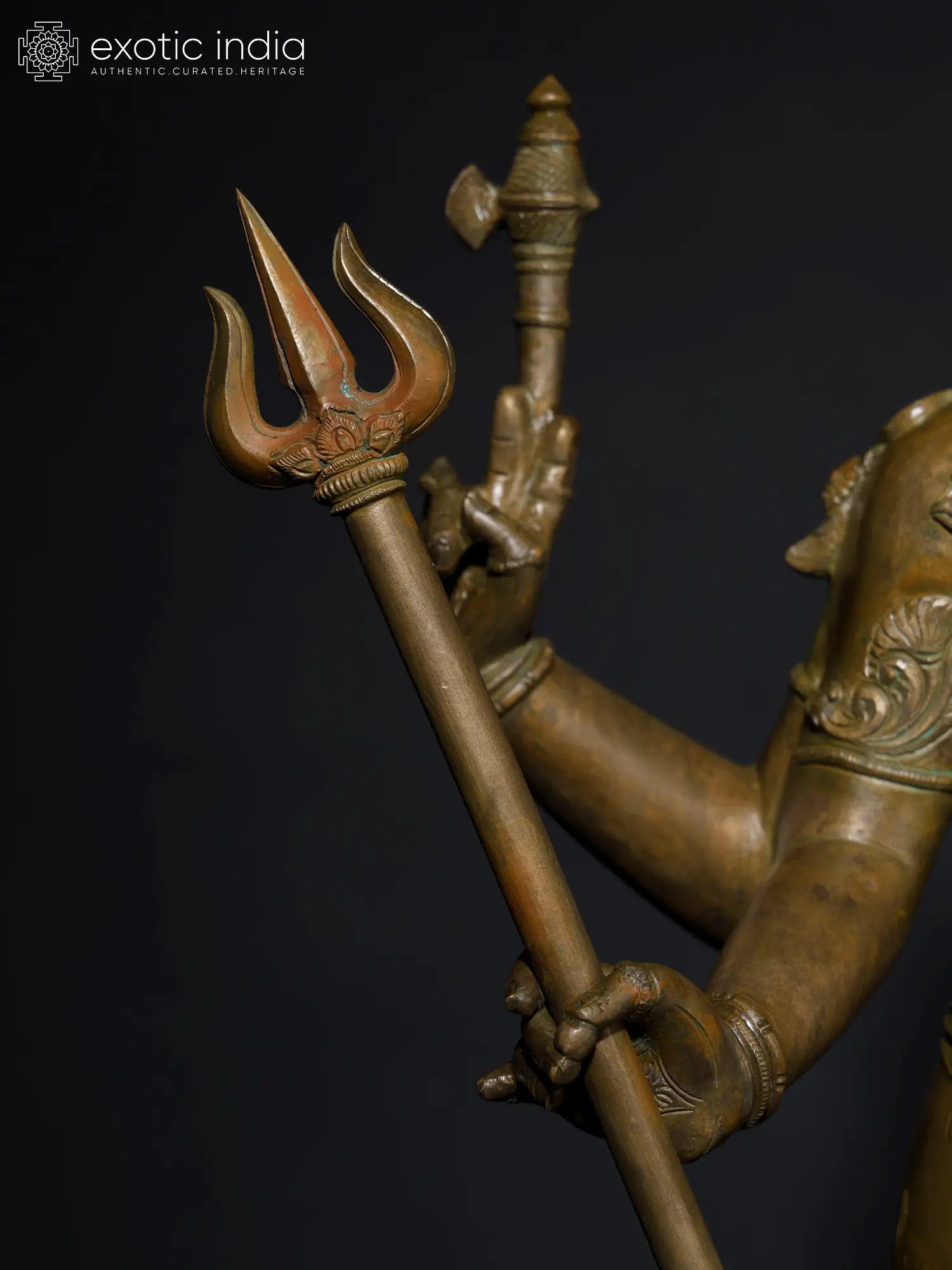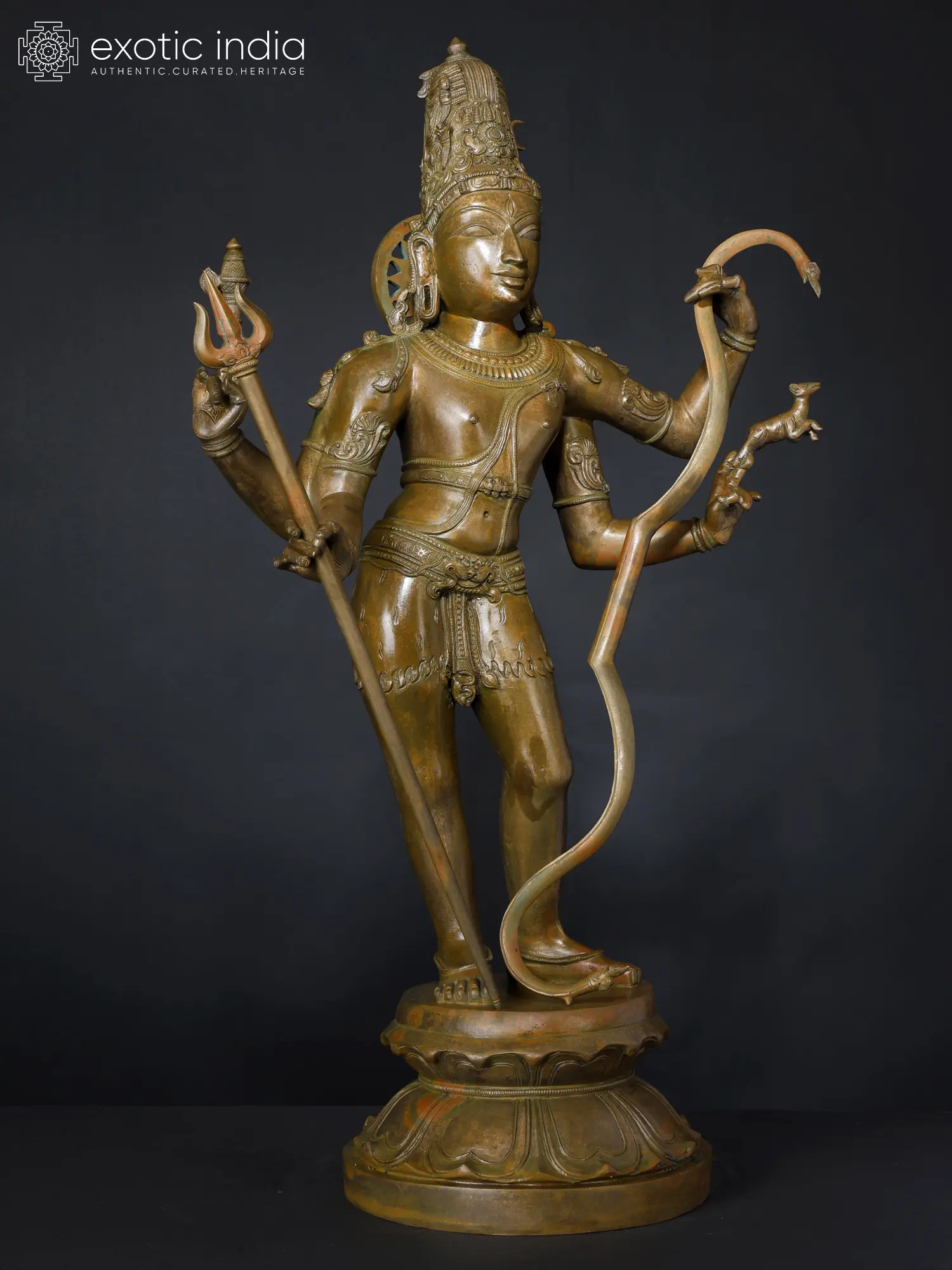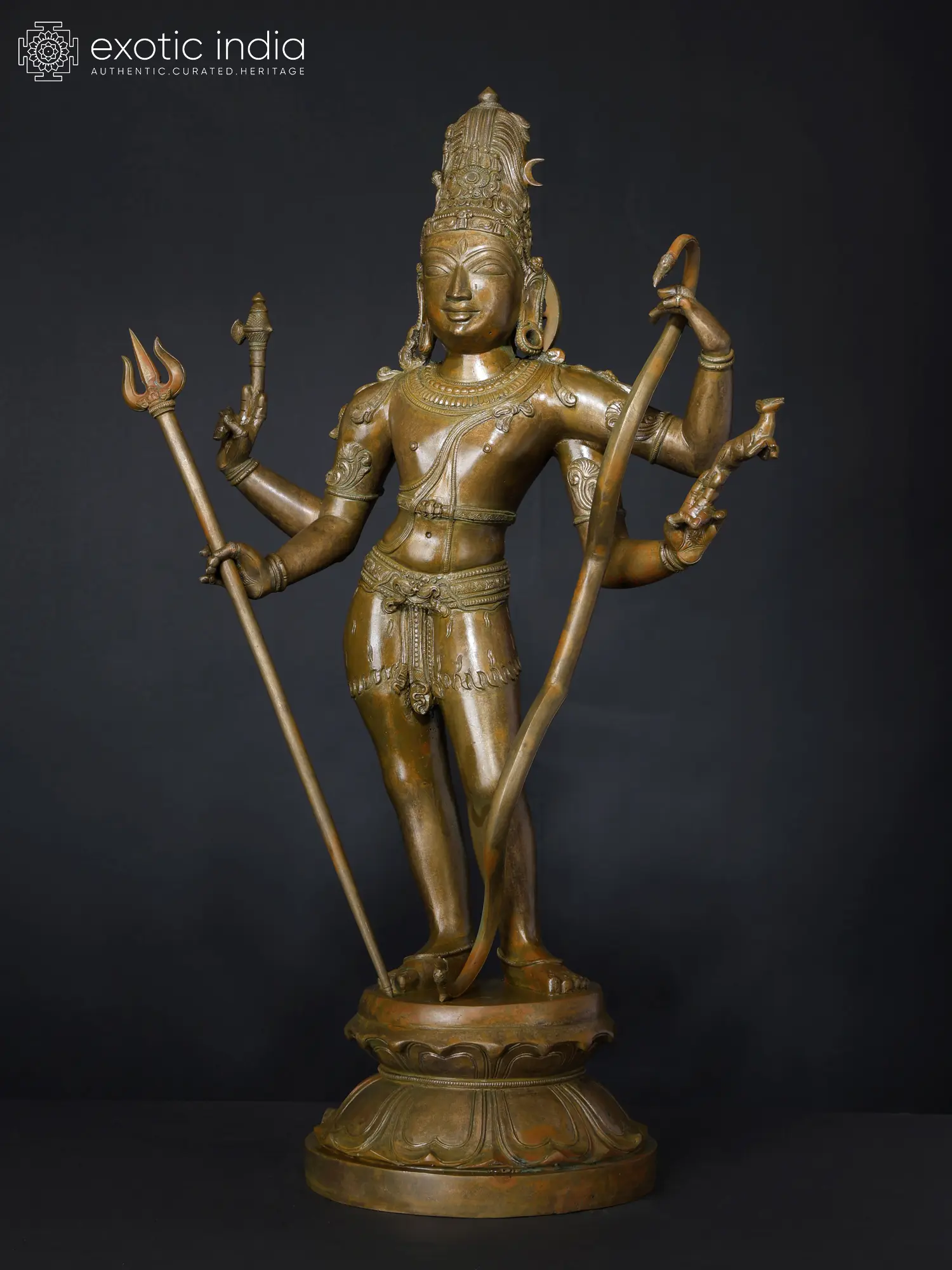 The Pinaka-Dhara or Pinaka-Hasta Roopa of Shiva is presented in this rare, marvelous bronze statue. In addition to the legendary Pinaka bow, popularly known as “Shiva-Dhanusha”, Shiva carries Ankusha (goad), and Pashu (the antelope, a symbol of soul)- attributes associated with his other Vedic form- Pashupati, and the Trishula, the most powerful weapon and universal symbol of Shiva.