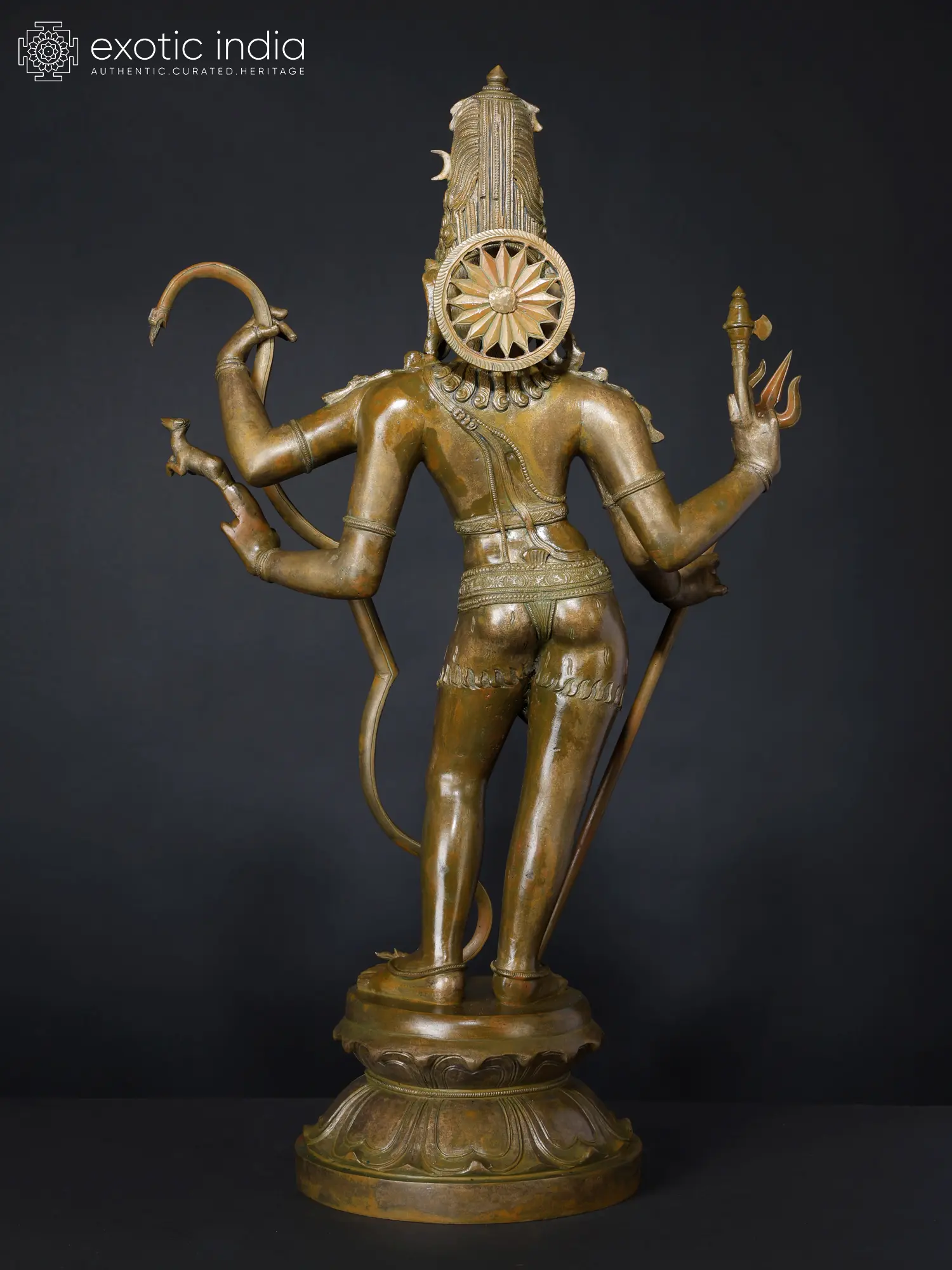 The elaborate Jatamukuta, dual-earrings, Yajnopavita, and tiger skin lower body garment adorn Shiva’s heavenly body. the perfection of the sculptor and sculpture is hidden at the reverse, with meticulous delineation of the strands of Shiva’s Jata, curls falling on his shoulder, and the Siraschakra.