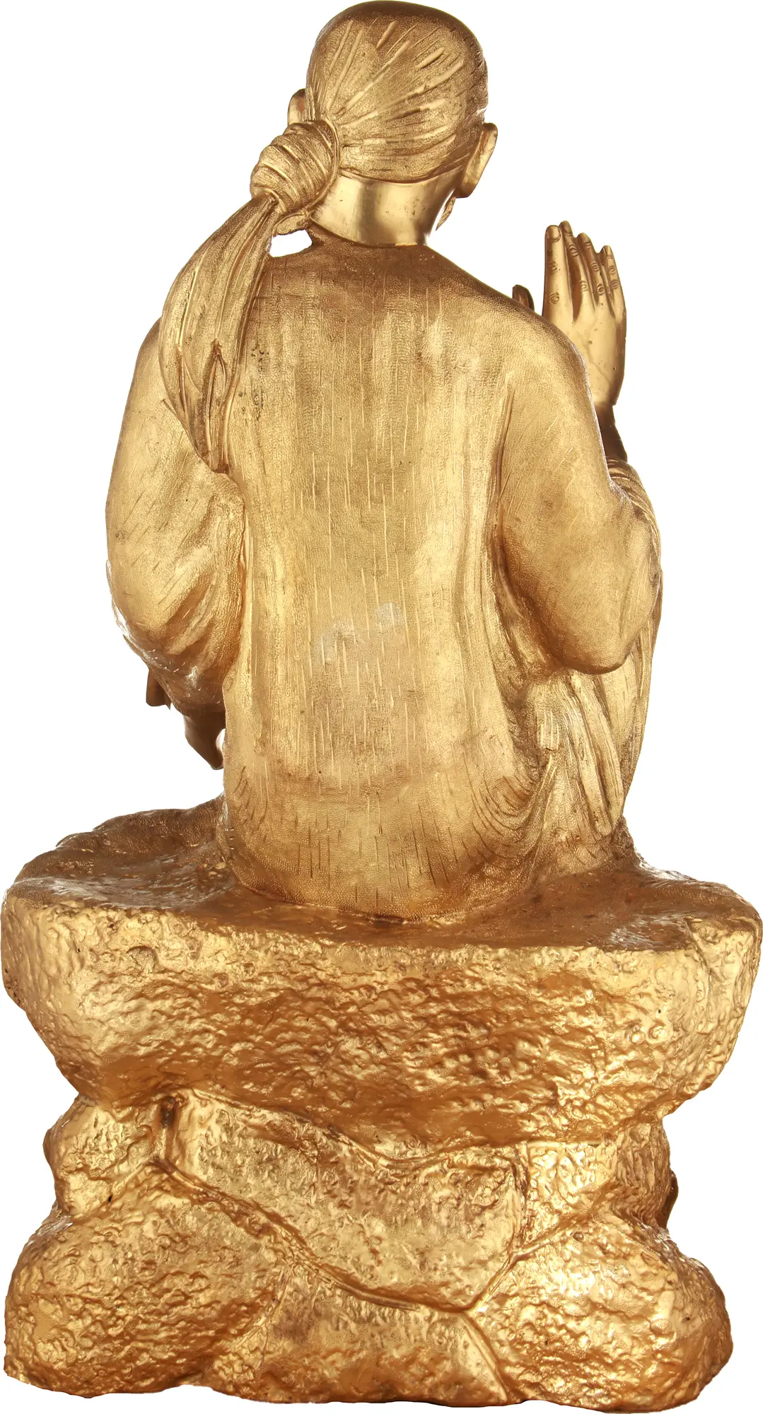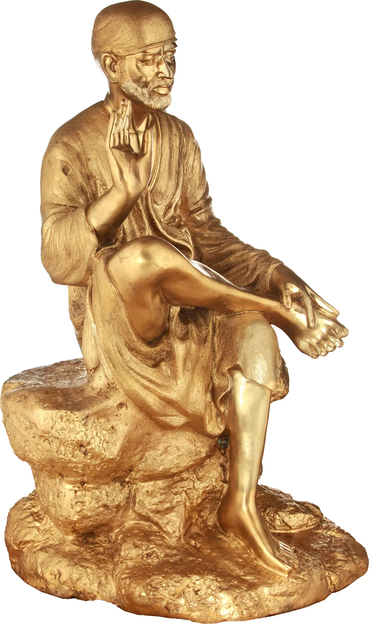 The masterful craftsmanship evident in this statue reflects the rich artistic heritage of South India, particularly Bangalore, known for its skilled metalworkers. The delicate rendering of Sai Baba's flowing robes, the gentle smile that graces his lips, and the profound wisdom in his eyes are all brought to life through the timeless medium of bronze. The naturalistic depiction of the rock formation upon which he is seated grounds the divine figure, symbolizing his humility and connection to the earth, even as his spirit transcends earthly bounds. This statue serves as a powerful focal point for meditation, prayer, and quiet contemplation, inviting a sense of divine connection into any space it adorns.