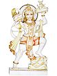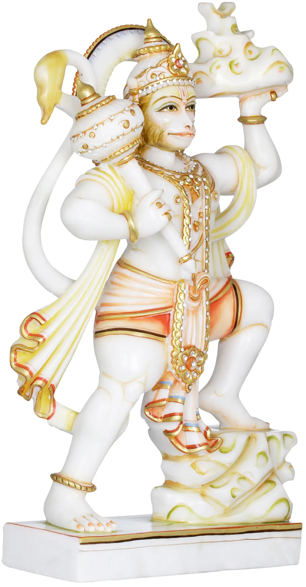 This sculpture clearly justifies the name Bajrangbali as he is shown with boasted chest and holds the Sanjeevani mountain with his left hand to revive Laxman Ji by its powerful herbs. Structure of Sanjeevani Mountain is very artistically designed with a combination of green and yellow color to highlight the herbs on it. He is wearing a vermilion (sindoori) colored dhoti and superfine jewels are adorned on his body and clothes. Sindoori color is symbolic of long life and wealth of the loved one, so Hanuman Ji also wore it for his Lord Rama. He is holds a comely patterned gada in his left hand. The long tail going upwards has a combination of yellow at the top which pleasantly matches with the same combination stole on his shoulders. He is standing on a rectangular pedestal and left leg is on the remaining uncut mountain piece. The temple shaped crown has a heavenly appearance. Facial expressions and golden brown hair on the face are mesmerizing. Generic briefings add to the beauty and worthiness of the statue.