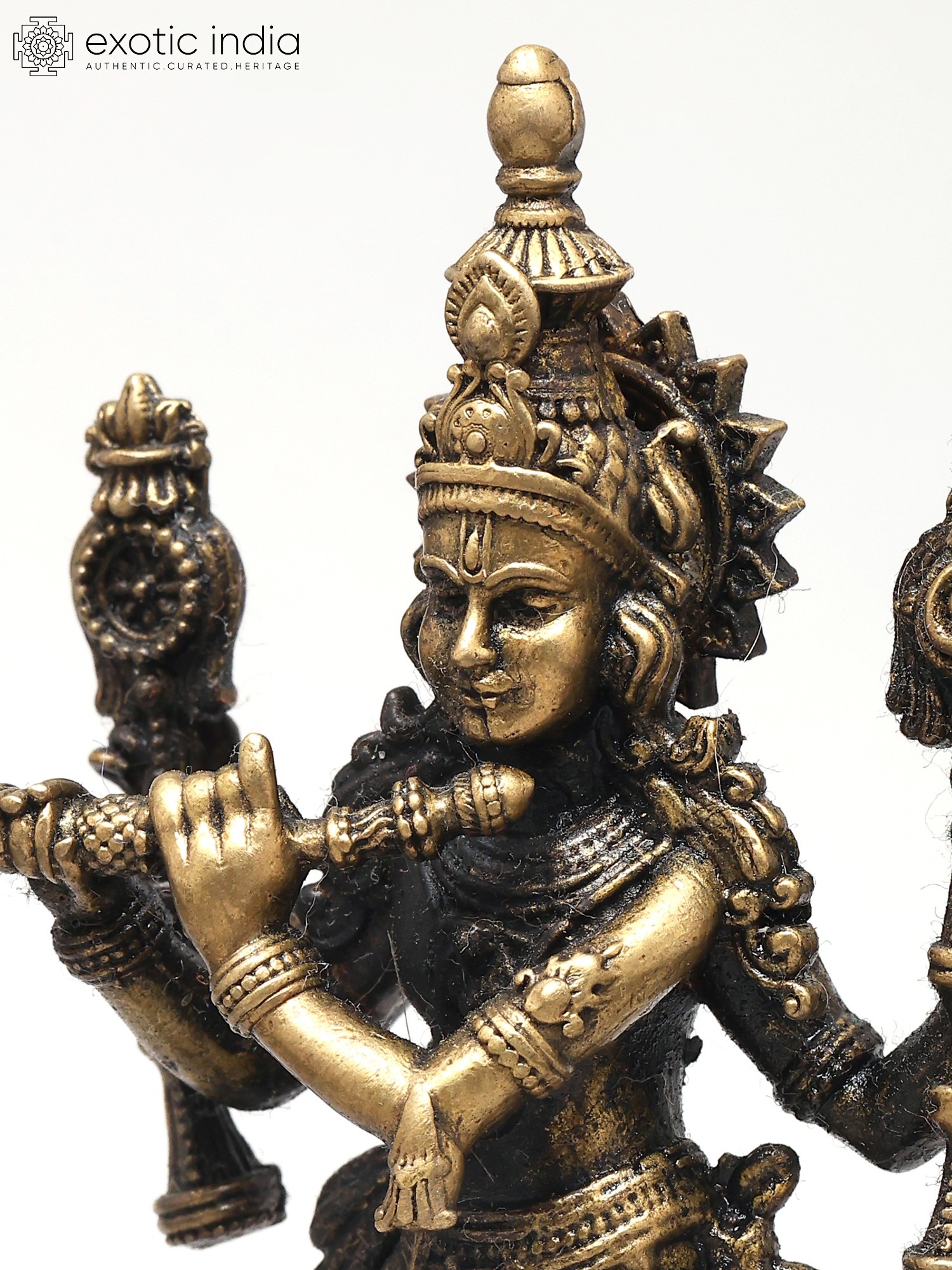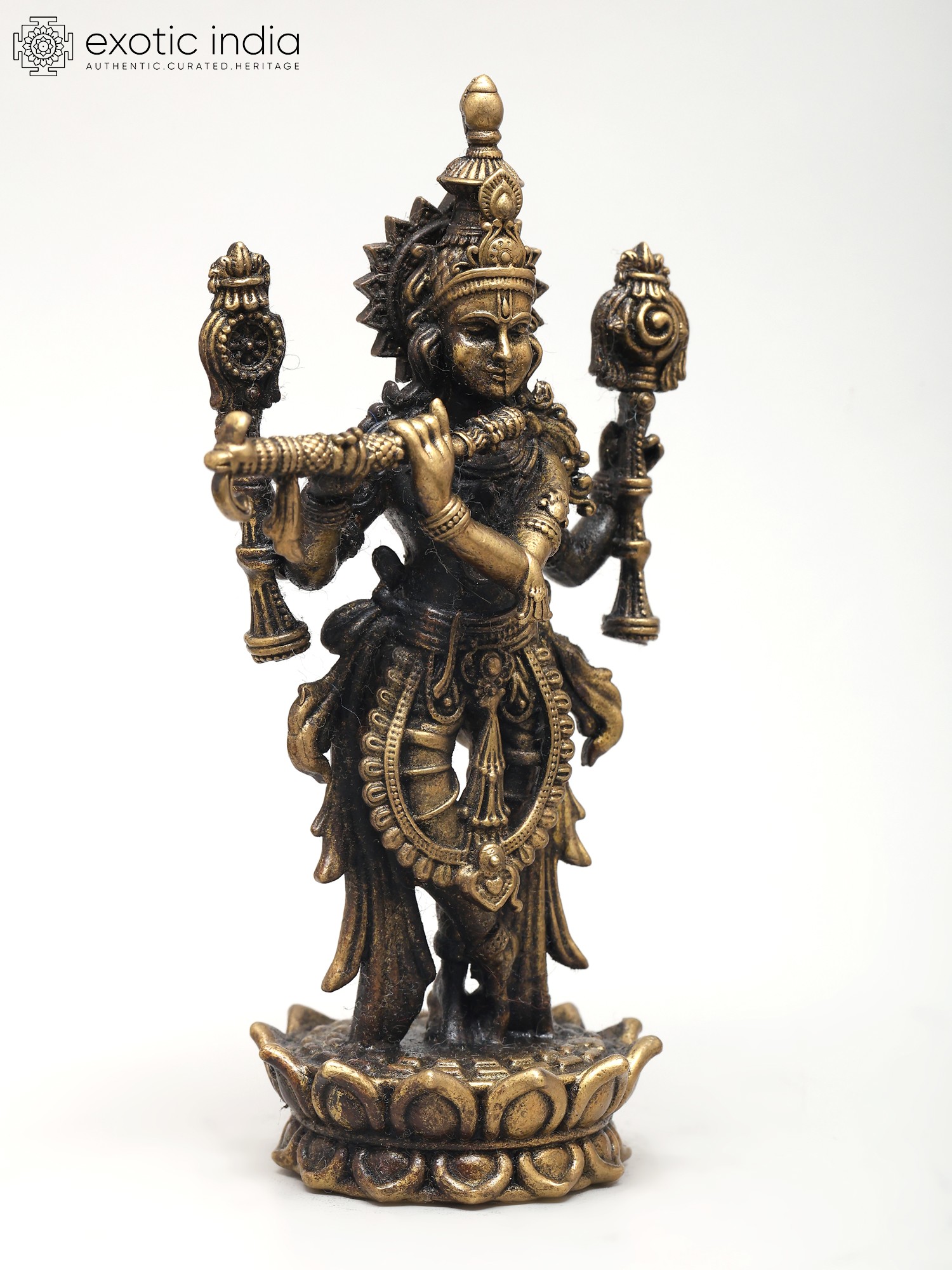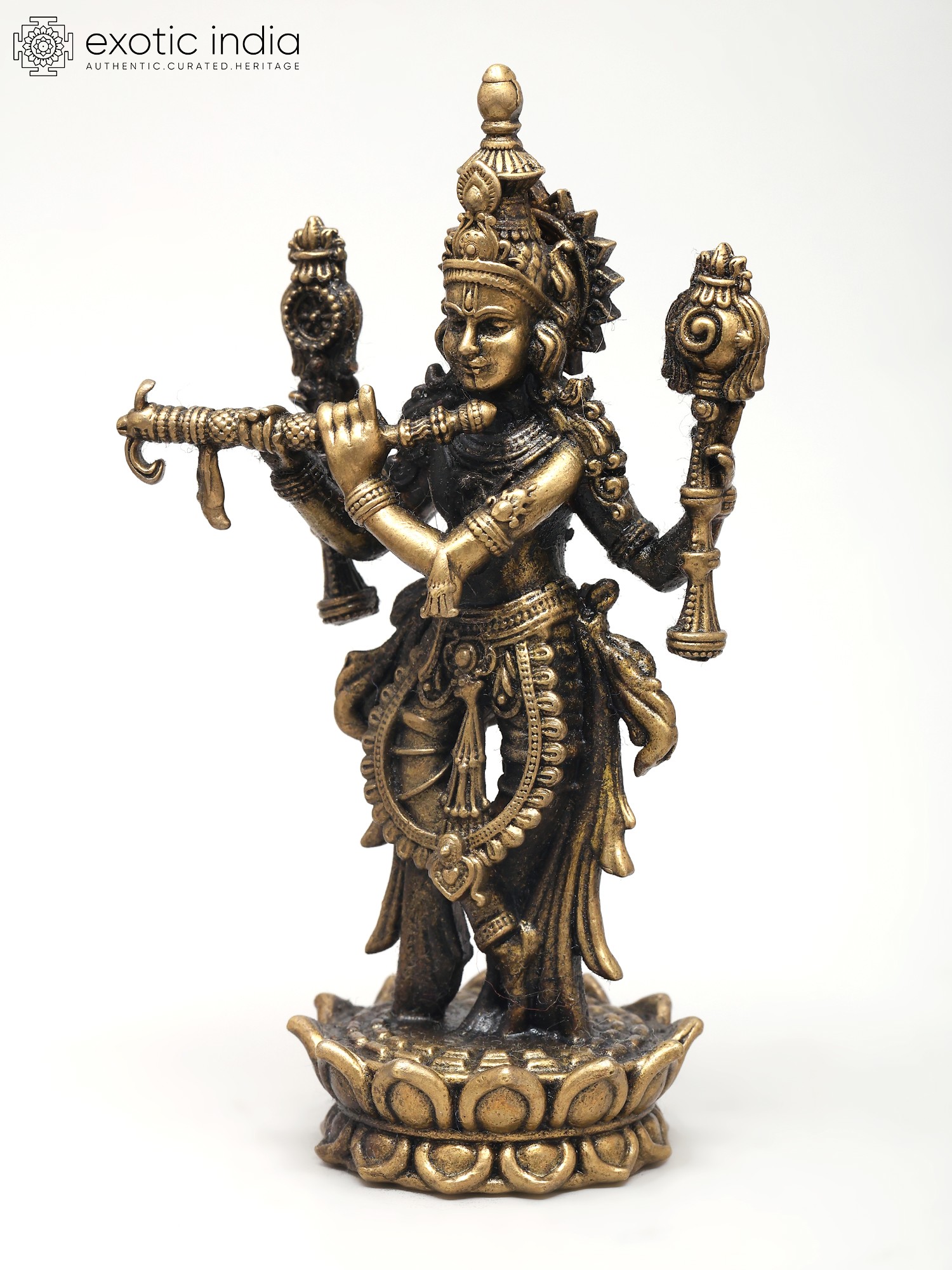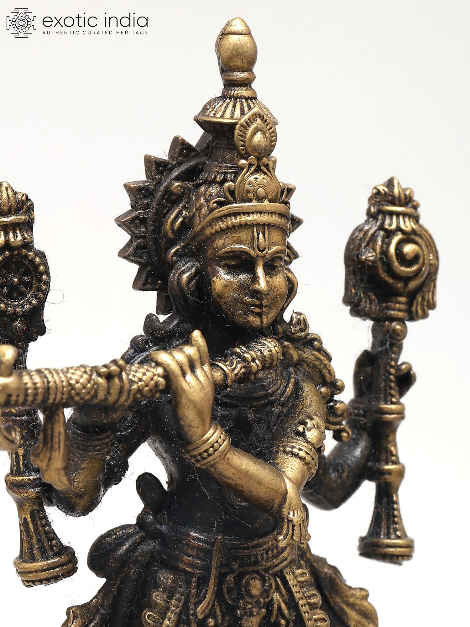 4" Small Brass Lord Krishna Playing Flute with Cow